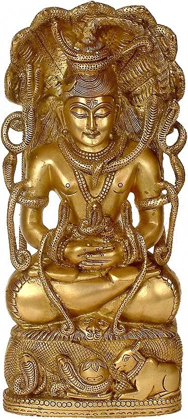 This exquisite brass statue captures the divine essence of Lord Shiva, the destroyer and transformer, in a posture of serene meditation. The deity is depicted seated in a meditative pose, radiating an aura of profound peace and immense power. The intricate craftsmanship of this piece highlights the multifaceted nature of Shiva, a deity revered across diverse traditions of Hinduism. The artist has masterfully rendered the serene yet powerful visage of Shiva, with eyes closed in contemplation and a gentle smile gracing his lips, suggesting an inward journey of cosmic understanding.