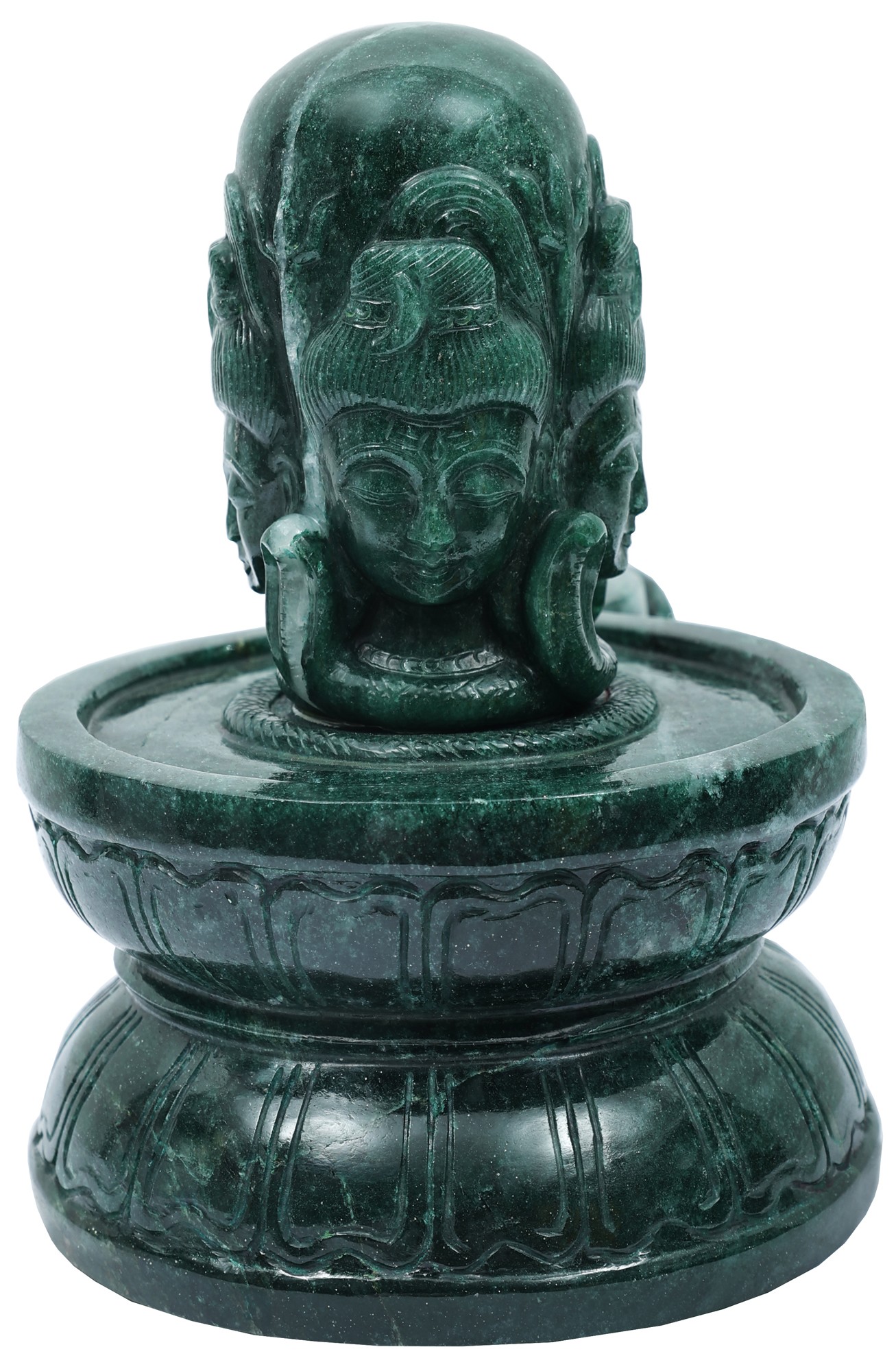When creation began to happen, the first ’form’ that it took was that of a Linga, hence ‘linga’ means ‘the form’. Mukhalinga, as the name says, means linga with a face; carved here in the visible four faces in all four cardinal directions and the fifth, invisible one, faces upwards emerging from the top of the shaft. A pancha-mukhalinga (linga with five faces of Shiva) represents Shiva’s five aspects- Mahadeva (east face), Uma (north face-face of Parvati), fire (south face), Nandi (west face) and Sadashiva (top face) and this icon of these five aspects represents the entire universe. This jade aventurine carved Mukhalinga is a visible form of the mantra ‘namaha Shivaya’, where the five syllables of this mantra embody the five elements- air, water, fire, ether and earth.