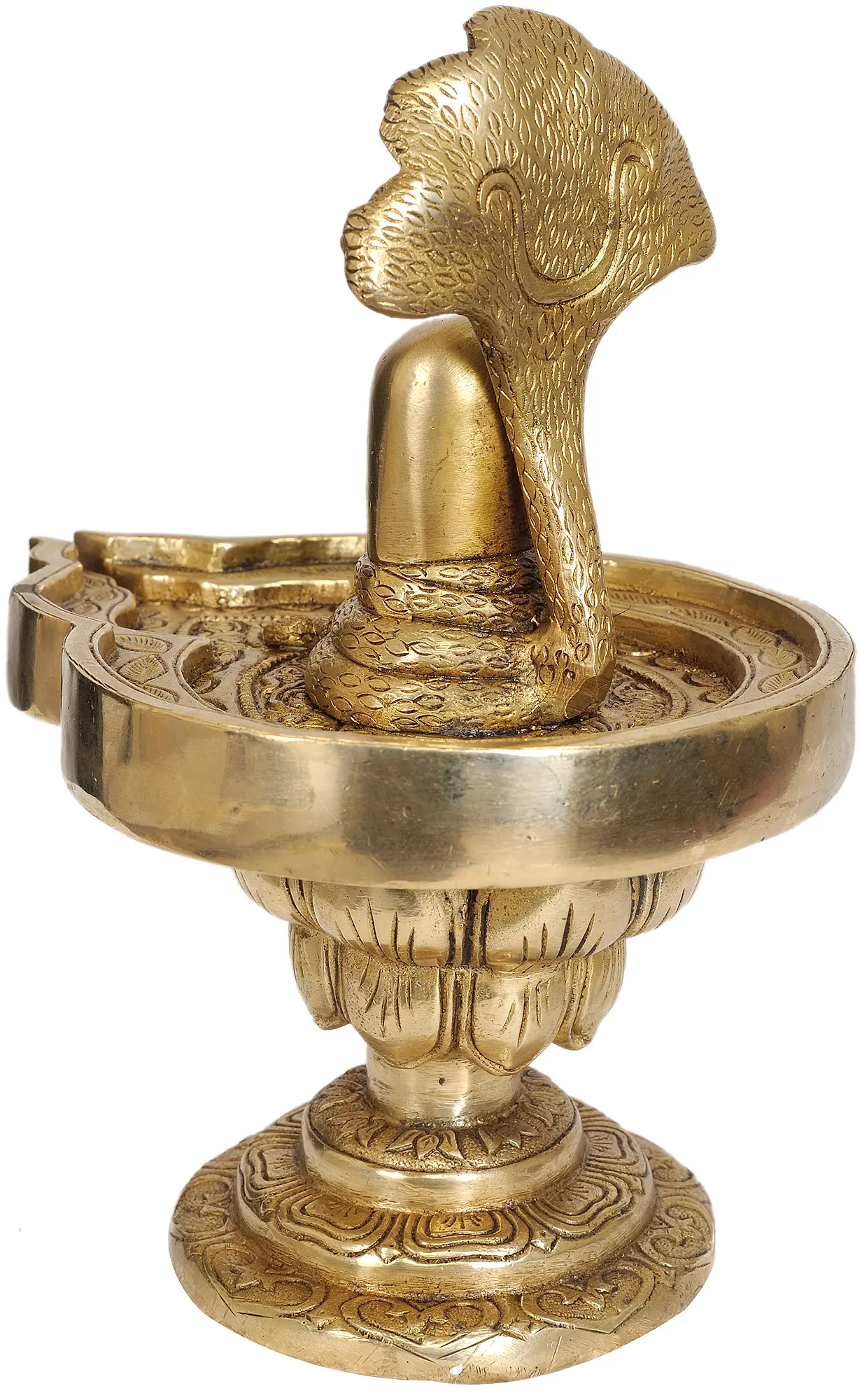 Meticulously crafted from high-quality brass, this statue possesses a timeless elegance and a warm, inviting glow. The polished brass catches the light, highlighting the fine details of the craftsmanship, from the delicate scales of the cobra to the subtle engravings on the Linga and its ornate platform. The craftsmanship speaks to the skill of the artisans, who have poured their devotion into creating this sacred object. This piece is not merely a decorative item; it is a conduit for spiritual connection, a focal point for meditation, and a beautiful representation of profound philosophical concepts. Whether placed in a place of worship, a meditation space, or as a statement piece in your home, this Shiva Linga with its crowned cobra is a powerful reminder of the divine presence and the eternal cycle of life.
