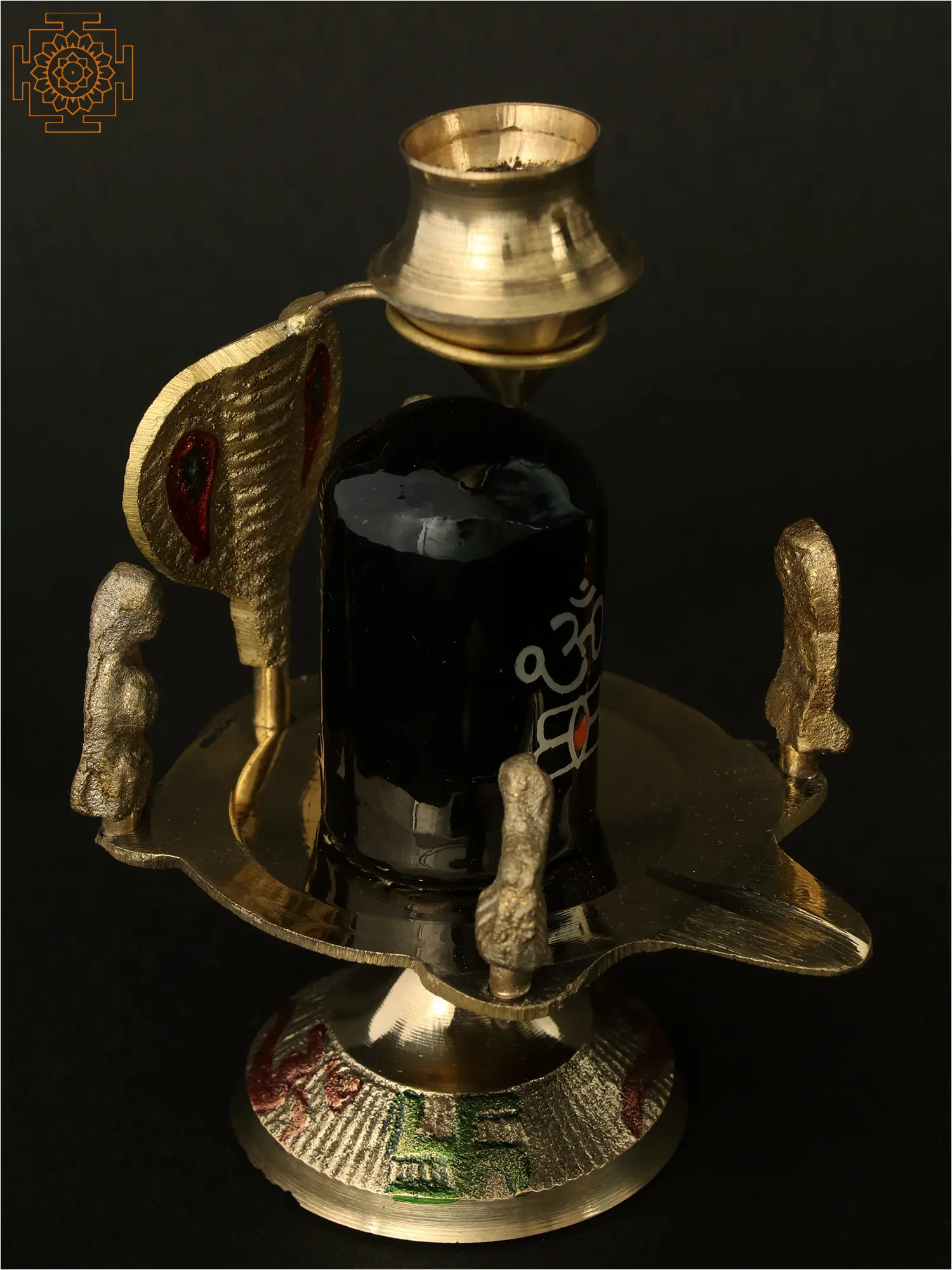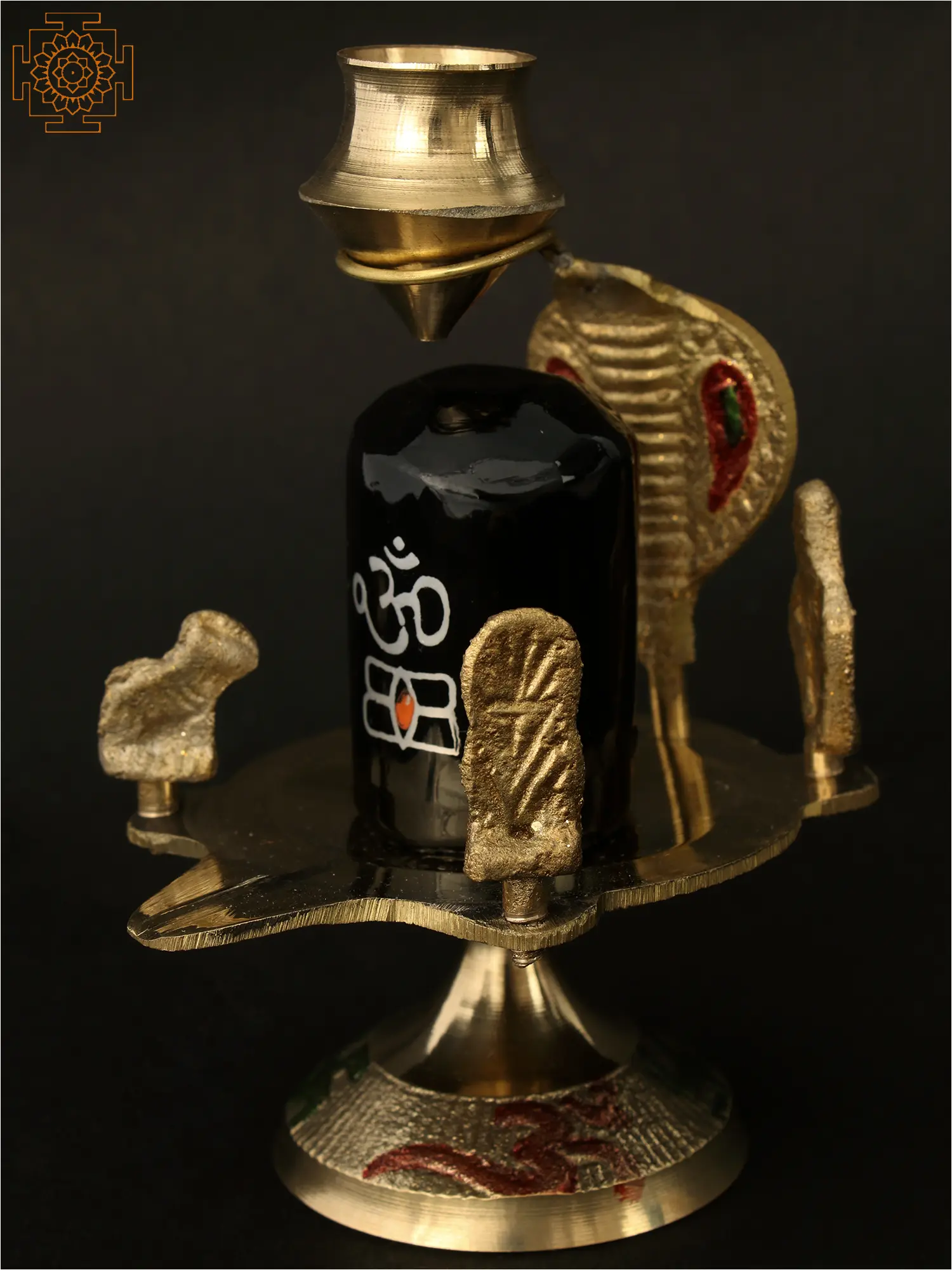 This exquisite brass and stone representation captures the profound essence of Lord Shiva, the supreme deity of Hinduism. At its heart lies the sacred Shiva Lingam, fashioned from lustrous black stone, a powerful symbol of the formless, all-pervading divine energy. The Lingam, often depicted as the cosmic pillar of creation, represents the union of the masculine and feminine principles and the infinite nature of the universe. Its smooth, dark surface is adorned with the sacred syllable "Om" in white, and a stylized representation of the third eye in orange, signifying wisdom and destruction of ignorance. The entire ensemble is supported by a beautifully crafted brass pedestal, intricately detailed and reflecting the celestial energies. Guarding the Lingam, a magnificent brass serpent, Shesha Naga, coils protectively. In Hindu mythology, Shesha Naga is the king of all serpents and serves as the couch upon which Lord Vishnu rests. It is also believed to hold the universe on its hoods, symbolizing cosmic energy and eternity. The serpent's hood is raised, adorned with striking red and green accents, adding a vibrant touch to the divine scene. Flanking the Lingam, two smaller brass figures stand in reverence. These figures evoke the devotional posture of Shiva's devotees, perhaps representing the celestial beings who constantly meditate upon and worship the Lord. The presence of the Trishul, Shiva's divine trident, is subtly integrated, signifying his power to destroy evil, protect righteousness, and transform the universe. The trident also represents the three gunas – sattva, rajas, and tamas – which influence all creation. Crowning the composition is a brass kalash or pot, often associated with auspiciousness, prosperity, and the containment of divine essence. This piece is more than just an idol; it is a conduit for spiritual connection. The Shiva Lingam is worshipped for strength, prosperity, and liberation. In ancient traditions, it was believed that worshipping the Lingam with devotion could grant wishes and bring about spiritual growth. The combination of the black stone Lingam, the protective serpent, and the symbolic Trishul creates a powerful statement of divine power and cosmic balance. This artifact serves as a timeless reminder of the transformative force of Lord Shiva, inviting peace, protection, and spiritual awakening into your sacred space.