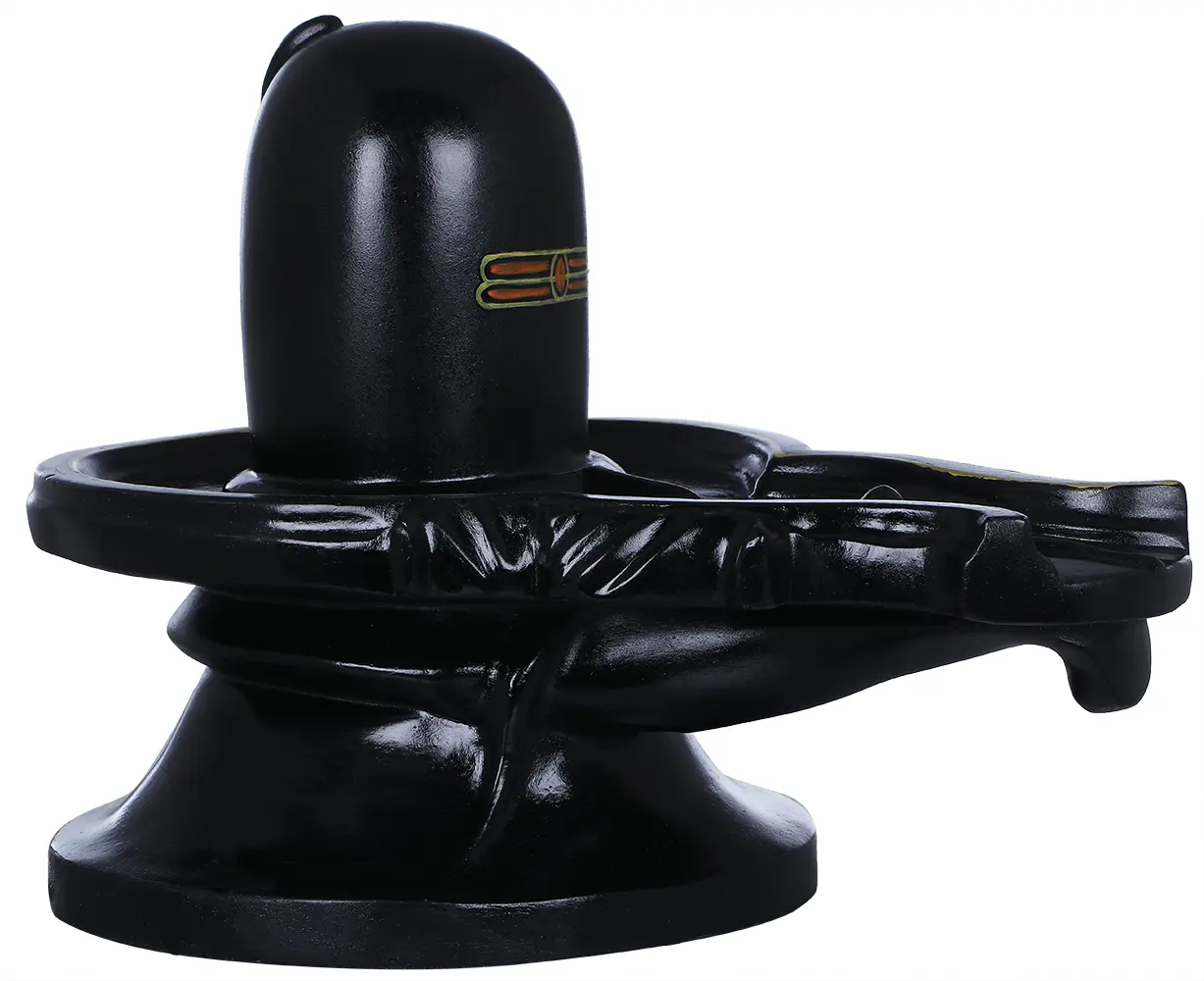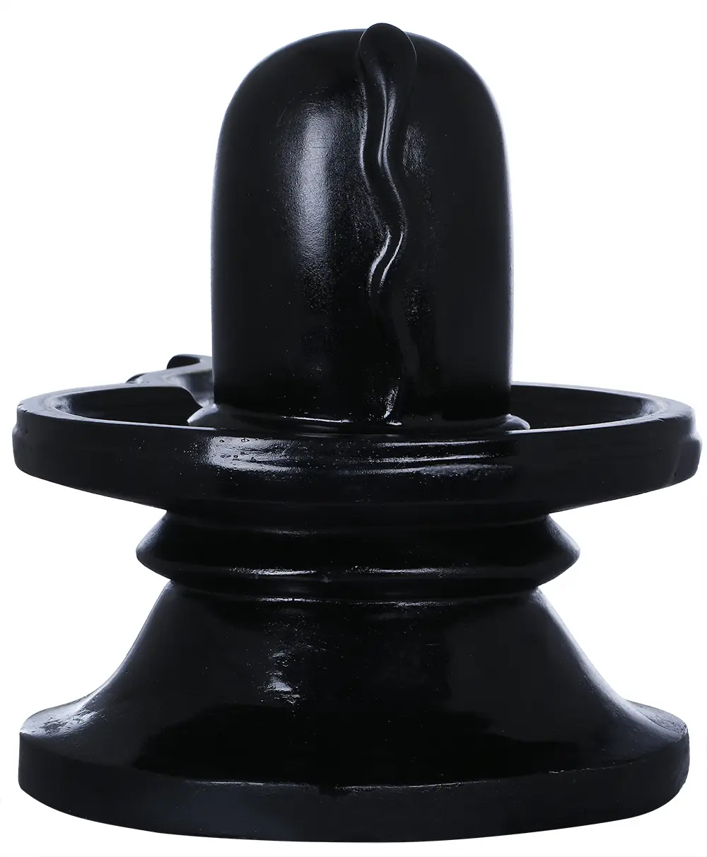 This Black Stone Shiva Linga is a sacred representation of Lord Shiva, carved from dark, lustrous stone. It typically consists of a cylindrical or elliptical pillar (the Linga) set within a circular base (the Yoni). There is a snake coiled around the Linga. The black stone's deep luster symbolizes the cosmic darkness from which all creation emerges and eventually returns. The Linga represents the formless, eternal nature of Shiva, while the Yoni signifies the divine feminine energy, often associated with Shakti, the creative force. Devotees worship the Shiva Linga as a symbol of unity, transcendence, and the cycle of creation and destruction, seeking blessings, liberation, and spiritual enlightenment through its veneration.