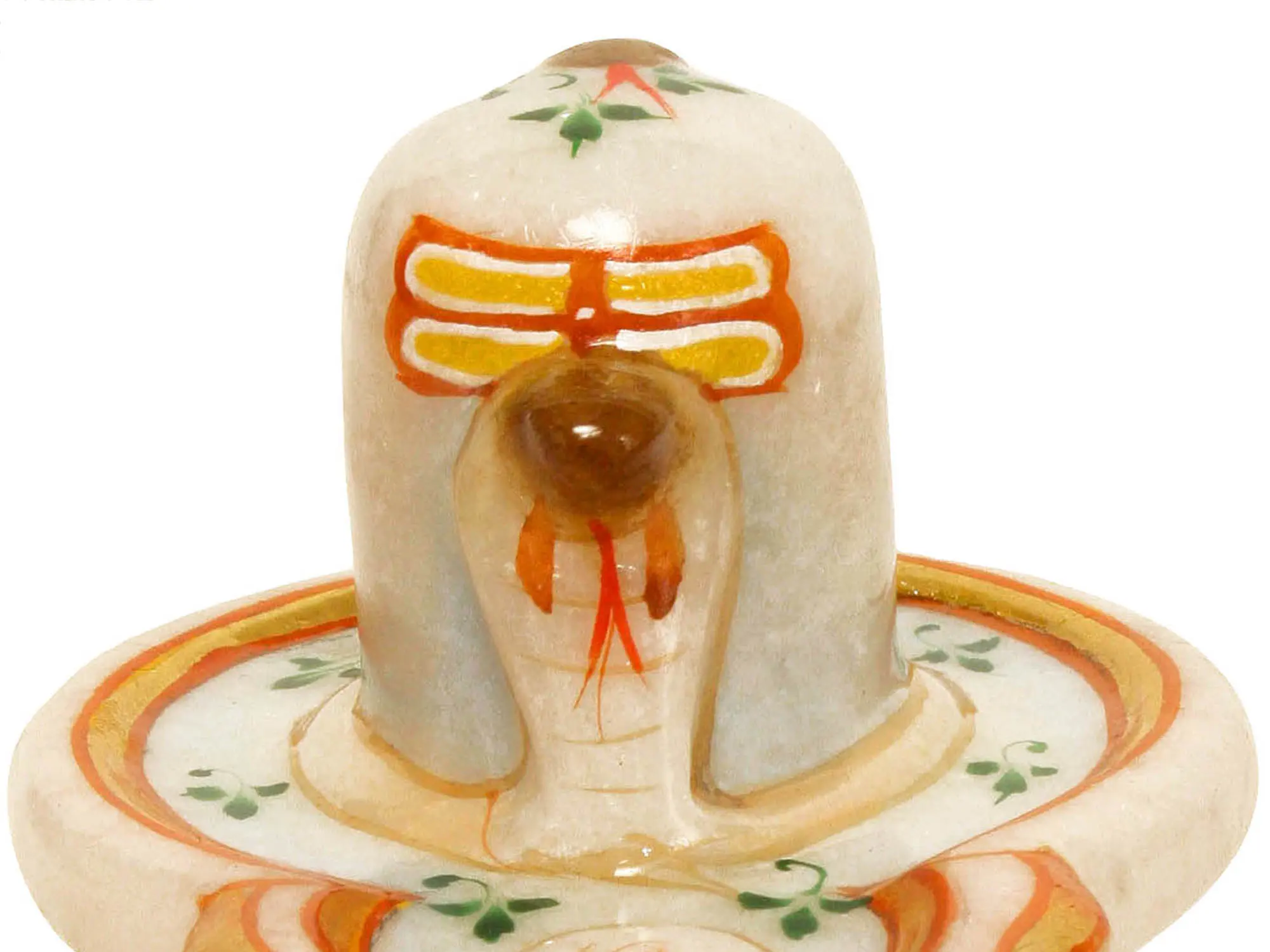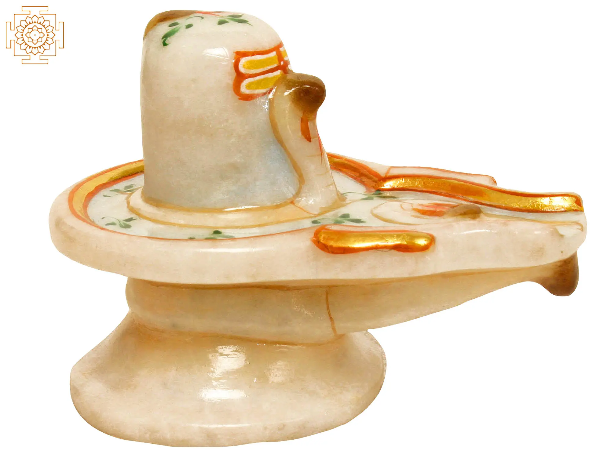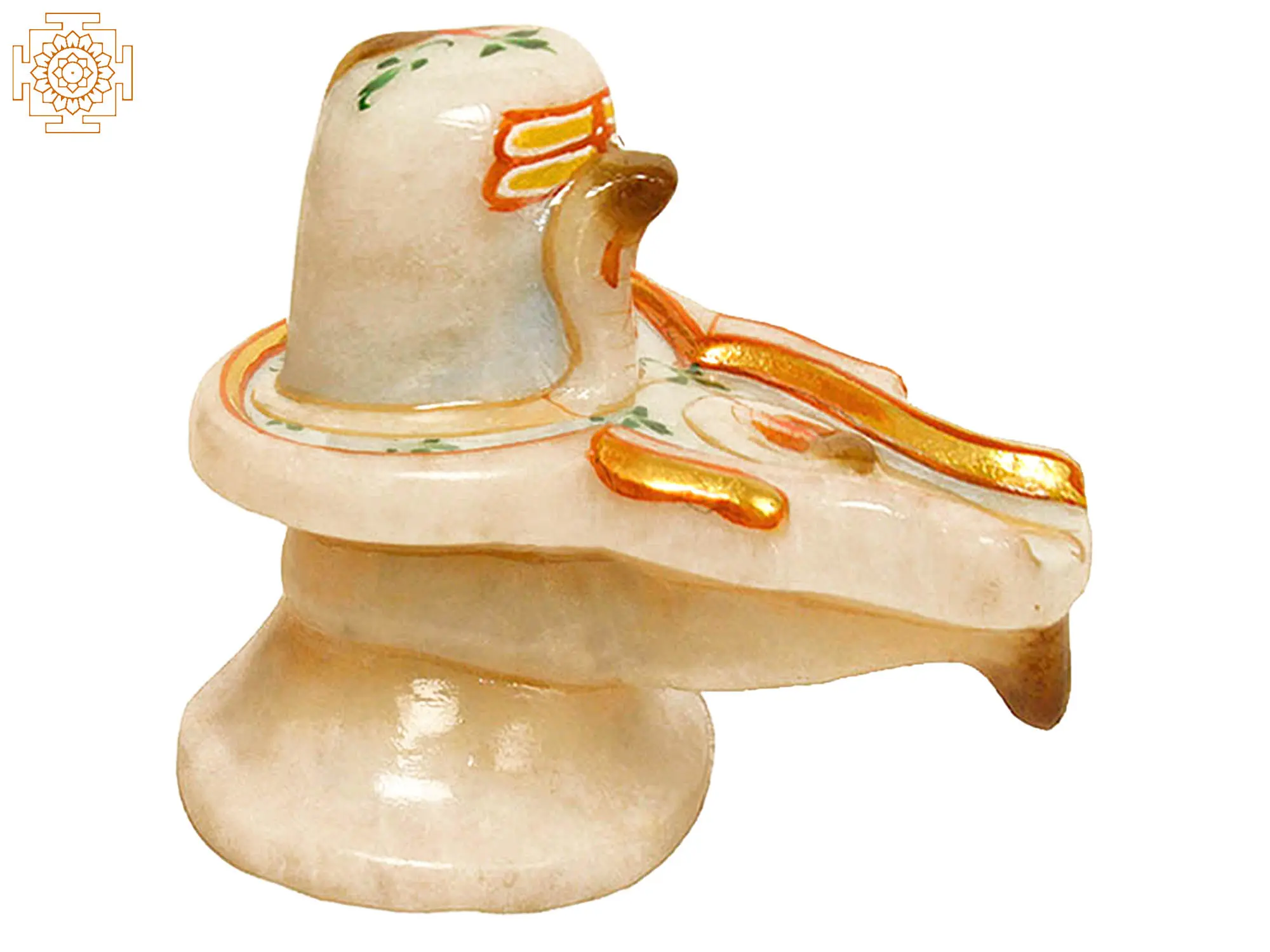 This Shiva Lingam is meticulously sculpted from high-quality marble, a material revered for its purity and ethereal beauty. The smooth, cool touch of the marble enhances the tactile experience of devotion. The sculpture is adorned with delicate, hand-painted details that bring to life the traditional iconography associated with Shiva. The vibrant orange and yellow markings on the Lingam represent the divine energy, while the subtle green foliage evokes the lushness of nature, a realm closely connected to Lord Shiva, the lord of the wilderness and asceticism. The thoughtful rendering of the Naga's hood and tongue adds a dynamic and protective aura to the piece.