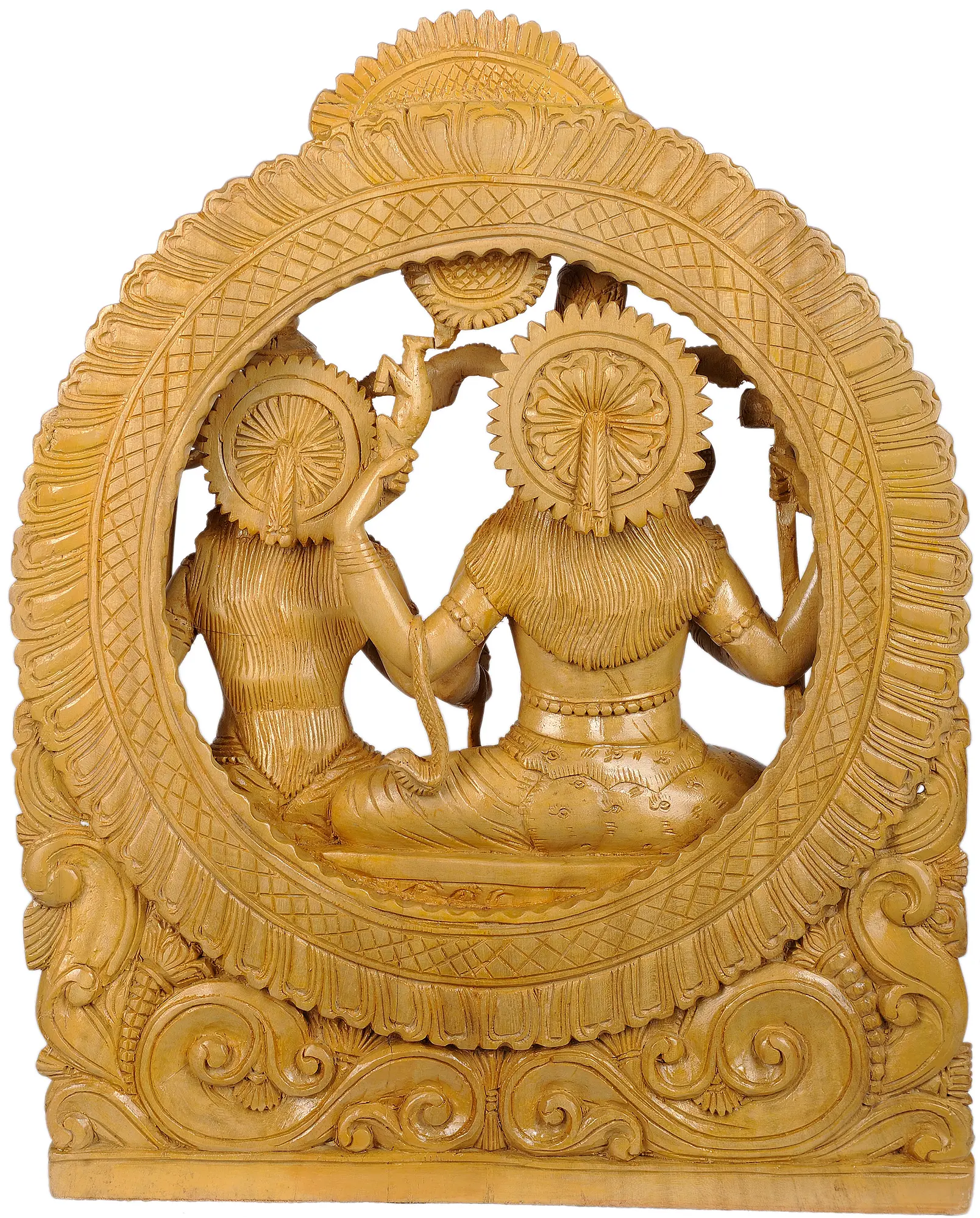 Meticulously carved from white cedar wood in Trivandrum, this statue is a testament to the skill and dedication of the artisans who crafted it. The intricate details are a labor of love, a reflection of the reverence they hold for the deities. The smooth, warm tones of the wood enhance the statue's inviting presence, making it a welcome addition to any sacred space. The statue's texture invites touch, creating a connection to the divine through tangible beauty.