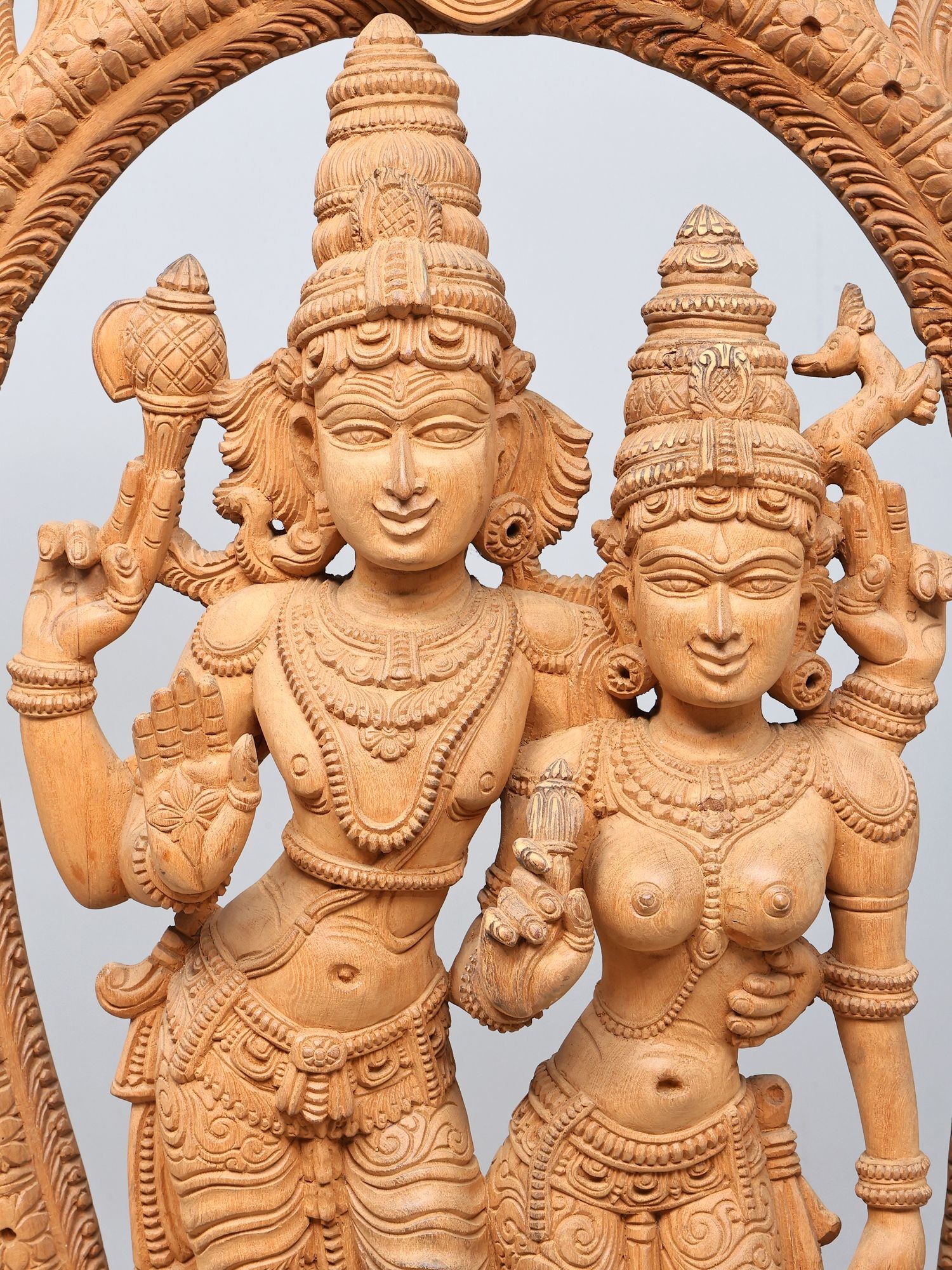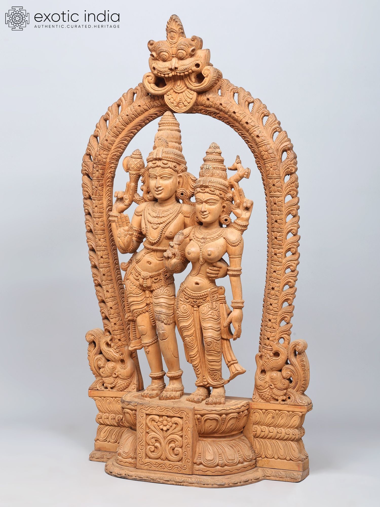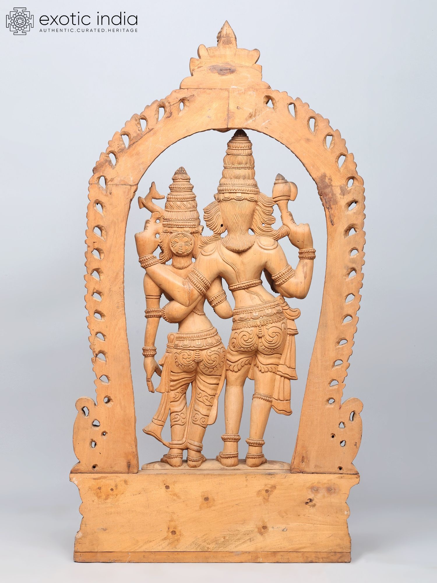 Shiva-Parvati Wood Sculpture: Graceful Standing Pose with Ornate Kirtimukha Arch