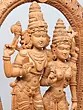 Exquisite wood carving portrays Uma-Maheshvara (Shiva and Parvati) in a harmonious standing posture.