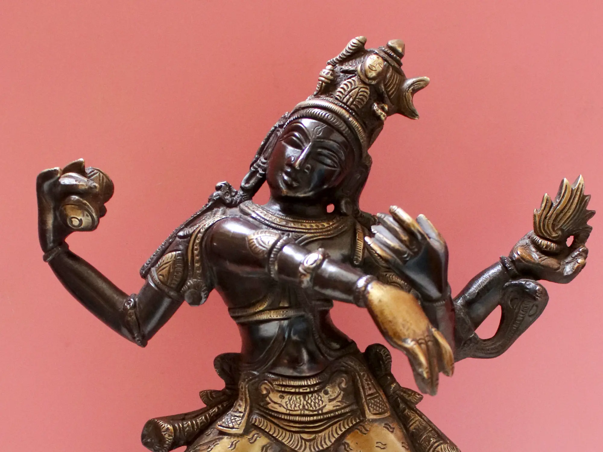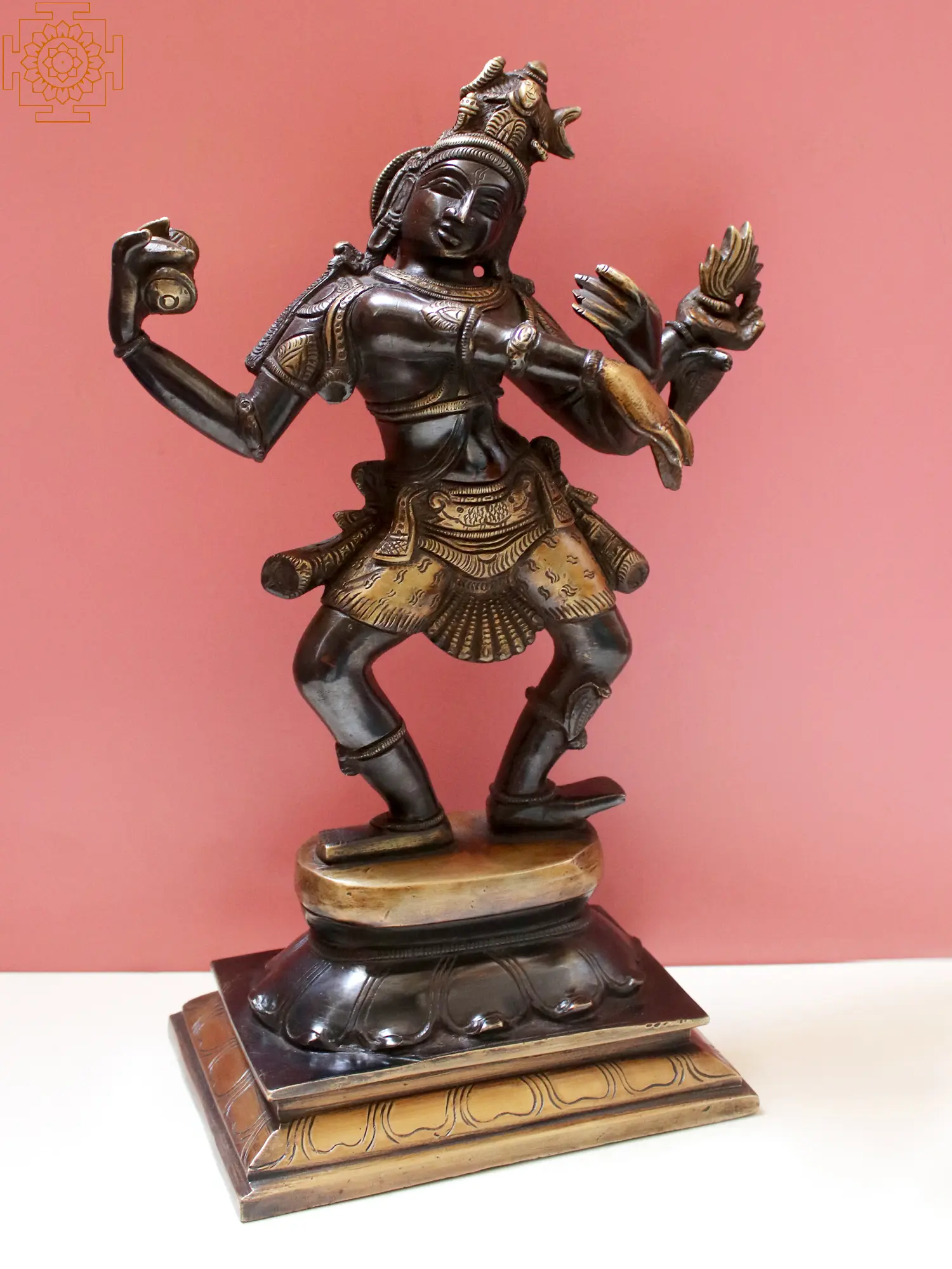This exquisite brass statue captures the dynamic and powerful essence of Lord Shiva in his cosmic dance form, known as the Tandava. The statue is a testament to the artisan's skill, rendered in lustrous brass that gleams with an antique charm, evoking a sense of timeless spirituality and profound artistry. The intricate detailing, from the divine headdress to the flowing garments and powerful stance, invites contemplation of the universe's cyclical nature. The Tandava is not merely a dance; it is the primordial rhythm of creation, preservation, and destruction, a dance that animates the entire cosmos. Lord Shiva, as the supreme dancer, embodies this ceaseless cosmic activity. In this depiction, he is shown with multiple arms, each holding significant symbolism. One hand grasps a drum, the Damaru, whose beat is said to be the origin of all sound and creation. Another hand holds a flame, representing destruction and purification, the force that dissolves the old to make way for the new. The remaining hands are in dynamic poses, conveying the vigorous and exhilarating nature of the dance, suggesting both immense power and divine grace. ––––––––––