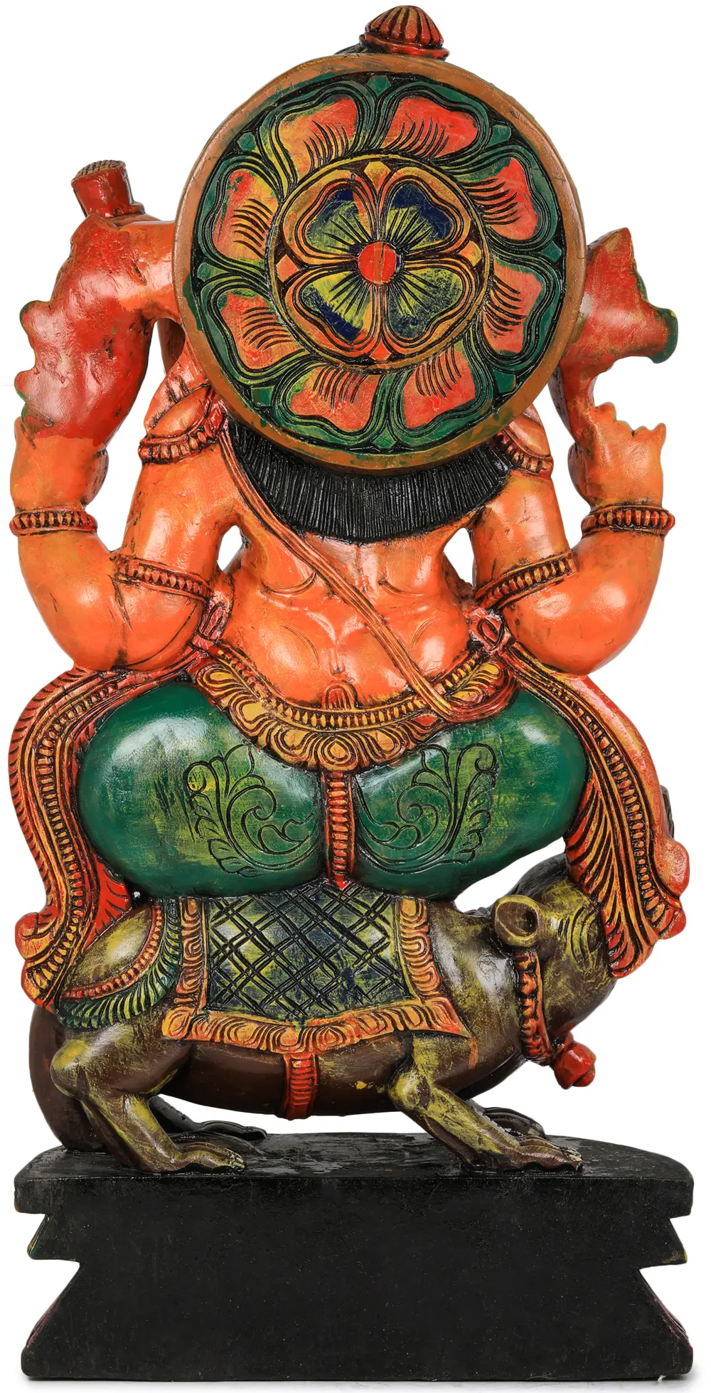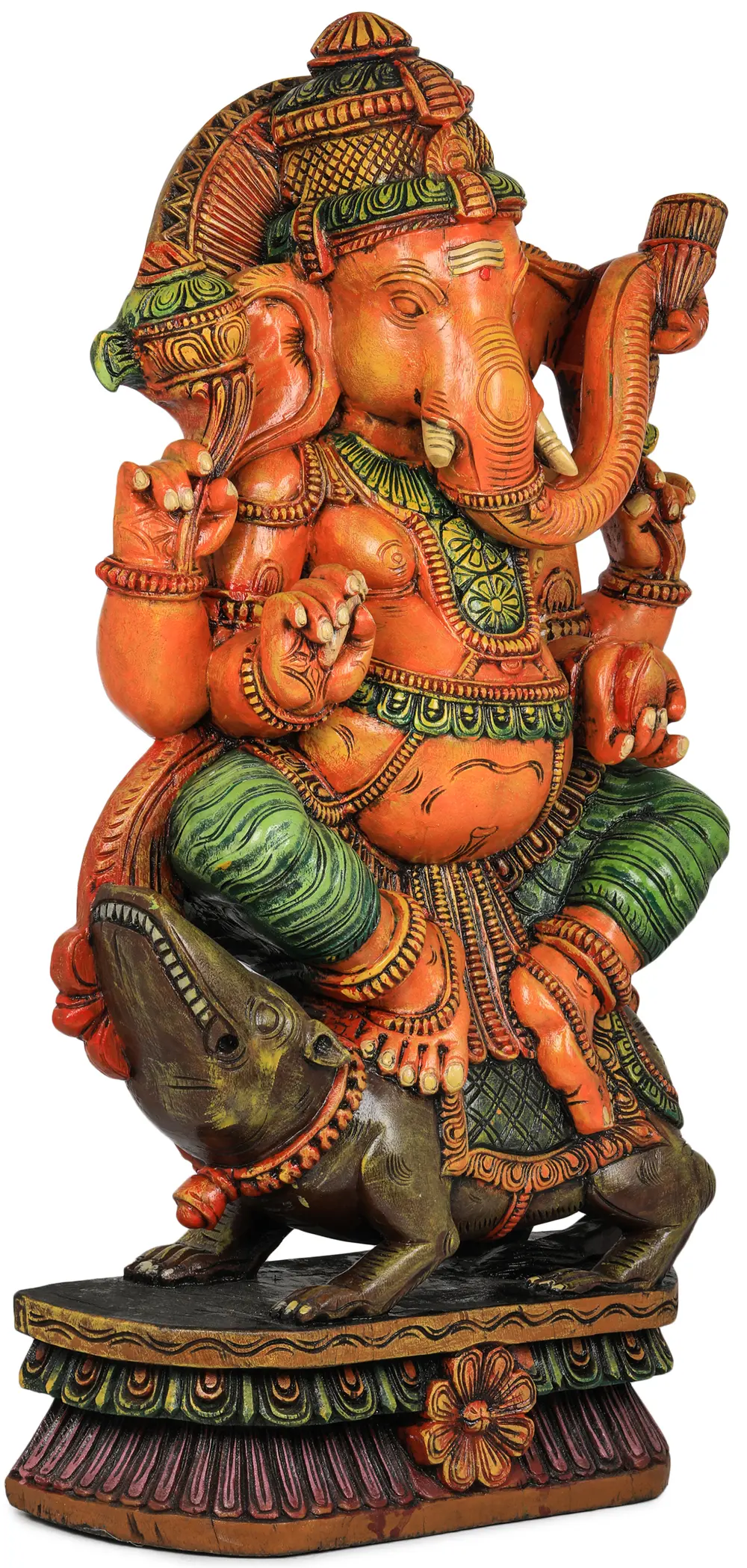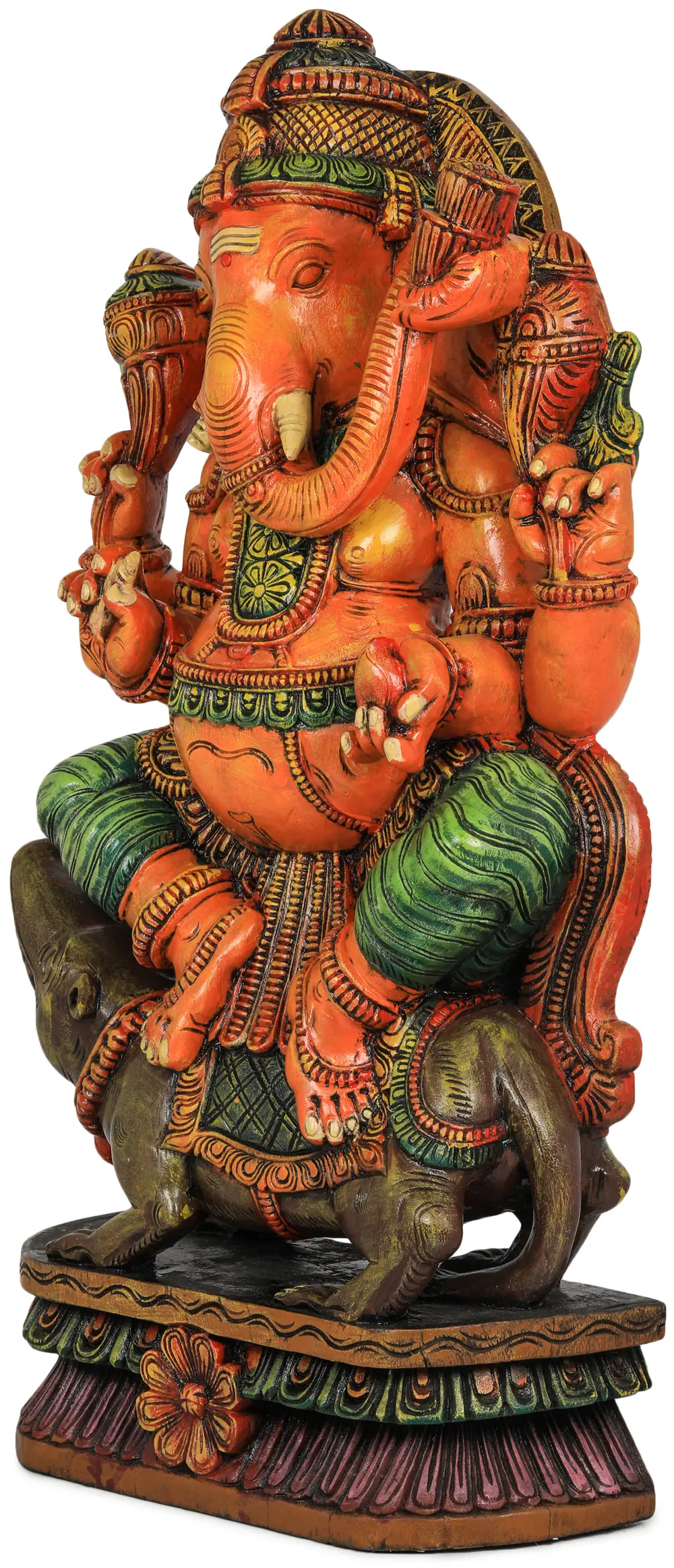 Ganesha is revered in Hinduism popularly as Vighnaharta (one who removes obstacles) and also worshipped first before the start of any auspicious event or celebration to have an easy flow of work; he is the only god who shares a similar bond with every child and adult because of his childlike innocence and love for his devotees. This Ganesha sculpture is sculpted in his iconic paunchy belly and sits comfortably on his sacred vahana, mouse, who stands on a stylized double layered flower pedestal. The sculptor has beautifully played with the color palette while coloring this sculpture in a bright green and divine orange hue and the vahana has a self patterned shade of a unique black, green and yellow blend.