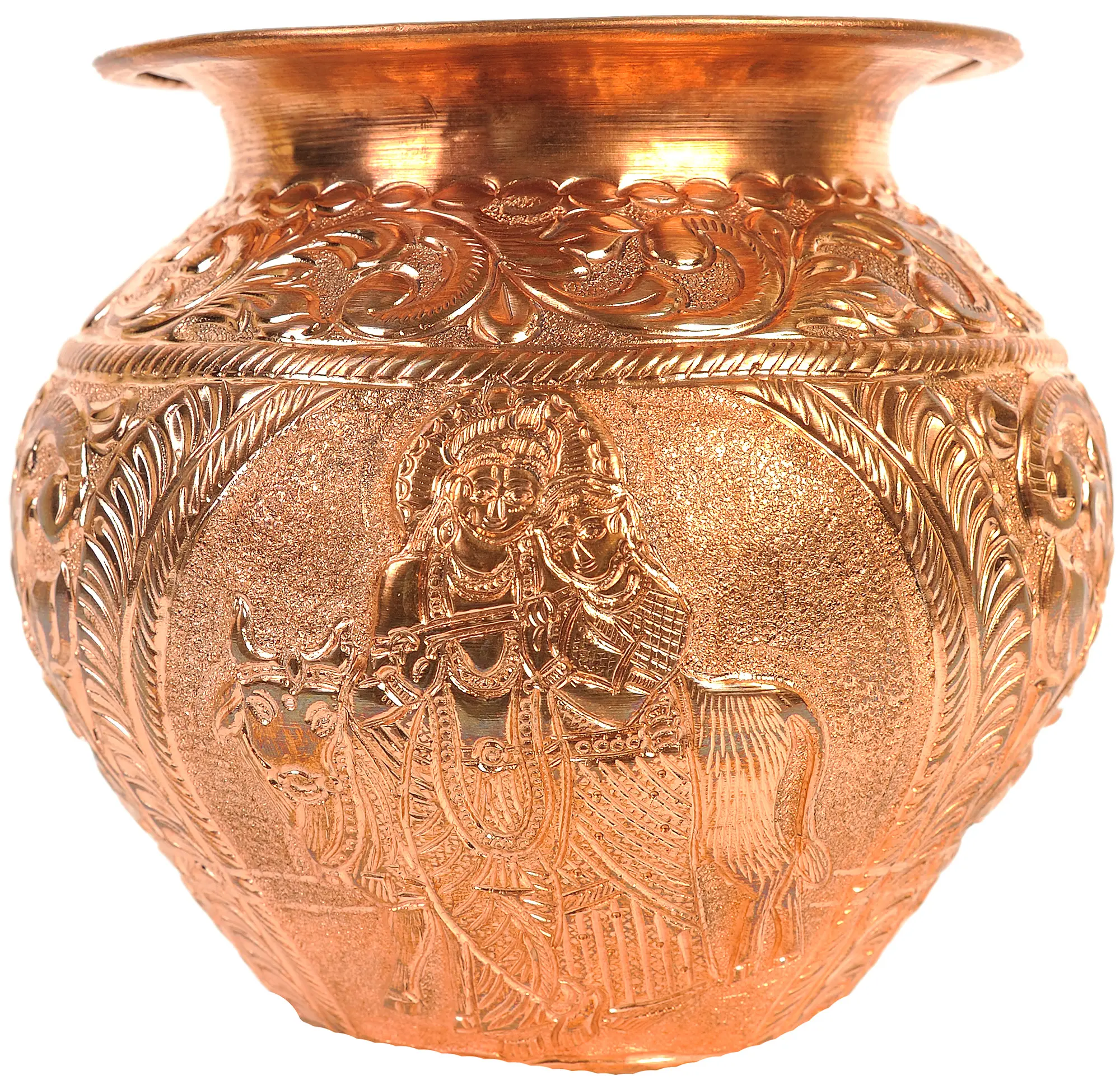 This exquisitely crafted copper pot is more than just a beautiful object; it is a vessel steeped in spiritual significance and cultural heritage. Bearing the sacred inscription of "Radhey Radhey," it evokes the divine love and devotion associated with Radha and Krishna, the eternal couple of Hindu mythology. In the Vaisnava tradition, Radha is revered as the chief of the Gopis and the divine consort of Lord Krishna. Their love story is a profound allegory for the soul's longing for union with the divine, a central theme in many Hindu scriptures and devotional practices. The chanting of "Radhey Radhey" itself is a powerful mantra, believed to invoke blessings, purity, and spiritual bliss.
