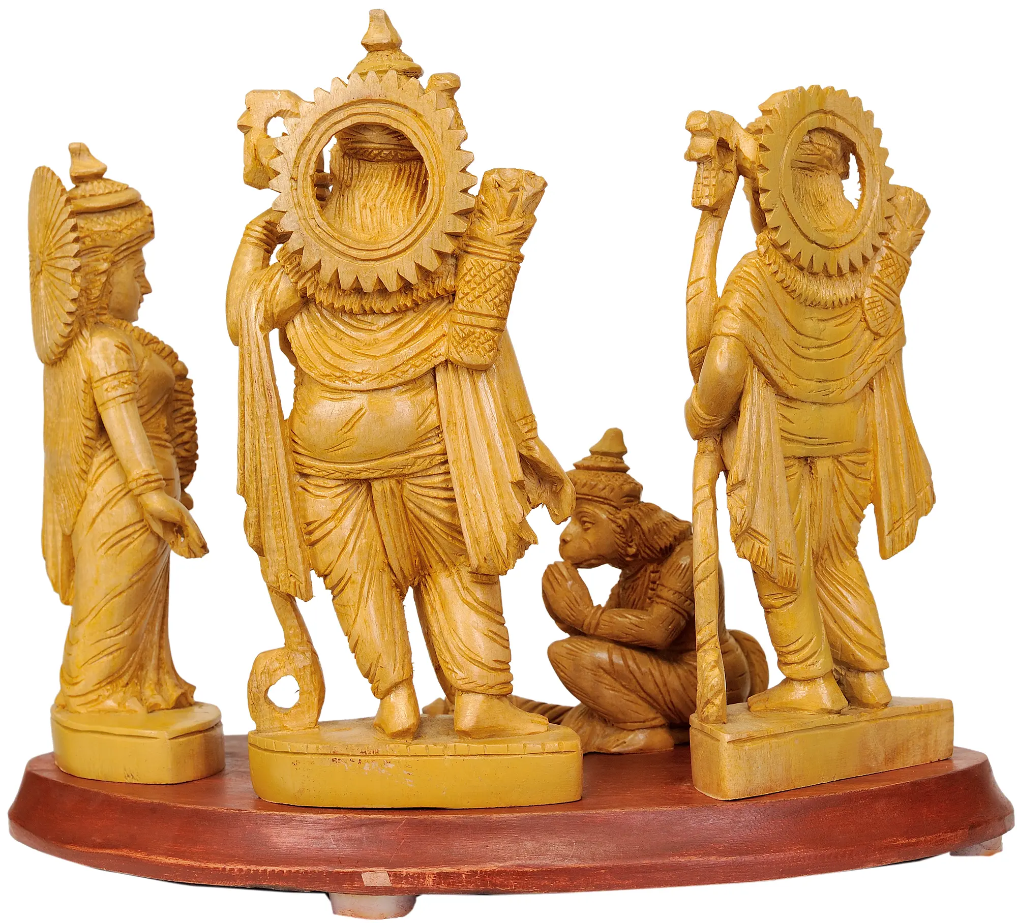 Bring the blessings and auspicious presence of Lord Rama and his devoted companions into your home with this exquisite wooden sculpture. Crafted from the finest white cedar wood sourced from the verdant forests of Trivandrum, this piece captures a pivotal moment of devotion and divine companionship. The intricate details and the natural warmth of the wood lend an aura of authenticity and spiritual resonance, making it a truly captivating centerpiece for any sacred space or a cherished addition to your collection of devotional art. The central figure of Lord Rama stands with regal grace, embodying righteousness and virtue. His serene countenance reflects his divine nature as an avatar of Lord Vishnu, come to Earth to vanquish evil and restore dharma. Clad in traditional attire and adorned with garlands, he holds his mighty bow, a symbol of his unwavering resolve and prowess in battle. Beside him, the ever-faithful Sita Ji radiates a gentle beauty, her presence a testament to steadfast love and resilience, embodying the ideal feminine principle. To Rama's other side stands Lakshman Ji, the embodiment of loyal brotherhood and selfless service, always vigilant and ready to protect his elder brother. The artistry in their portrayal captures the essence of their characters as depicted in the epic Ramayana, a timeless narrative of duty, devotion, and the triumph of good over evil. ––––––––––––––––––