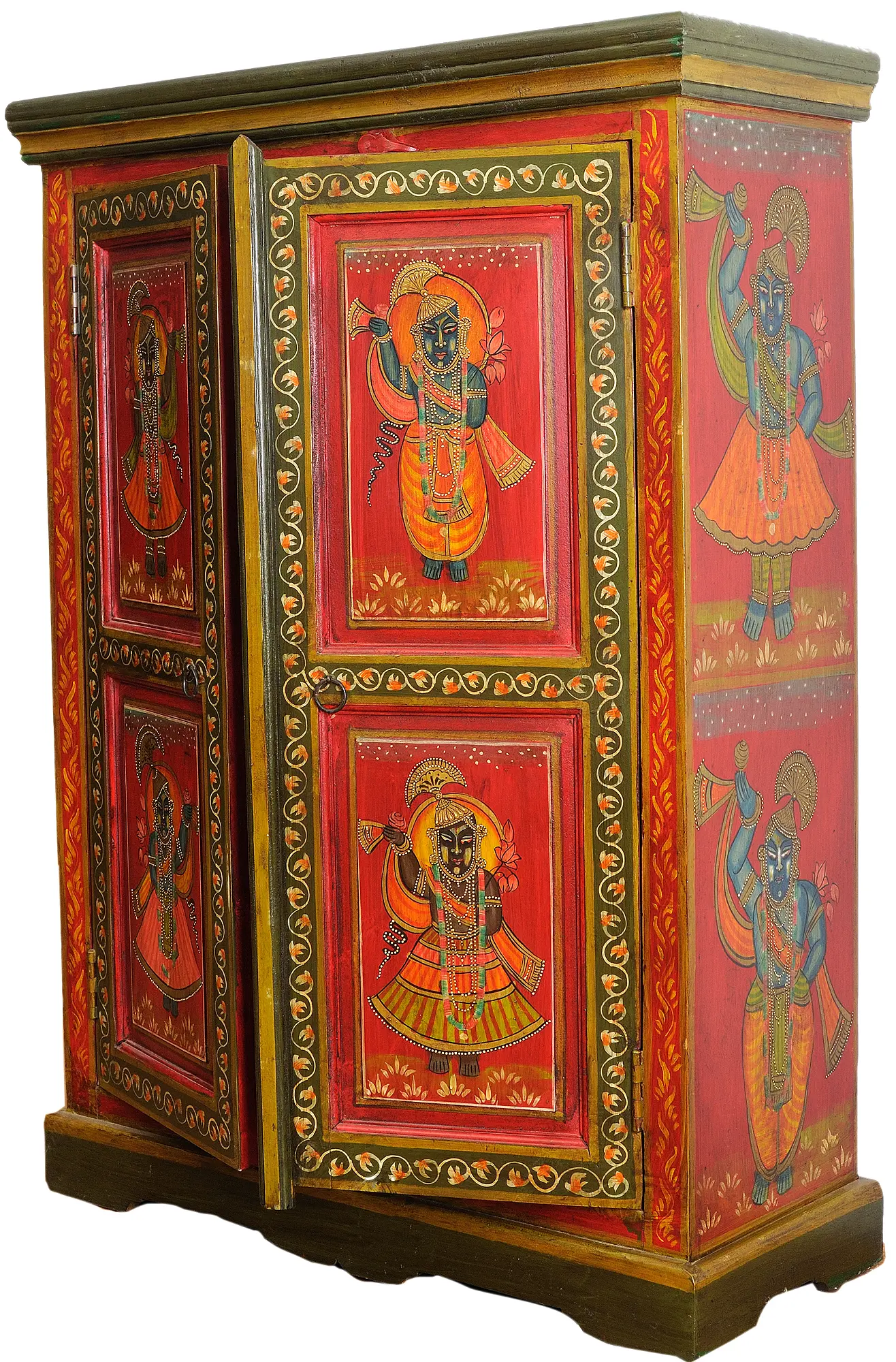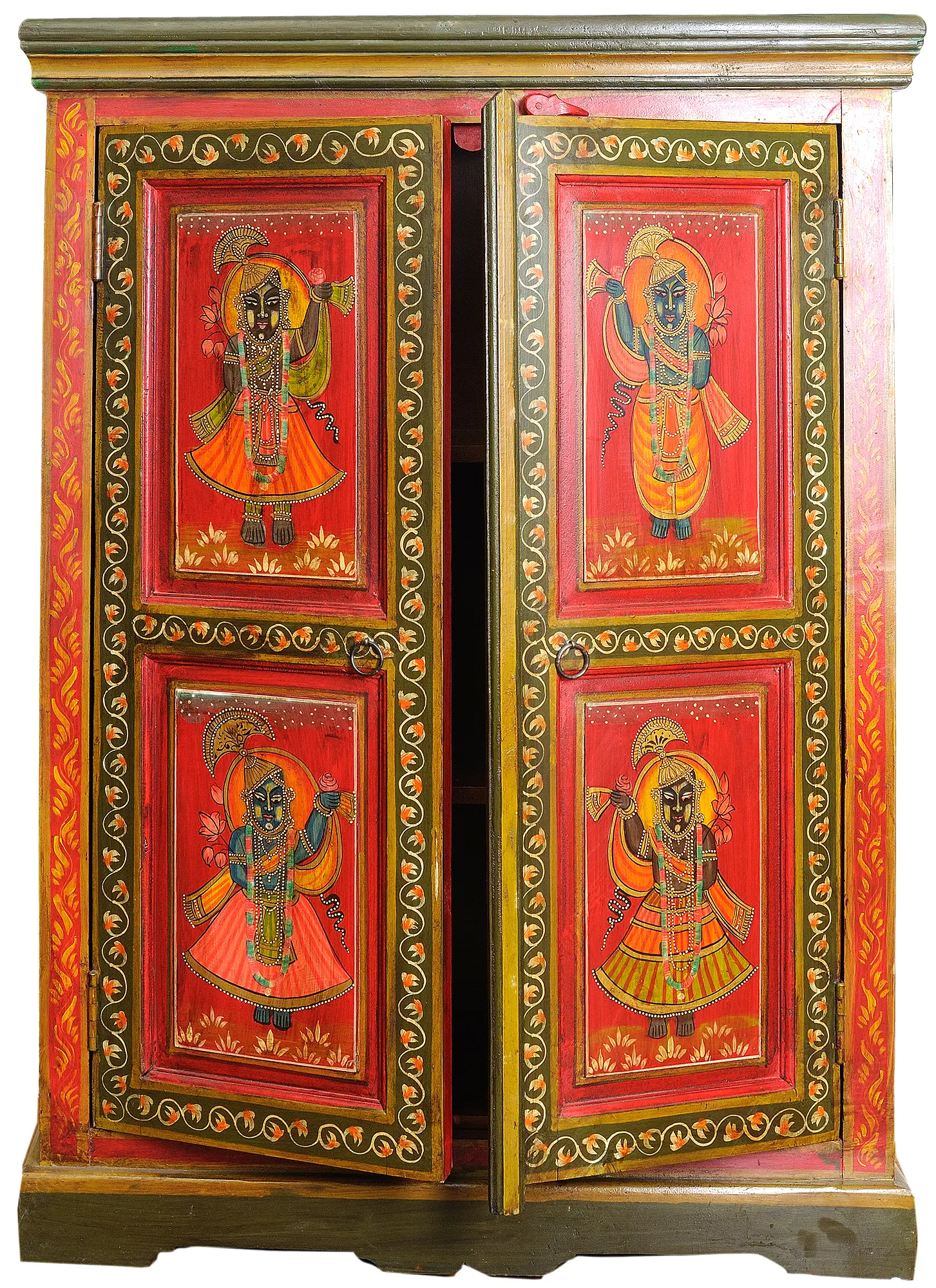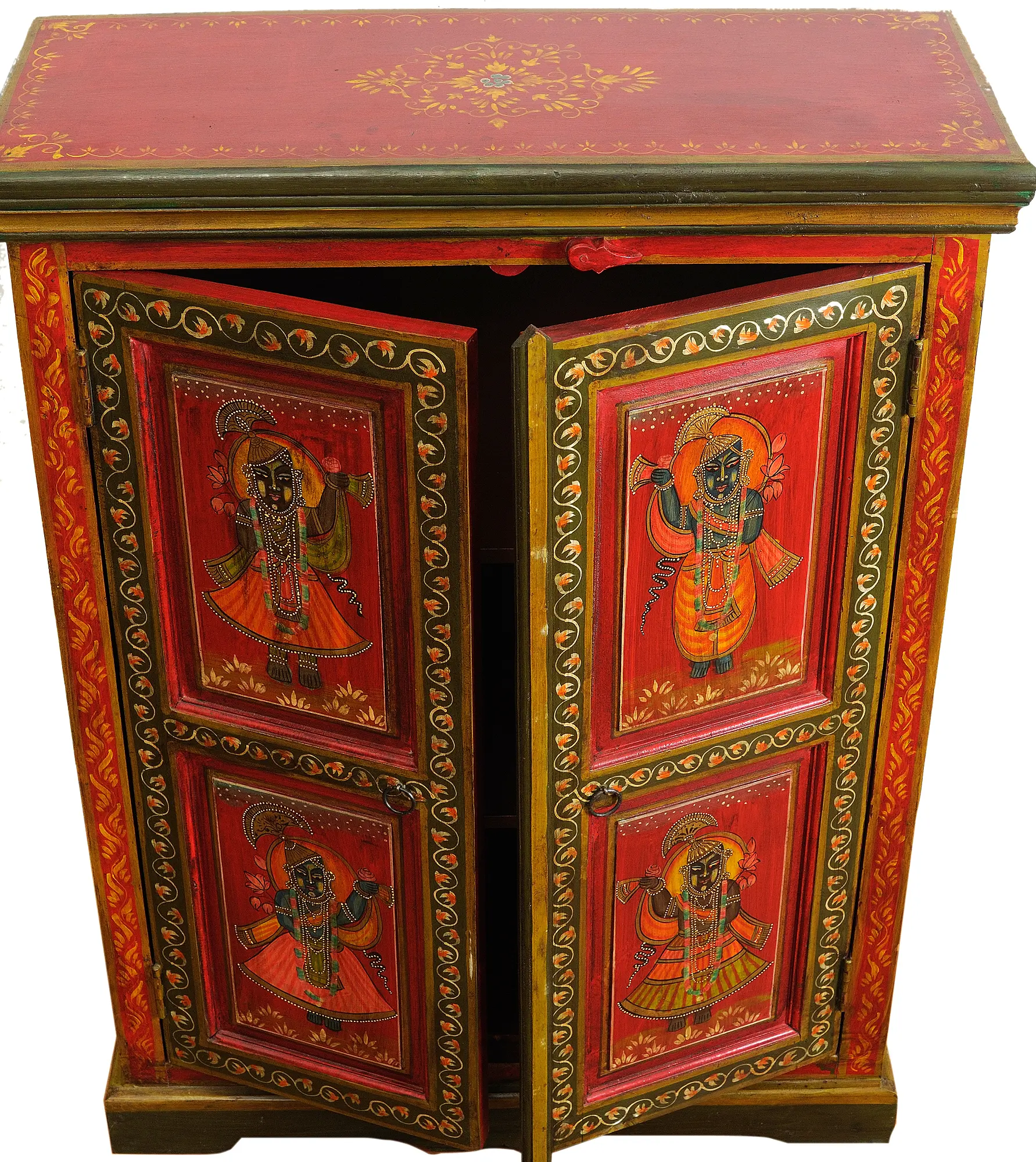Adorn your home with a piece of devotion and artistry. This exquisite wooden cupboard is more than just furniture; it's a vibrant canvas, meticulously hand-painted with depictions of Shrinathji, a beloved manifestation of Lord Krishna. In Hindu tradition, Shrinathji is revered as the divine child who lifted the Govardhan Hill to protect the villagers of Vrindavan from the wrath of Lord Indra. His gentle gaze and serene posture on this cupboard invite an aura of peace and blessings into your living space.