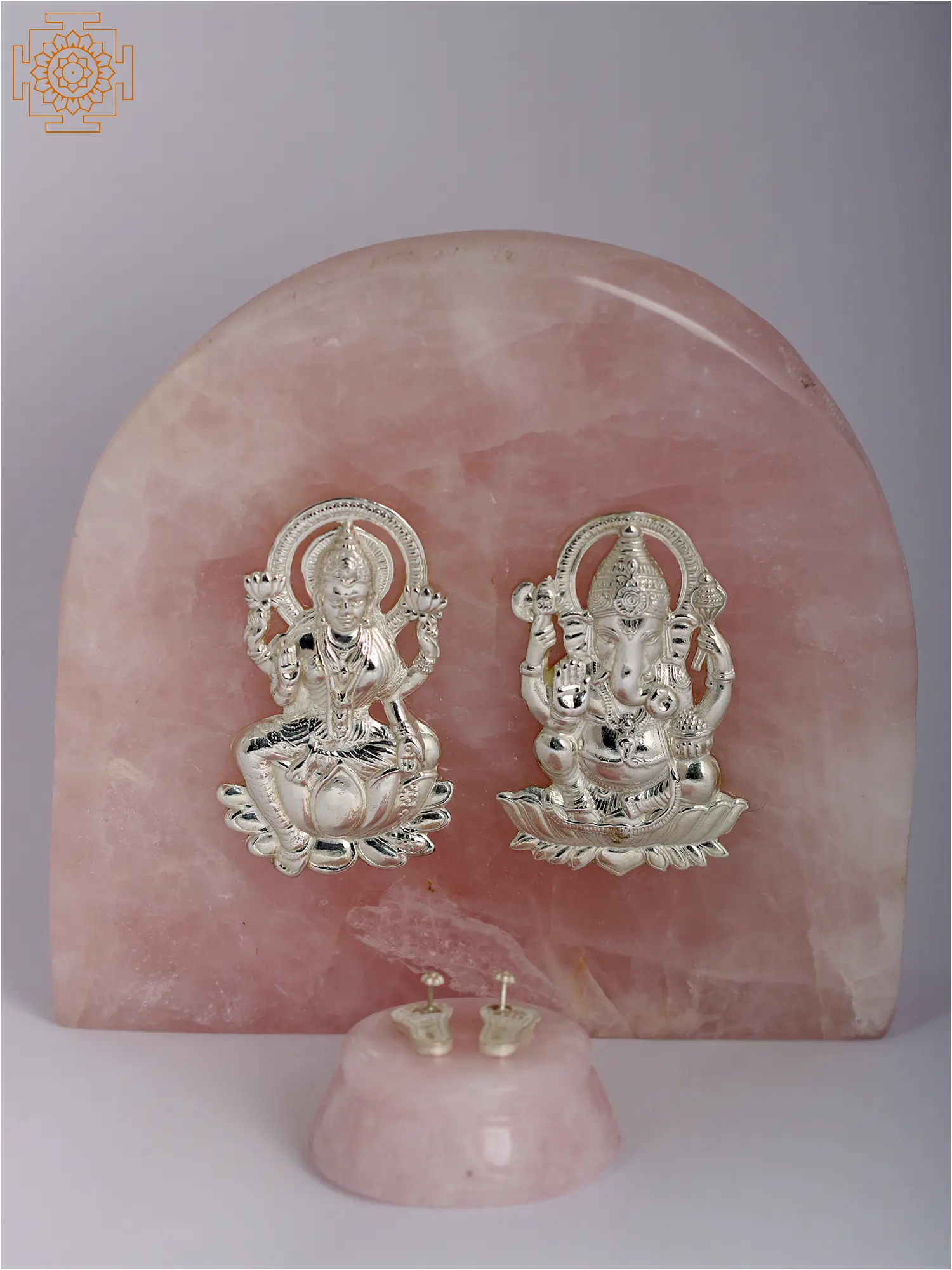 A heavenly silver Lakshmi-Ganesha vigraha for placement in your Puja space, this small icon of the duo is placed on the mesmerizing rose quartz gemstone- a stone that showers abundance, auspiciousness, and joy in the lives of the people, much like the divinities that are infusing it with their divine energies. Maa Lakshmi and Sri Ganesha, in their propitious Chaturbhuja roopa are crafted to perfection, with a brilliant animation felt on their countenance. The images are attached on a rose quartz stele, which along with the lotus pedestal for the Charan Paduka (feet-marks) of the deities, will attract heavenliness in your space.