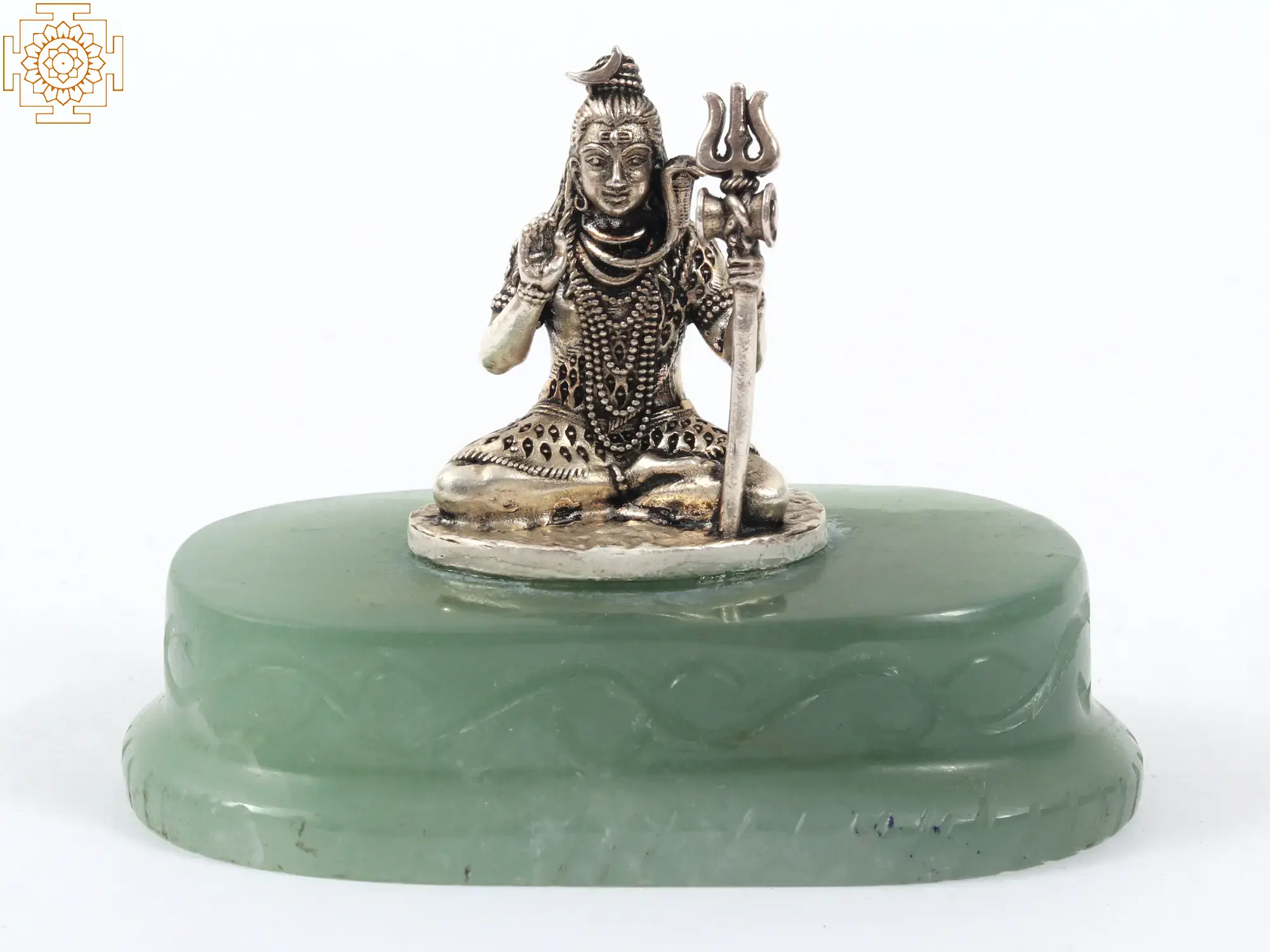 The heavenly presence of our Silver Blessing Shiva on Light Green Aventurine Gemstone can alter the atmosphere of a room. This magnificent artwork elegantly combines spirituality and natural beauty. The delicate embellishments in sterling silver bring Lord Shiva to life, exuding beauty and tranquillity. The sculpture is supported on a base made of light green aventurine gemstone, which is noted for its calming and healing characteristics. The gemstone's brilliant green tint adds a sense of serenity to the artwork, creating a pleasant and fortunate mood. Our Silver Blessing Shiva on Light Green Aventurine Gemstone is a magnificent centrepiece that resonates with spiritual searchers and collectors both, thanks to its ethereal charm and symbolic significance.