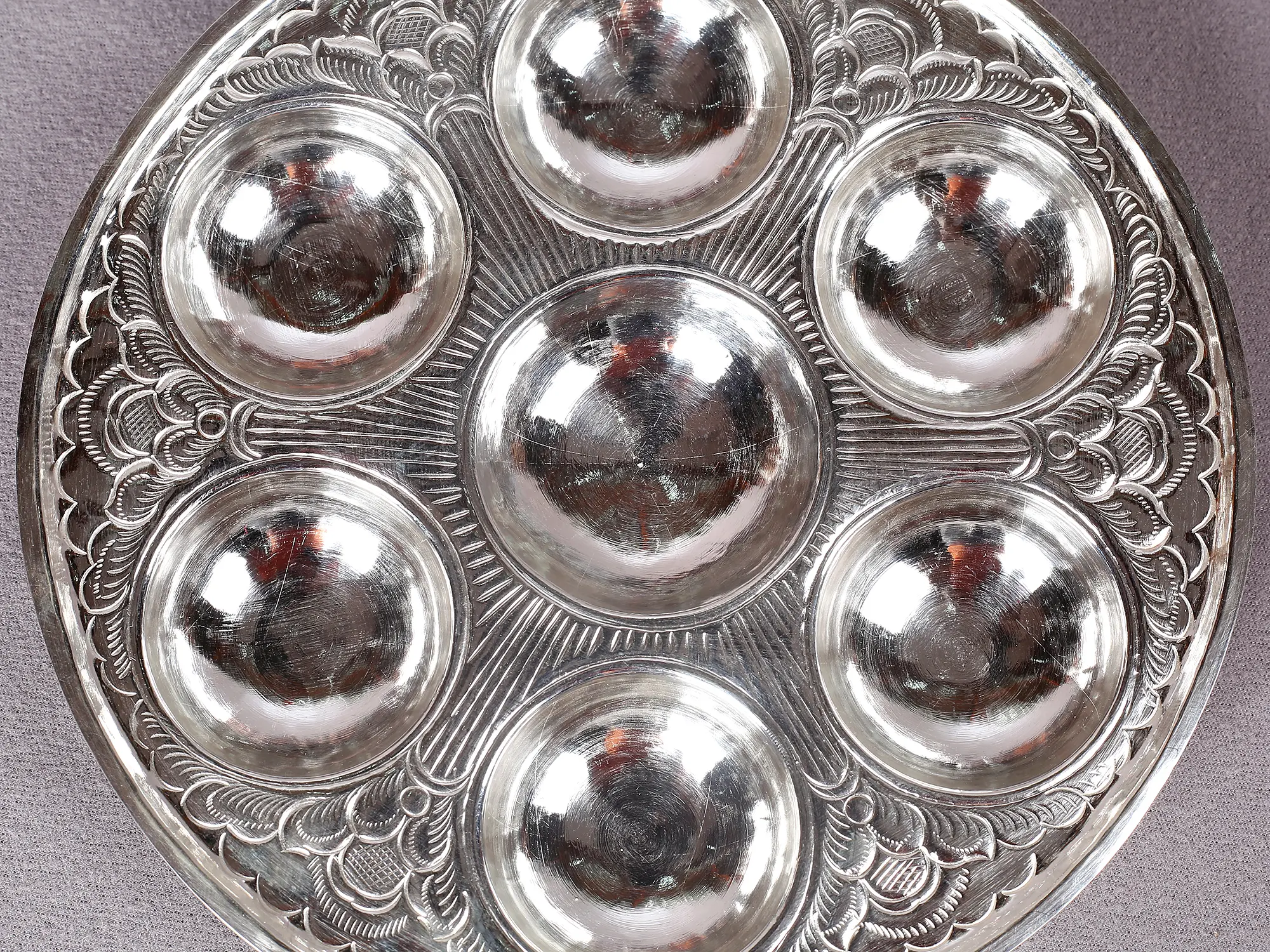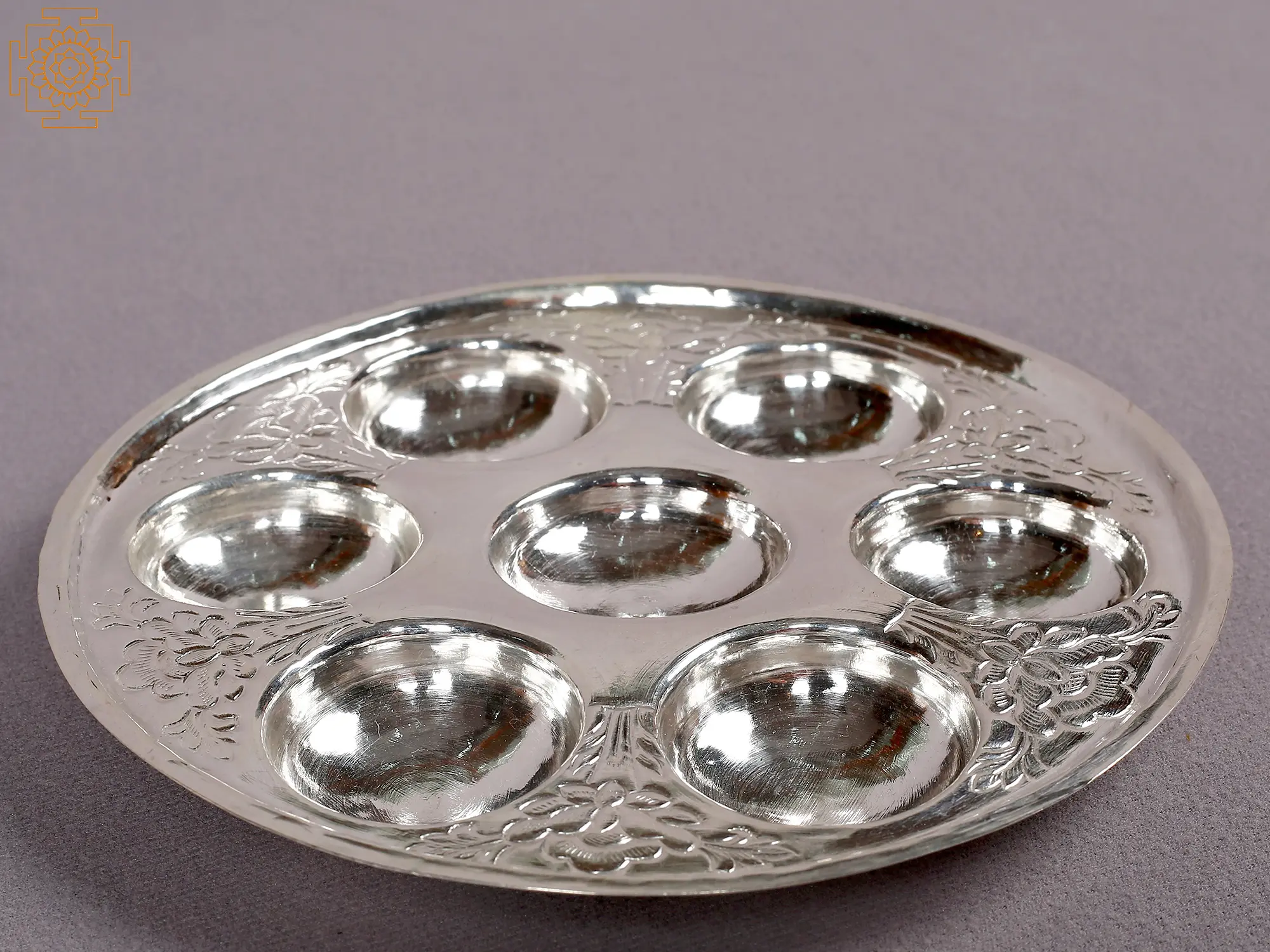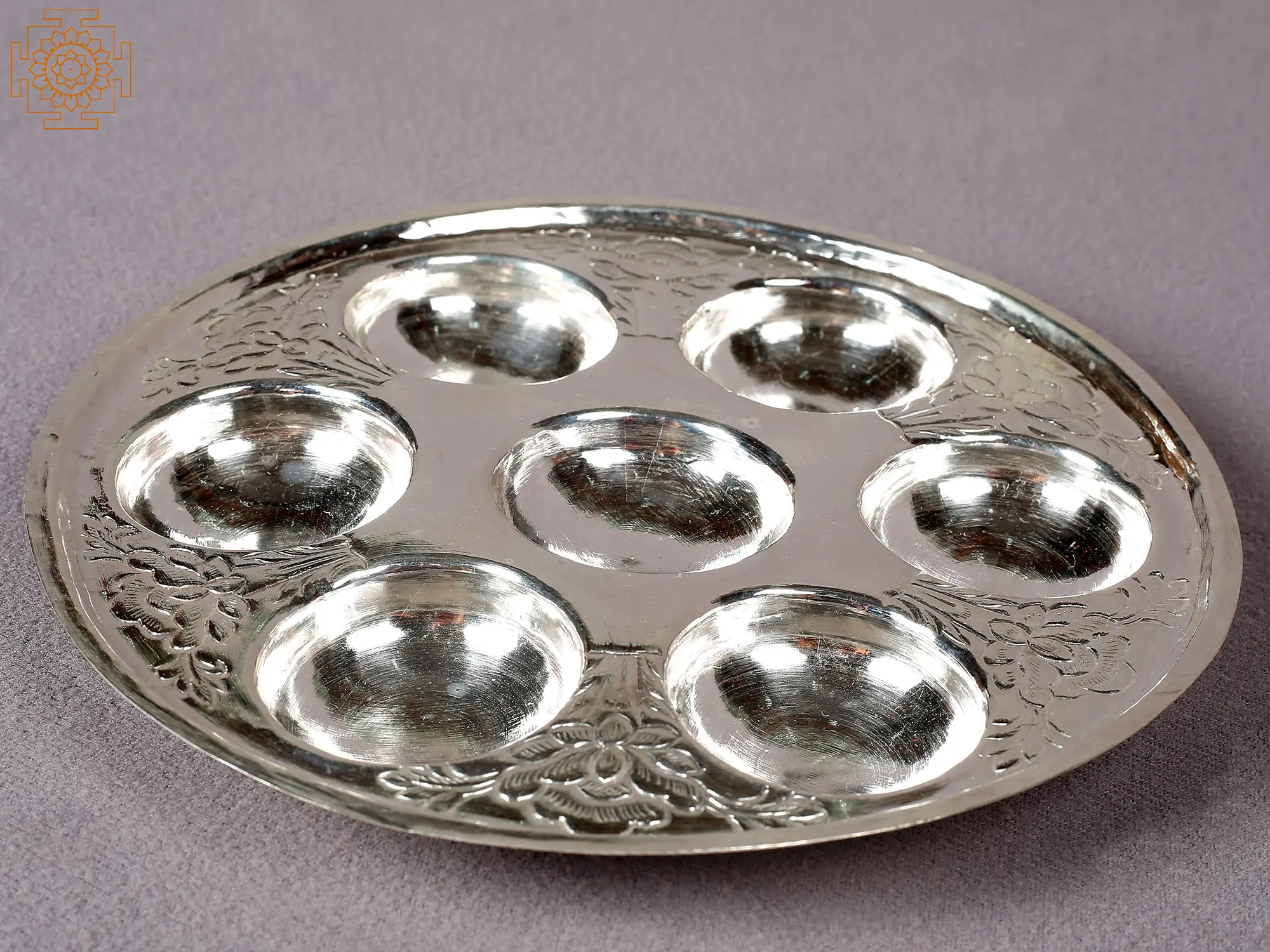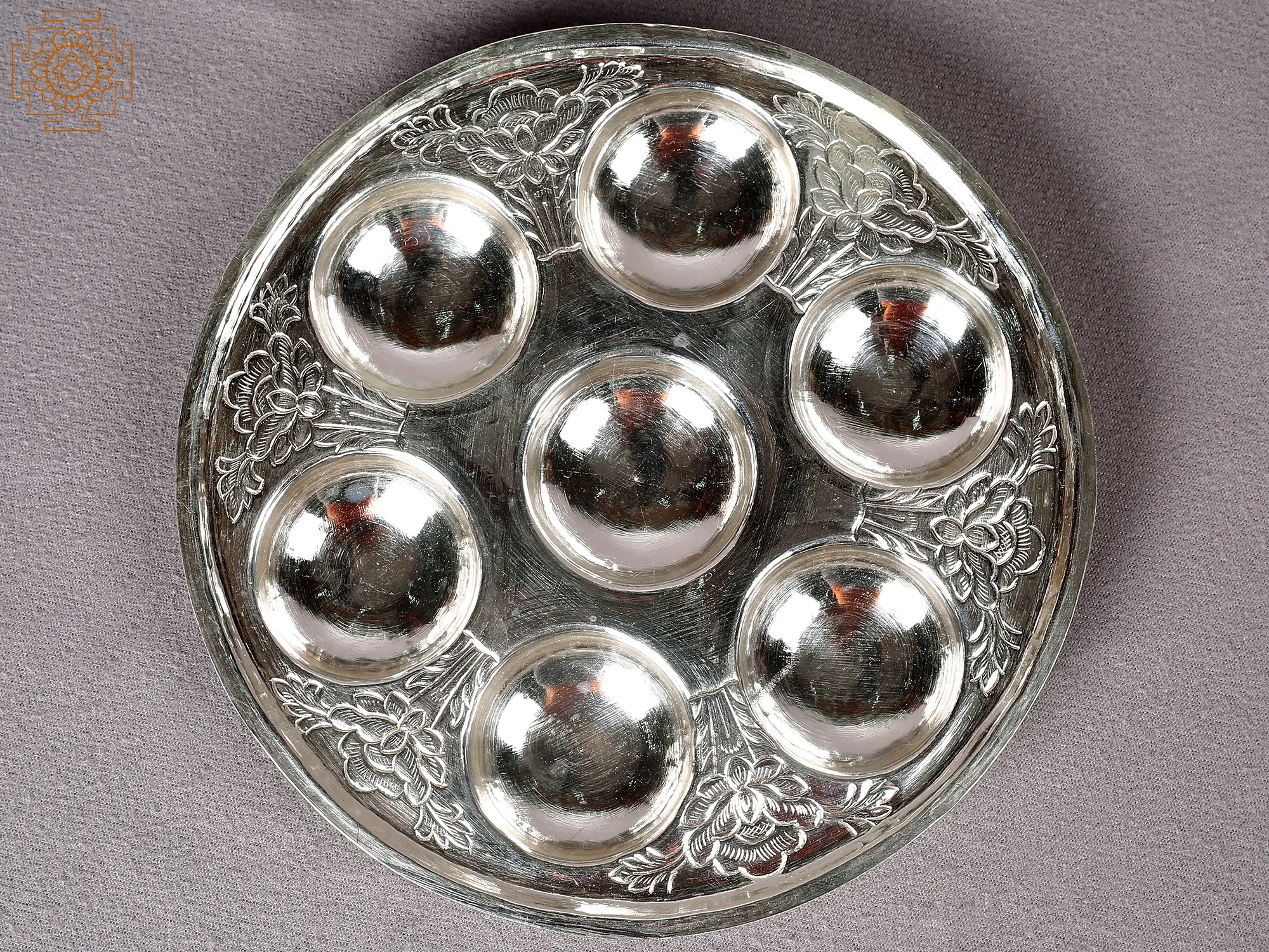 Nepal's artistic legacy shines through this Silver Carved Puja Thali (Saptapala). In this vibrant culture, rituals and offerings are an integral part of daily life. This exquisite plate serves as a canvas for devotion. The seven compartments, each provided to be filled with symbolic offerings like rice, flowers, and incense, represent the divine presence in various forms. In the center, the 'Sri Yantra' signifies the cosmos' geometric perfection. As you engage in your daily puja rituals with this thali, may it serve as a conduit to connect with the divine, and may its intricate designs remind you of the harmonious balance in the universe.