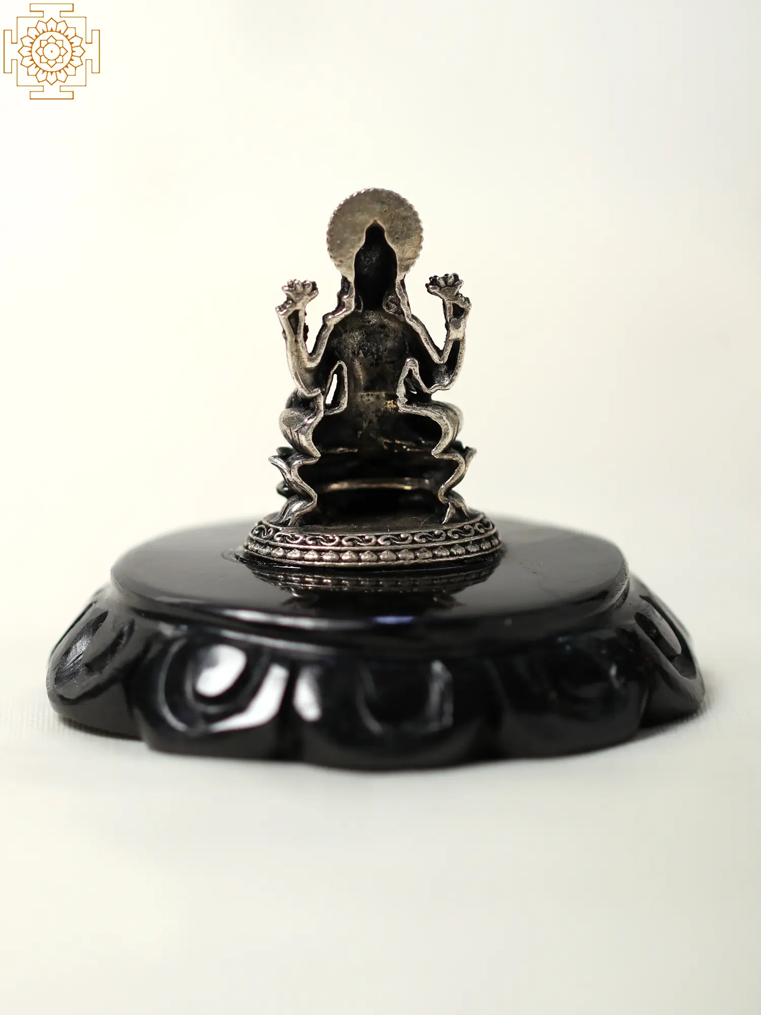 The divine bestower of universal wealth, goddess Lakshmi is mesmerizingly represented in this small statue, made with pure silver that appropriately captures the aura of the great mother. Devi Lakshmi is four-armed, adorned with a Mukuta and ornaments befitting a queen. Her seat is a fully-bloomed lotus representative of purity and abundance and the base of the icon is a brilliant black agate inverted lotus, adding a grandeur and the powerful energies of agate to the composition.