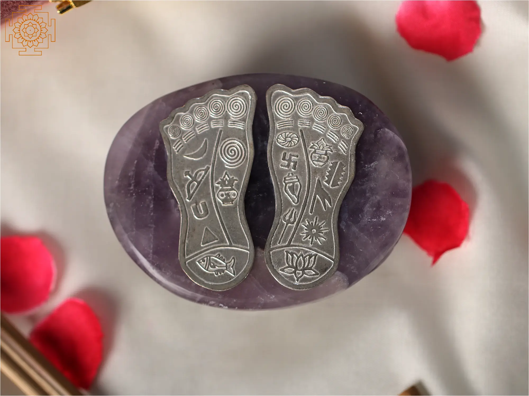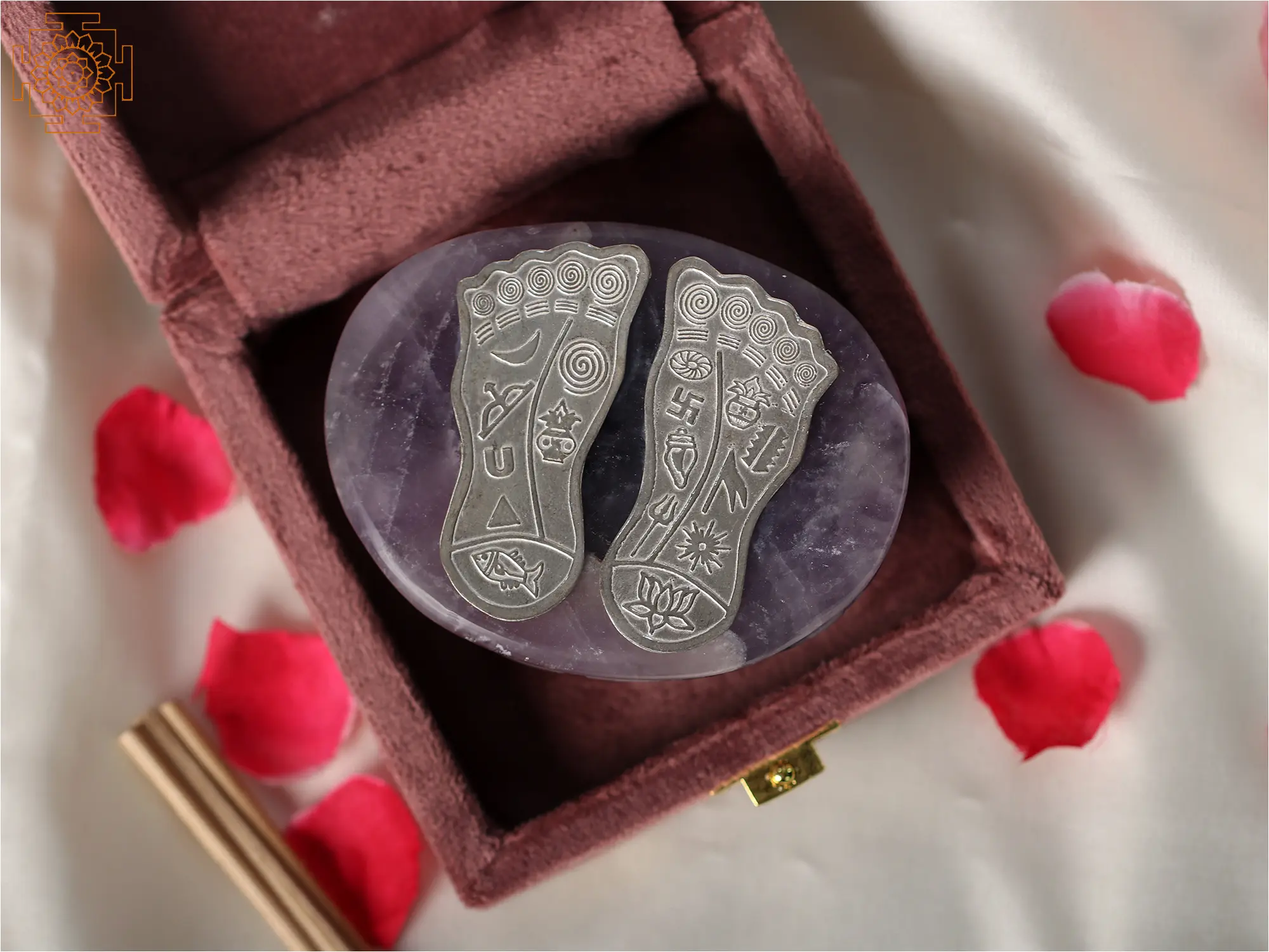 Presented in a plush velvet box, this exquisite set of Charan Paduka is not only a beautiful devotional item but also a potential heirloom. Its meticulous craftsmanship and the inherent value of silver and amethyst make it a piece to be treasured and passed down through generations. Whether placed in a puja room, on a desk, or in a cherished corner of your home, these Lakshmi Charan Paduka serve as a constant reminder of the Goddess's benevolent presence and the boundless blessings she bestows upon those who honor her.
