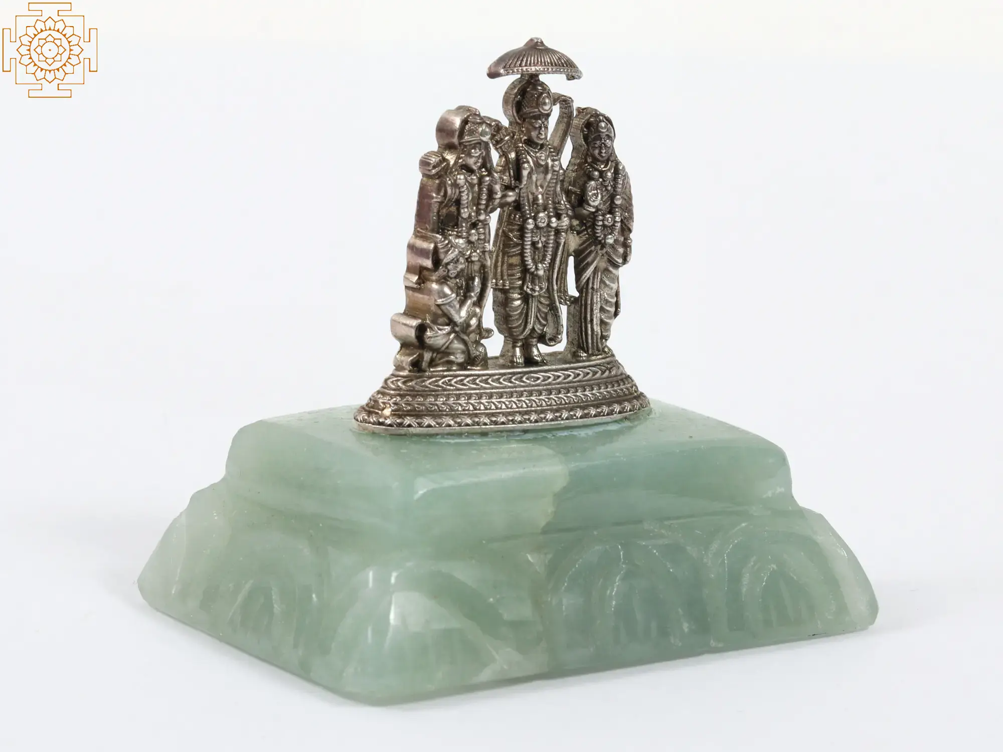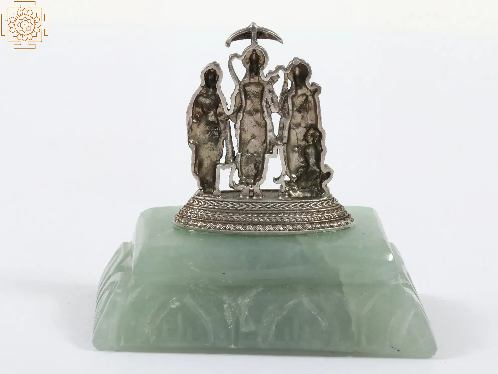 This Silver Ram Darbar on Light Green Aventurine Gemstone is a stunning and intricate piece of artwork that has been painstakingly carved on a smooth, light green aventurine gemstone. A majestic silver statue of Lord Ram, surrounded by his beloved bride Sita, faithful brother Lakshmana, and loyal follower Hanuman, stands as a symbol of strength, knowledge, and divinity. The silver accents highlight the elaborate elegance of their dress, while the light green aventurine gemstone serves as a soothing and harmonious backdrop. With its magnificent blend of materials and craftsmanship, this beautiful masterpiece oozes grace and reverence, expressing the essence of devotion and spirituality.