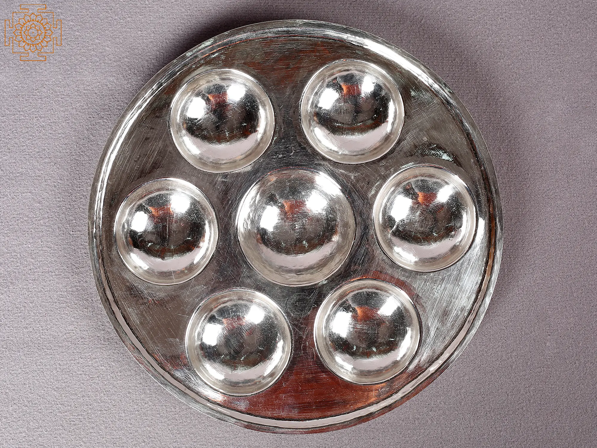 This Saptapala in Silver Pooja Thali is a popular ceremonial item in Nepal. The thali comprises seven scoops or depressions on a silver circular plate. The term saptapala derives from the words sapta, which means seven, and pala, which means a scoop-shaped structure containing seven scoops to hold the objects. This thali was designed to aid in the clean arrangement of ceremonial artifacts before giving them to the deities. The seven scoops allow the things to be positioned without being jumbled together. These Pooja Thalis are created in Nepal by talented craftsmen specializing in hand-hammered and smooth copper/silver/brass goods with intricate hand carvings. These silver-plated plates are extremely strong and will endure a long time.