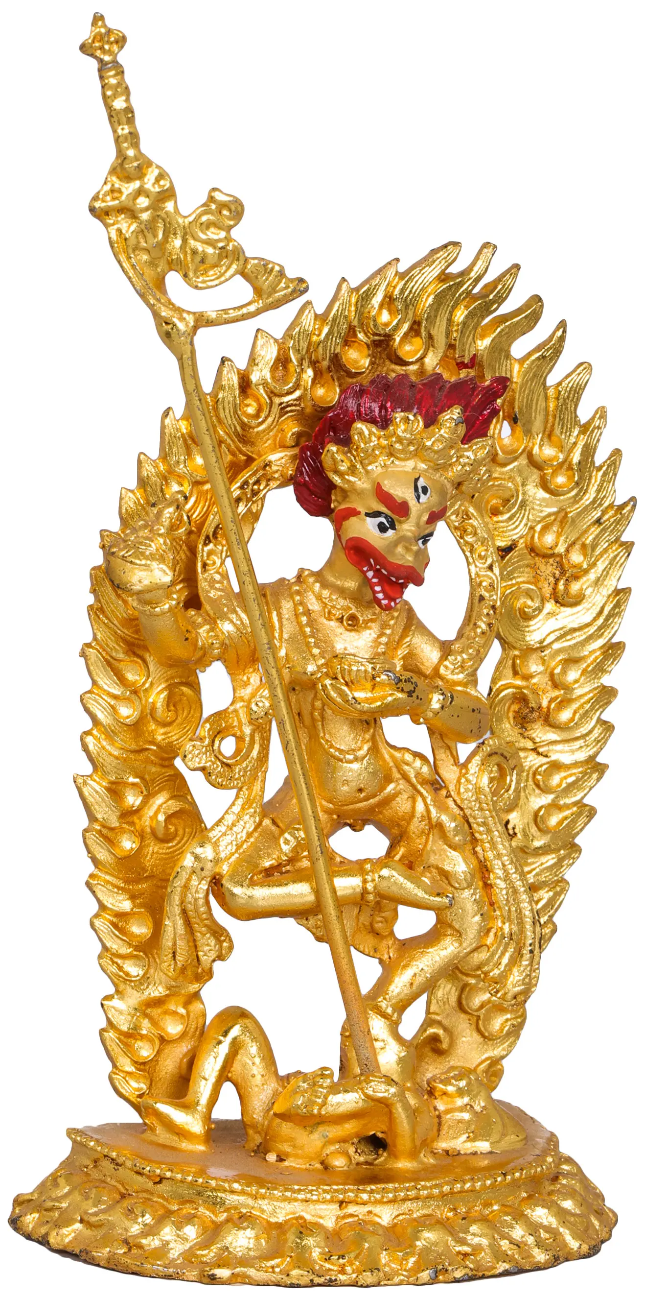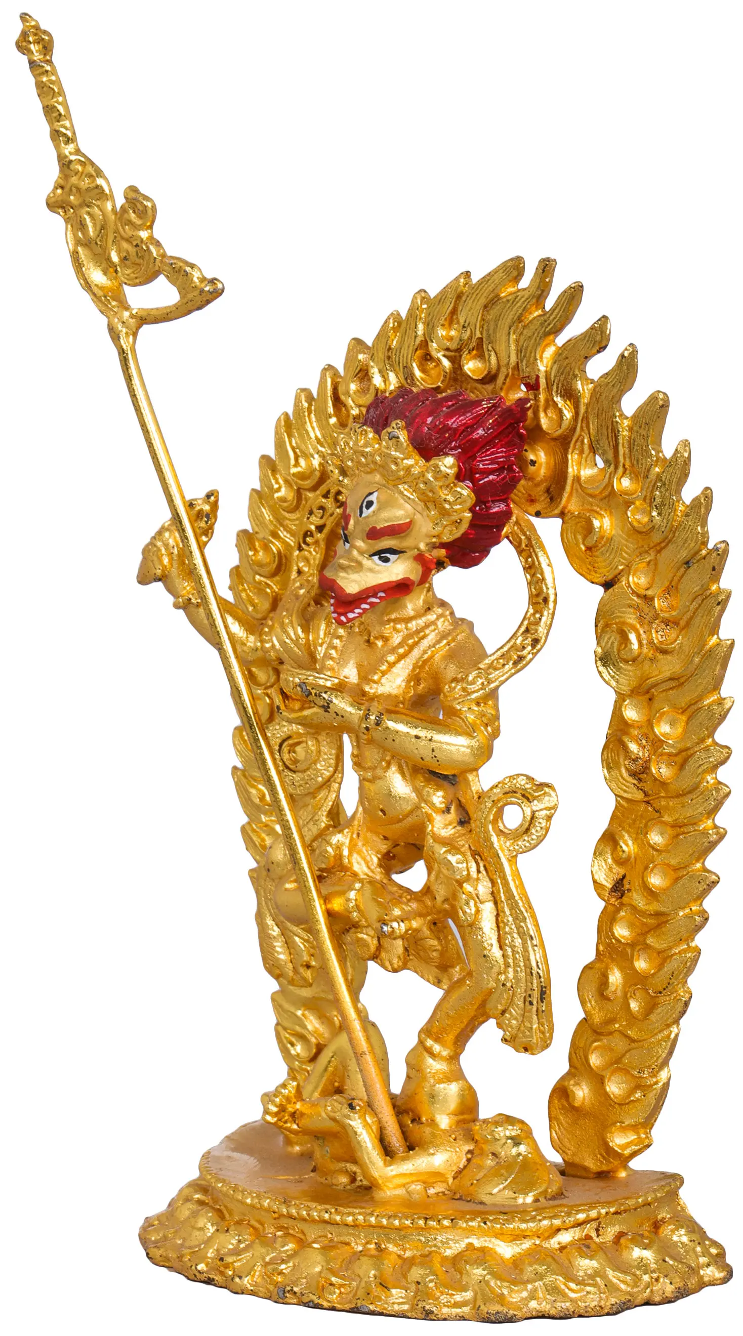 Now comes the most important part of Nepalese art which is gold gilding. This is done by the traditional fire gilding method. A mixture of mercury and 18K gold is applied on the surface of the statue and heat is applied using a flame torch. The result is that mercury evaporates along with impurities, leaving a pure 24K gold finish.