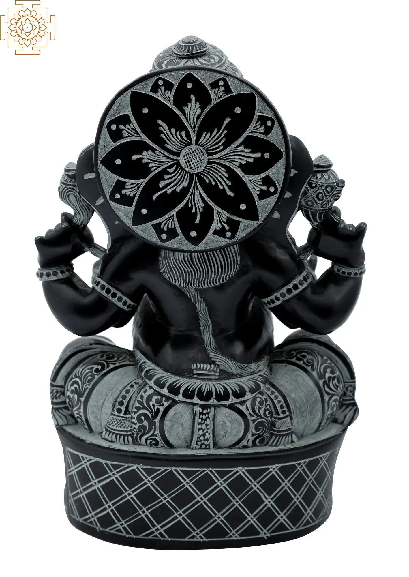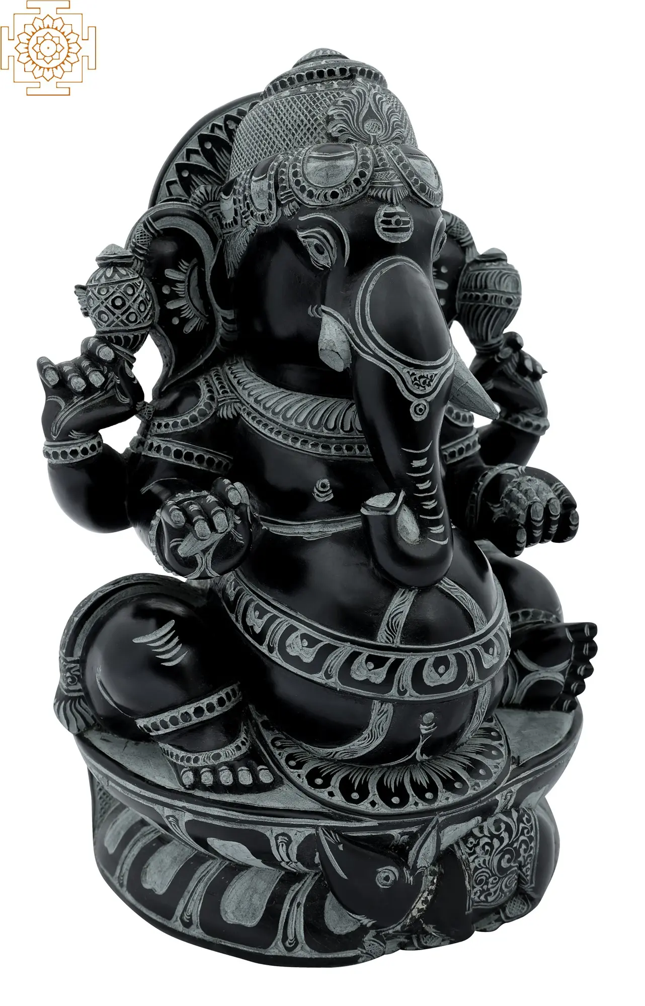 Shree Ganesha is extremely fond of eating Laddoos (round sweets), and holds one in the lower left hand, while the right hand holds the gesture of Varada Mudra. The upper left and right hands hold conch shell and a weapon.