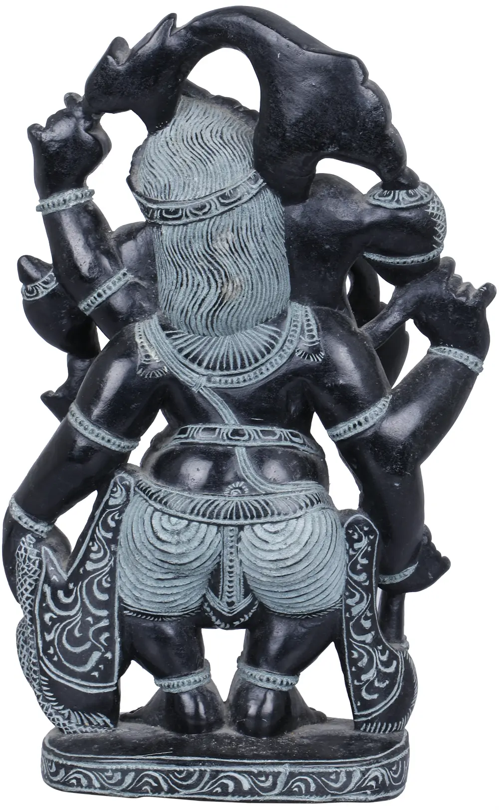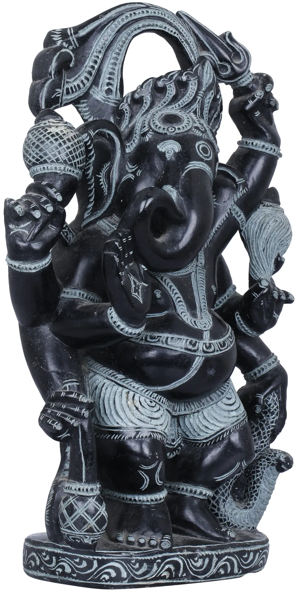 The uniqueness of this slender statue of standing Ganesha lies in the structure of his trunk that is descending downwards in width and the use of natural stones of diorite that is chiseled in great perfection to form his beautiful ornaments, accessories and attires. He stands in the nritya pose with the head tilted, as if dancing in his own rhythm and happiness.