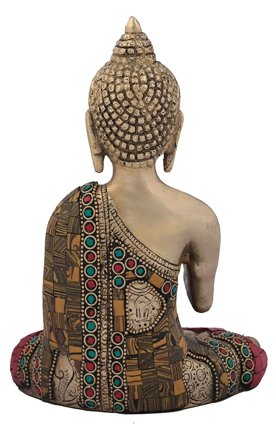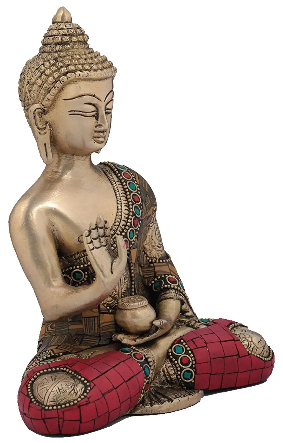 This statue is meticulously crafted from high-quality brass, a metal that has been revered for centuries in spiritual art for its durability and lustrous sheen. The intricate details of the Buddha's serene face, the gentle folds of his robe, and the symbolic urna on his forehead speak to the skill and devotion of the artisans who brought this piece to life. The robe is adorned with vibrant, inlaid embellishments of red and turquoise, adding a touch of opulence and visual richness. The base, adorned with a mosaic of red stones, provides a stable and beautiful foundation, further enhancing the statue's aesthetic appeal. The presence of a small alms bowl cradled in his other hand is also significant, representing the Buddha's humility and his commitment to supporting himself through spiritual practice and the generosity of others. ––––––––––––––––––