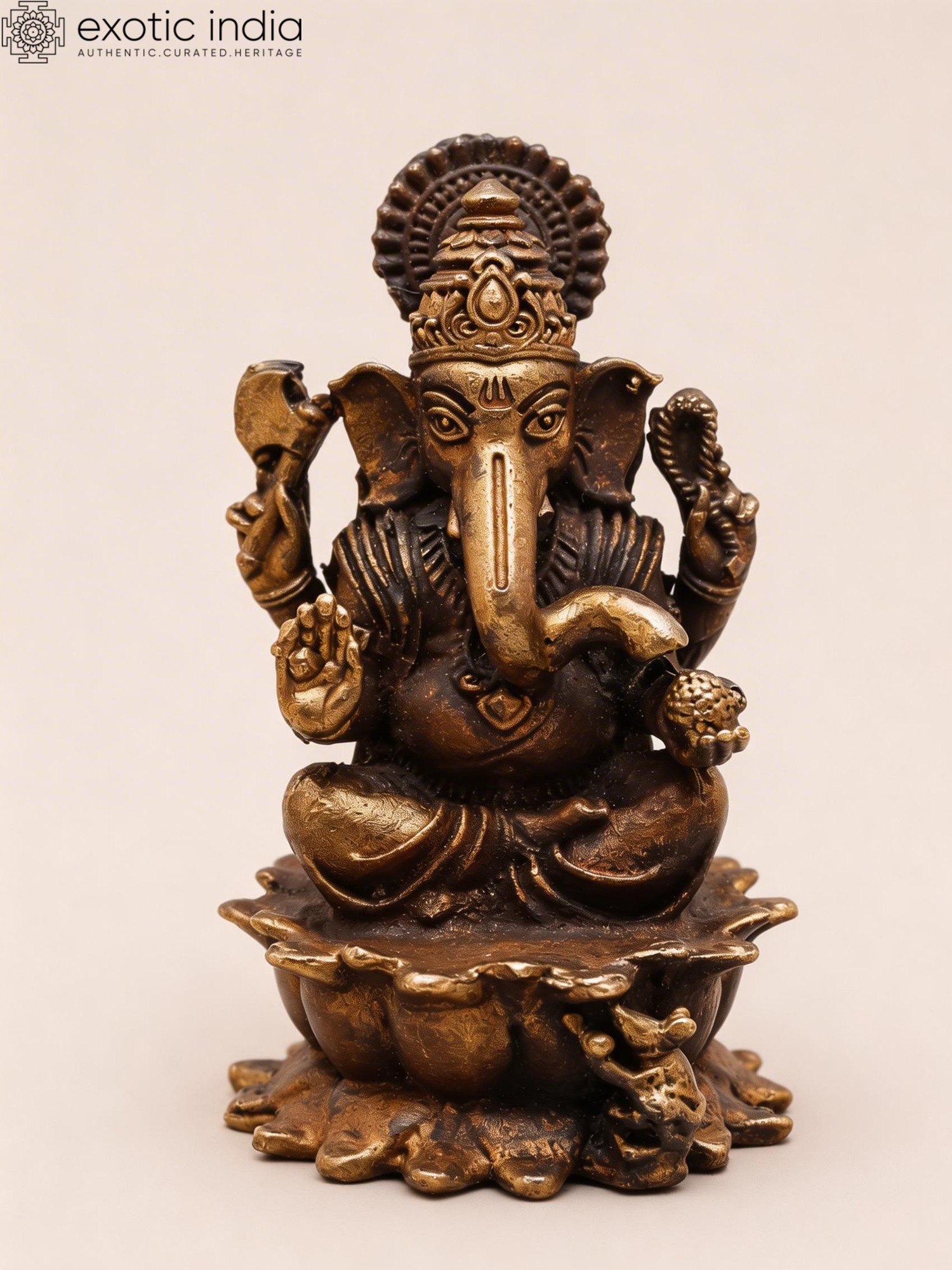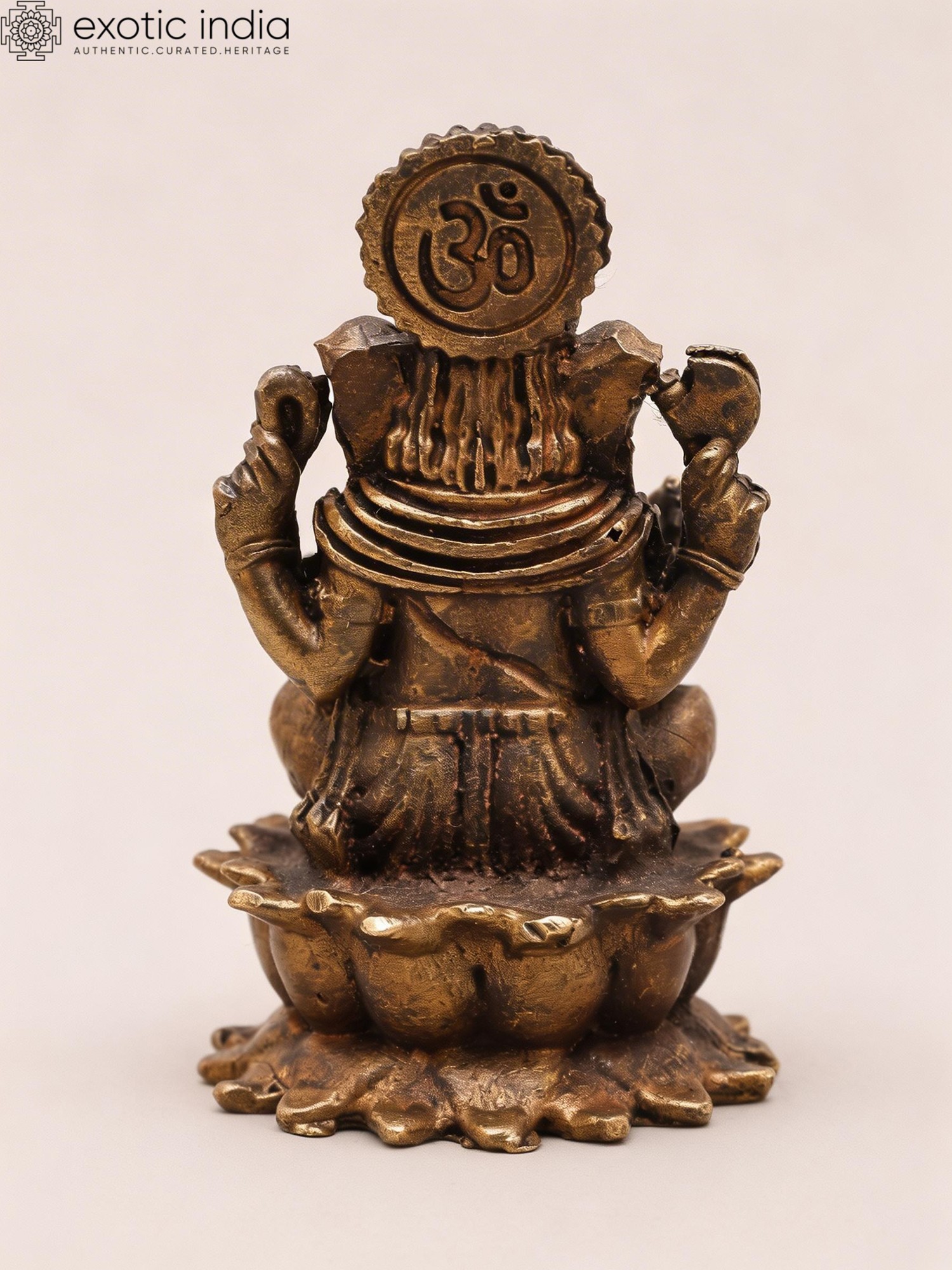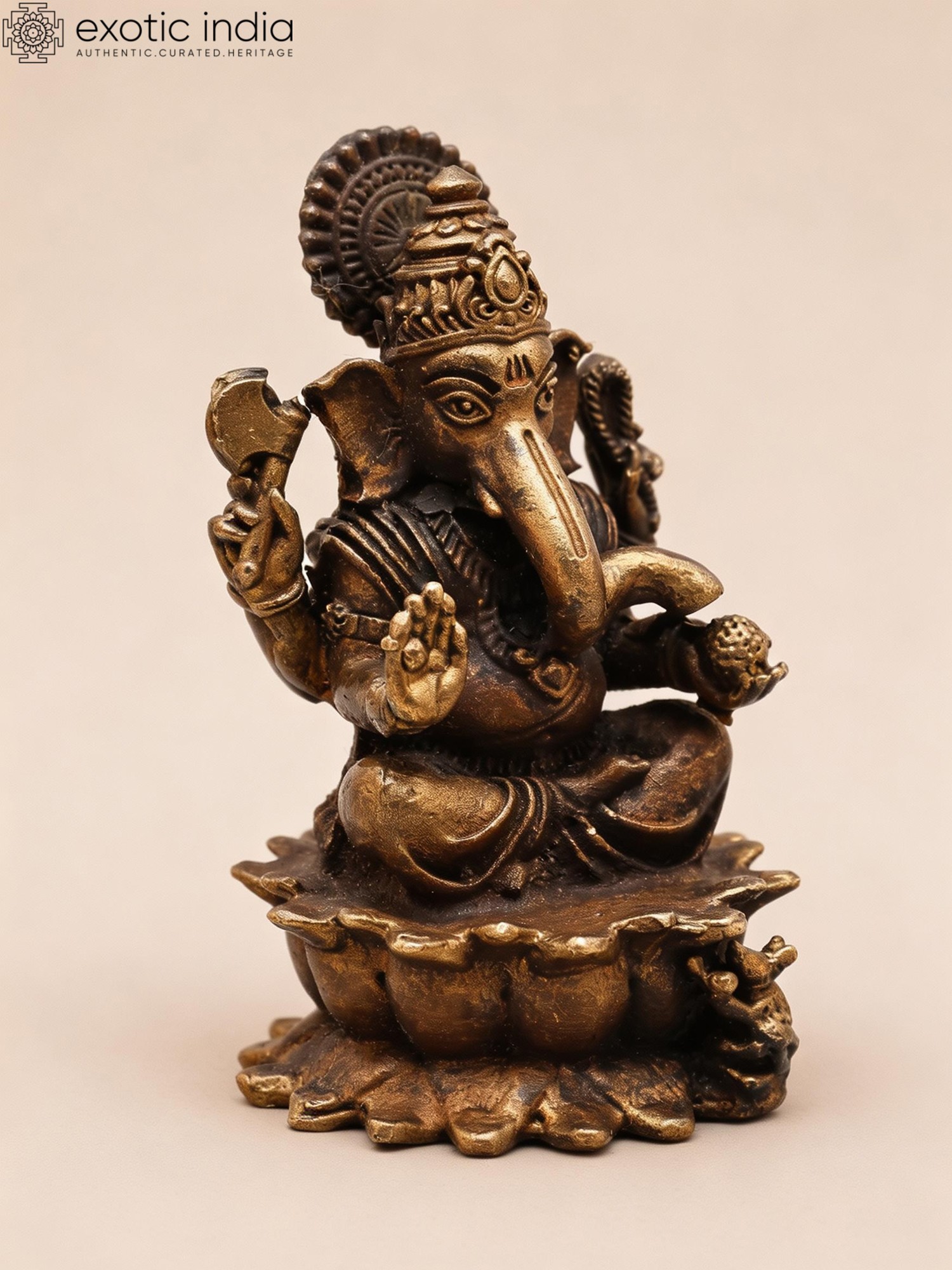 Small Copper Idol: Chaturbhuja Lord Ganesha on Lotus (3-inch)
