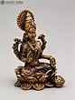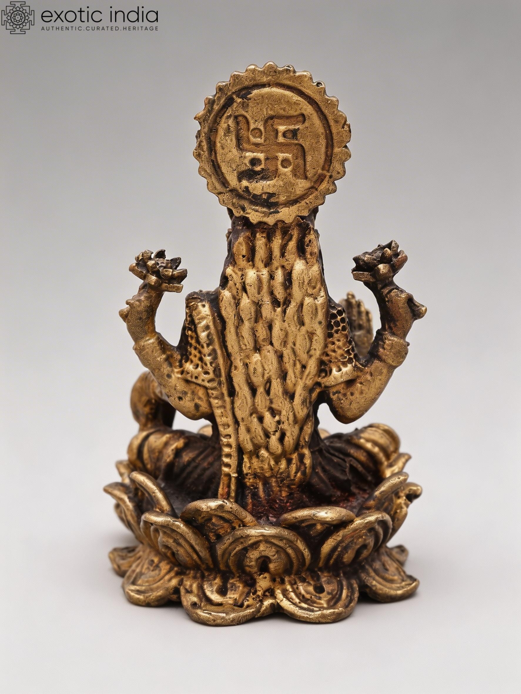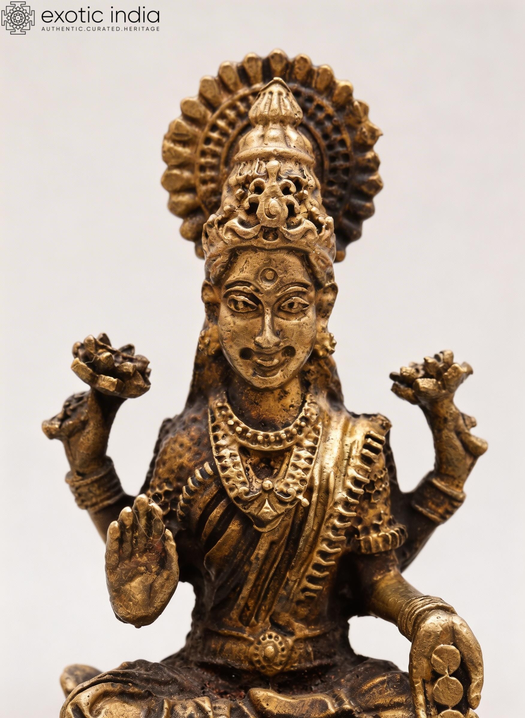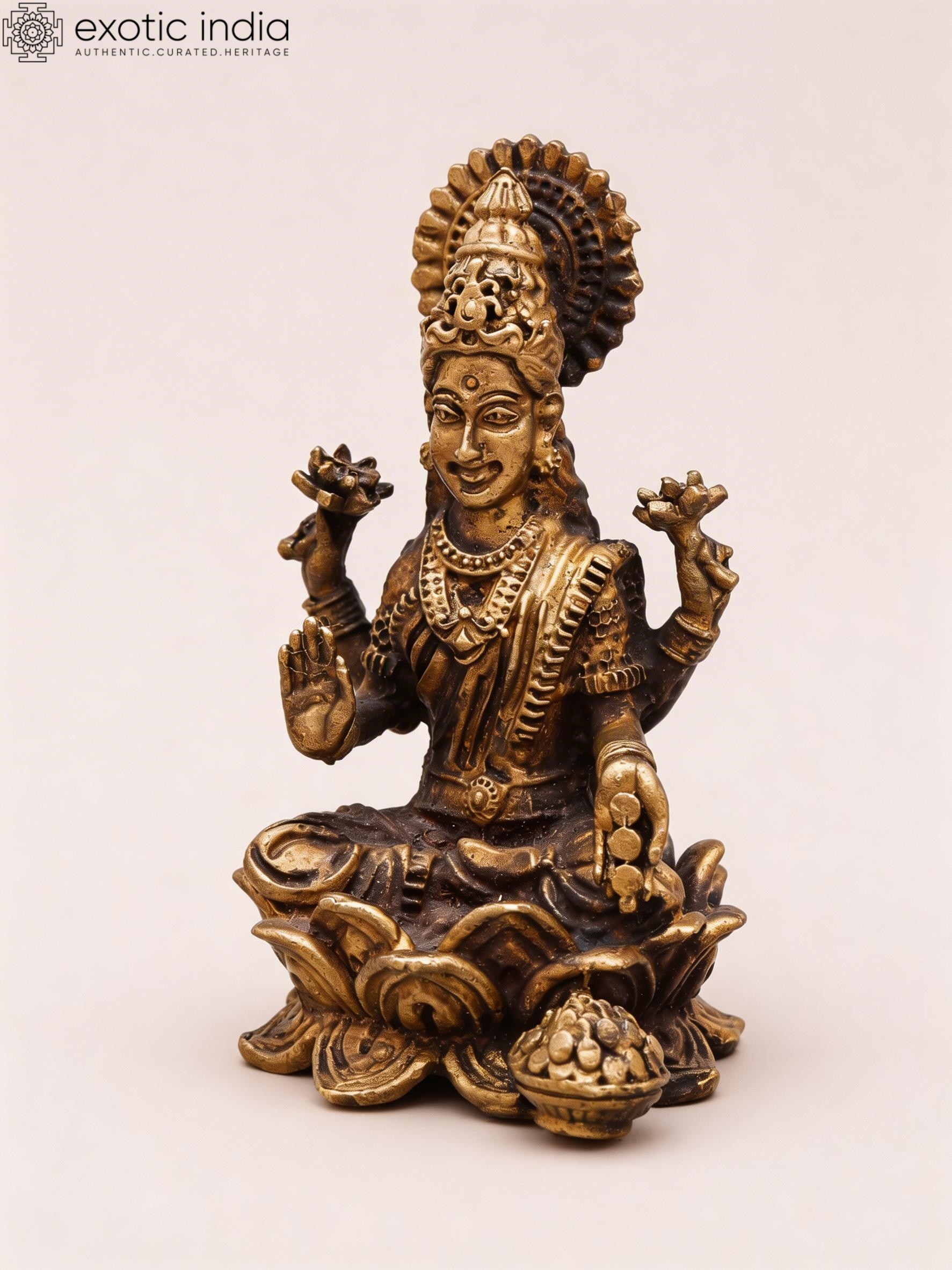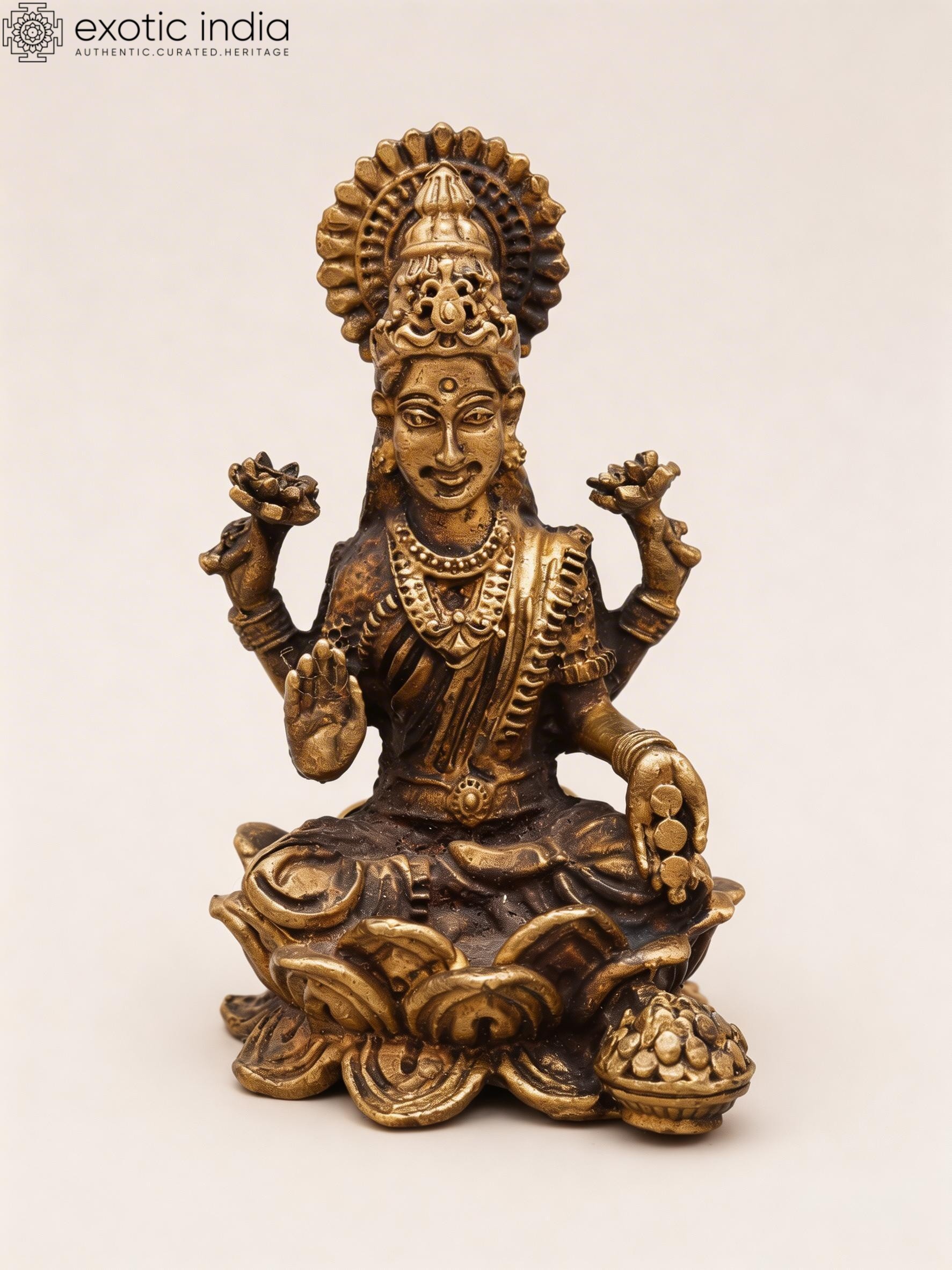 5" Small Four Armed Goddess Lakshmi Seated in Blessing Gesture | Copper Statue with Inlay Work