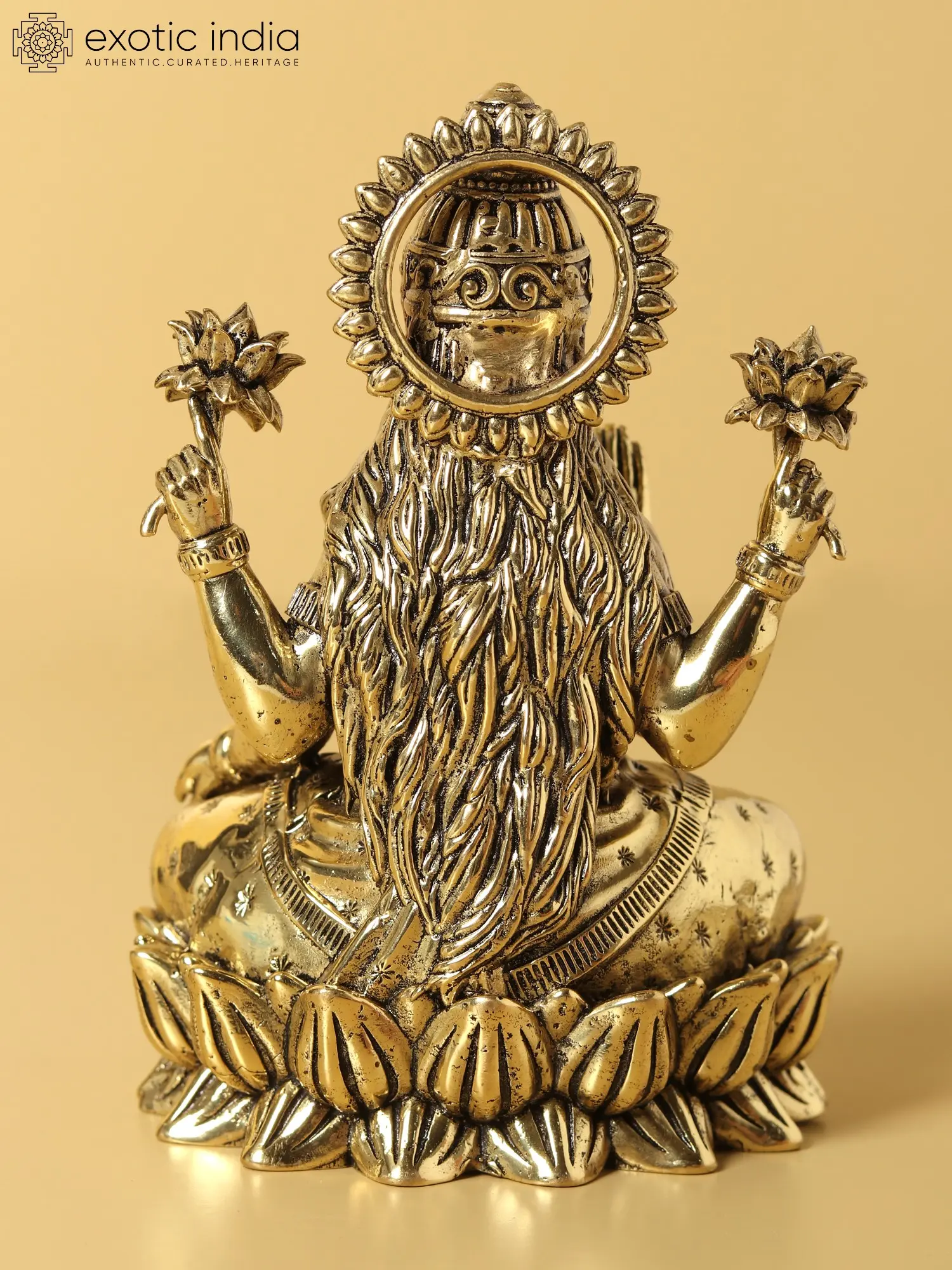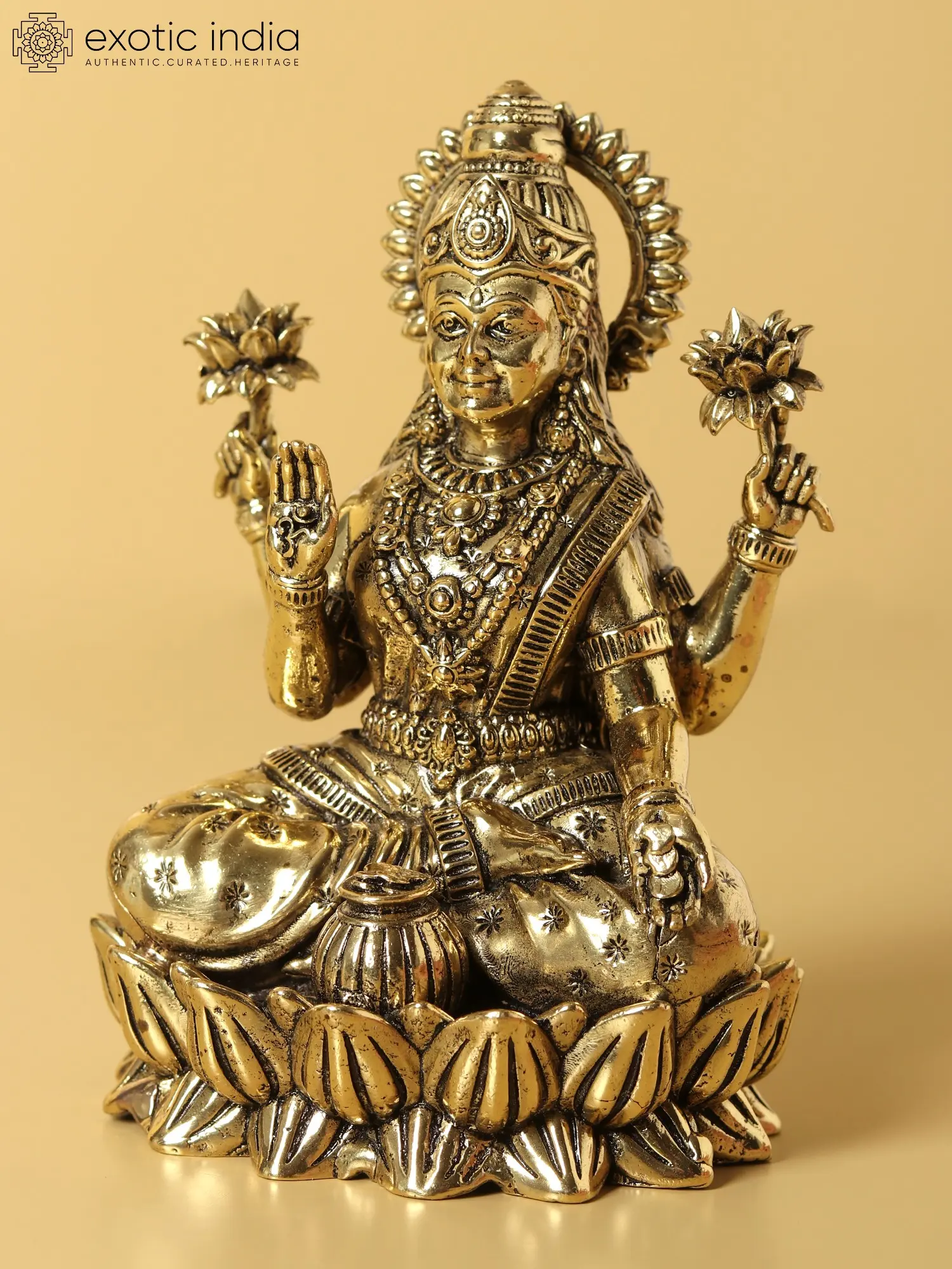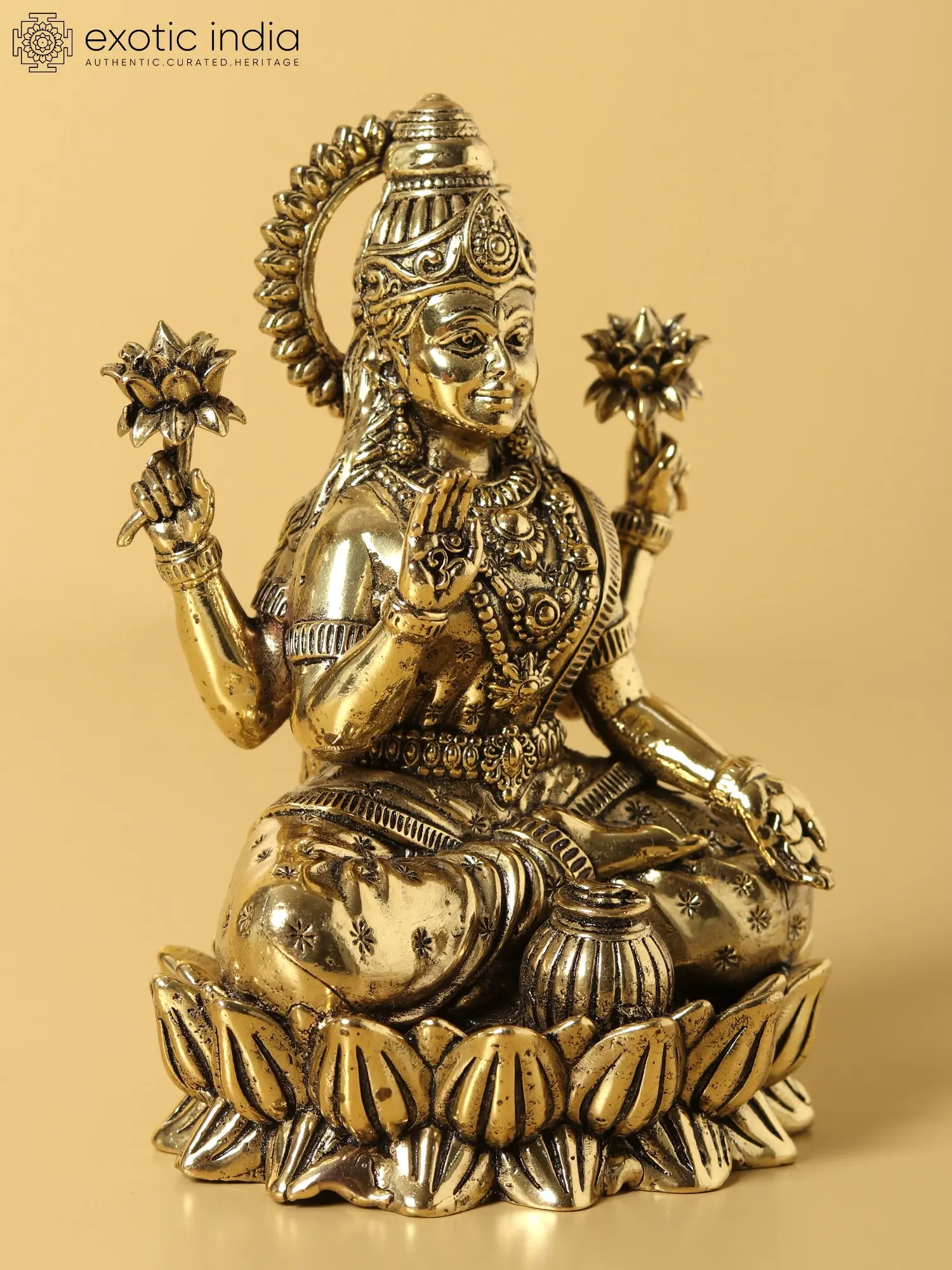 Goddess Lakshmi, a divine vision in Padmasana, radiates grace and opulence. Her upper hands cradle the lotus, symbolising purity, and transcendence, while her right hand is poised in Abhaya Mudra, signifying fearlessness and courage. Her left hand is in Varada Mudra imparts blessings. Draped in regal attire, she embodies beauty and prosperity. At her feet lies a pot of wealth, promising abundance to those who seek her blessings. This brass statue, a masterpiece of artistry, signifies the embodiment of wealth, both material and spiritual. It invites us to embrace her presence and invokes the blessings of prosperity and grace into our lives. Goddess Lakshmi, the eternal symbol of abundance, illuminates our souls.