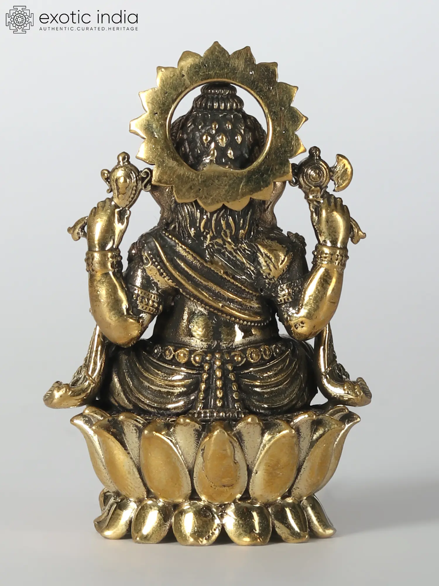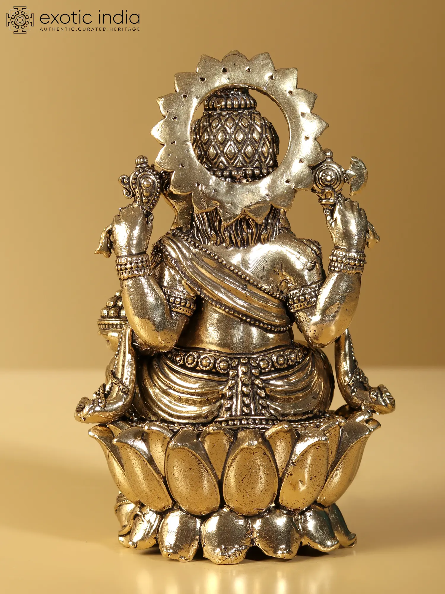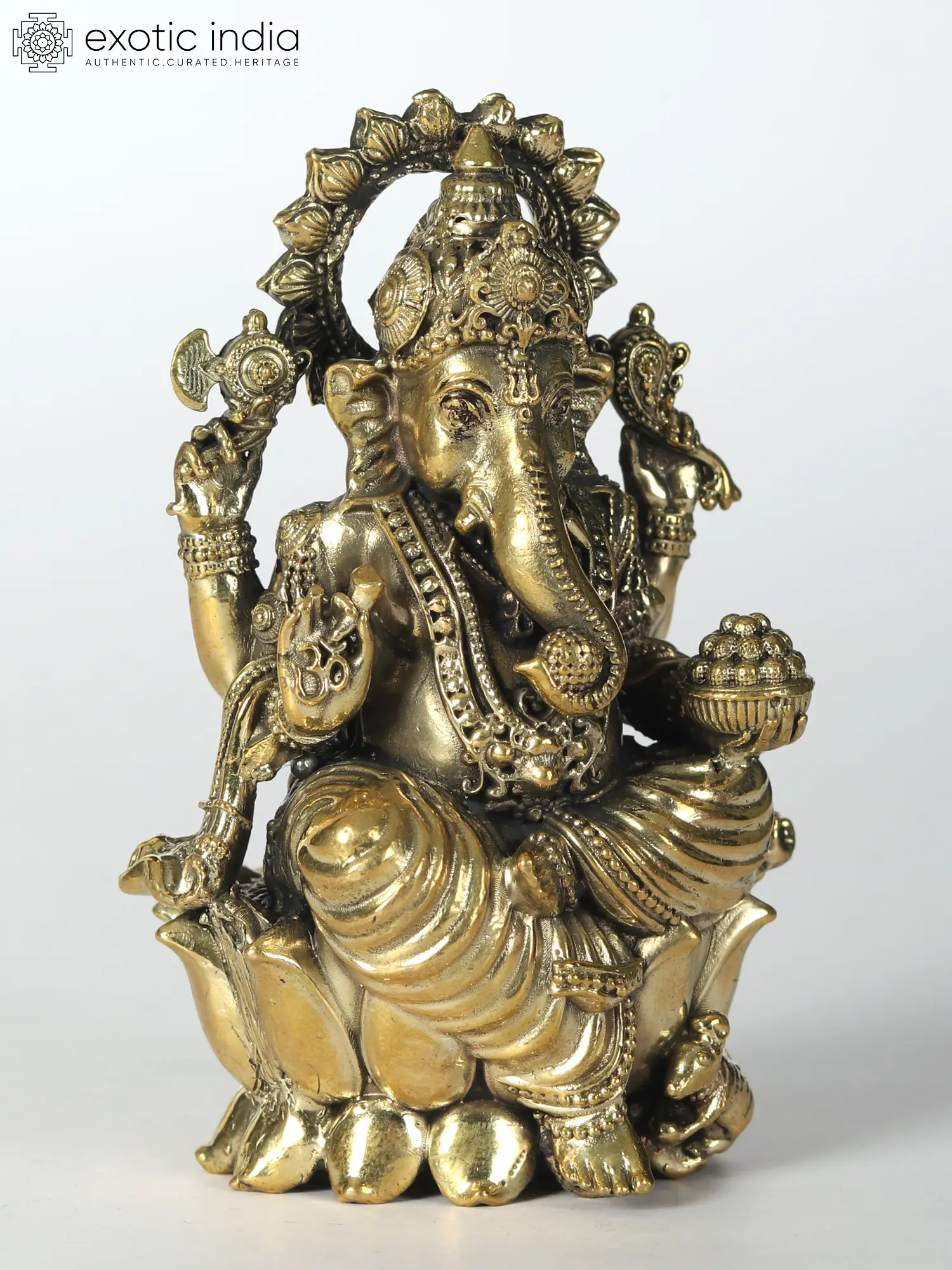 Cast in premium brass, Lord Ganesha is depicted seated in lalitasana on a lotus flower (padma), symbolising his grounding presence and spiritual growth. His four hands hold various symbolic objects, typically including a sweet modak (dumpling) for wisdom, an axe (parashu) to overcome obstacles, a lotus (padma) for spiritual abundance, and a rope (pasha) to capture negativity, accompanied by his mount (mushaka).