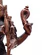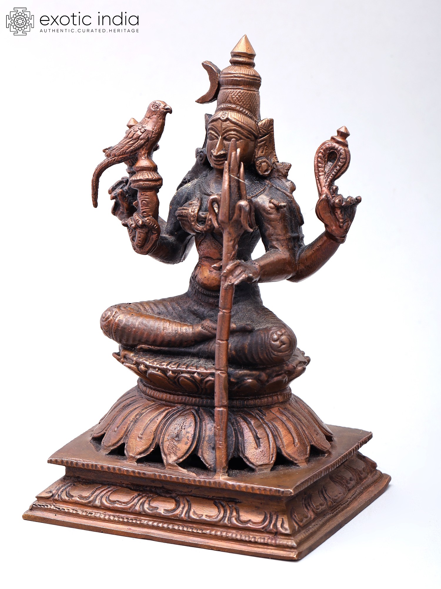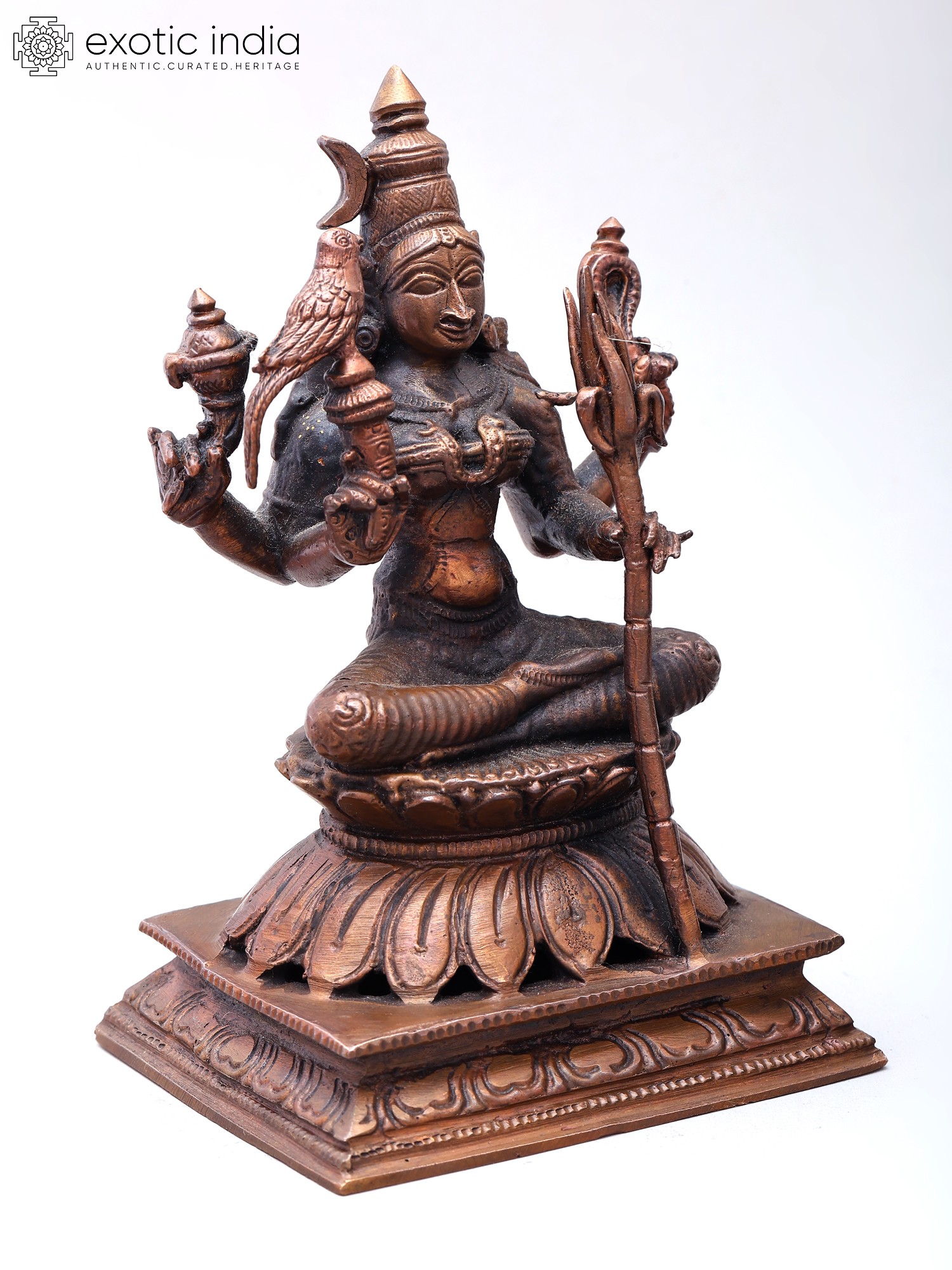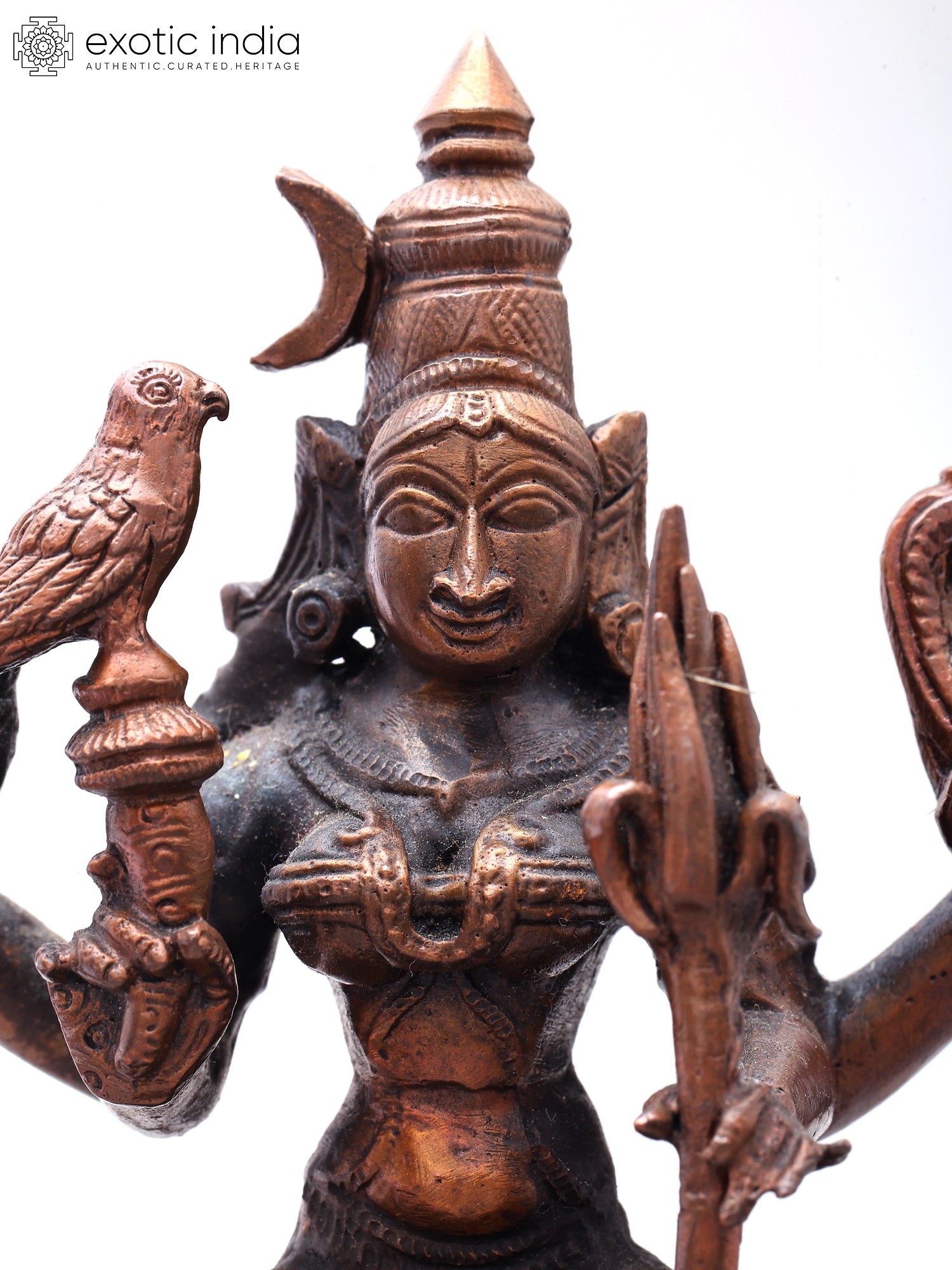 Features iconography such as a bird, a serpent, and a trident, signifying her attributes.