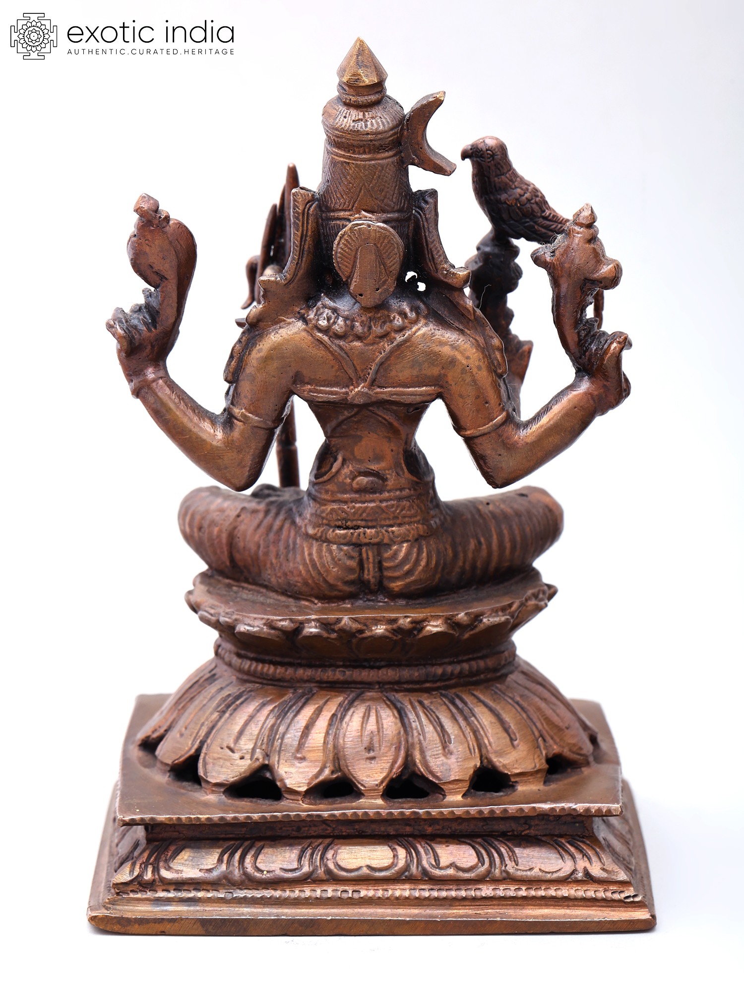 The statue is seated on a lotus base, symbolizing purity and spiritual ascent.