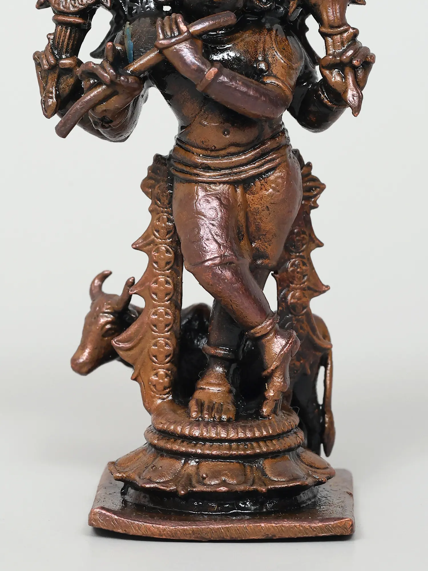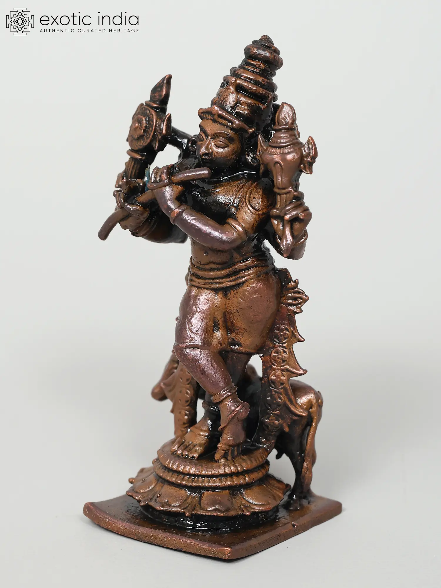 One of the most well-known and captivating representations of the dark-skinned lord in Hinduism is "Venugopala," in which Krishna appears as the pala (protector) of Go (cows and cattle), playing enchanting songs on his flute known as "Venu". The artist has gloriously embellished Krishna in this wooden Venugopala murti, who adopts his recognizable "Tribhanga" (triple bending) pose. This form of Sri Krishna is a heavenly four-armed (Chaturbhuja) aspect of Venugopala. This representation of Sri Krishna in art is the idea of Krishna as the Universal Cowherd God, leading the innumerable masses of living beings through the ocean of existence (Bhava Sagara), with the tunes of his Venu acting as the guiding strings to the souls.