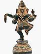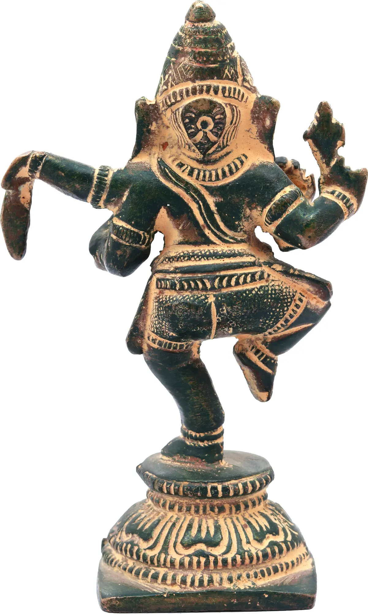 This captivating Ganesha statue is meticulously crafted from high-quality brass, a metal revered for its durability and lustrous appeal. The artist has masterfully captured the divine energy of Ganesha in his energetic dance. The dark patina that graces the statue's form highlights the sculpted contours, giving it a timeless and antique feel. Each element, from the ornate headdress to the delicate jewelry and the intricately carved base, speaks of skilled hands and a deep understanding of sacred iconography. The dynamic posture, with one leg raised and arms outstretched, conveys a sense of movement and vivacity, making the deity seem almost alive. The fine detailing on his garments and the expressive features of his face invite contemplation and devotion. This piece is not merely a decorative item but a tangible embodiment of spiritual devotion and artistic excellence.
