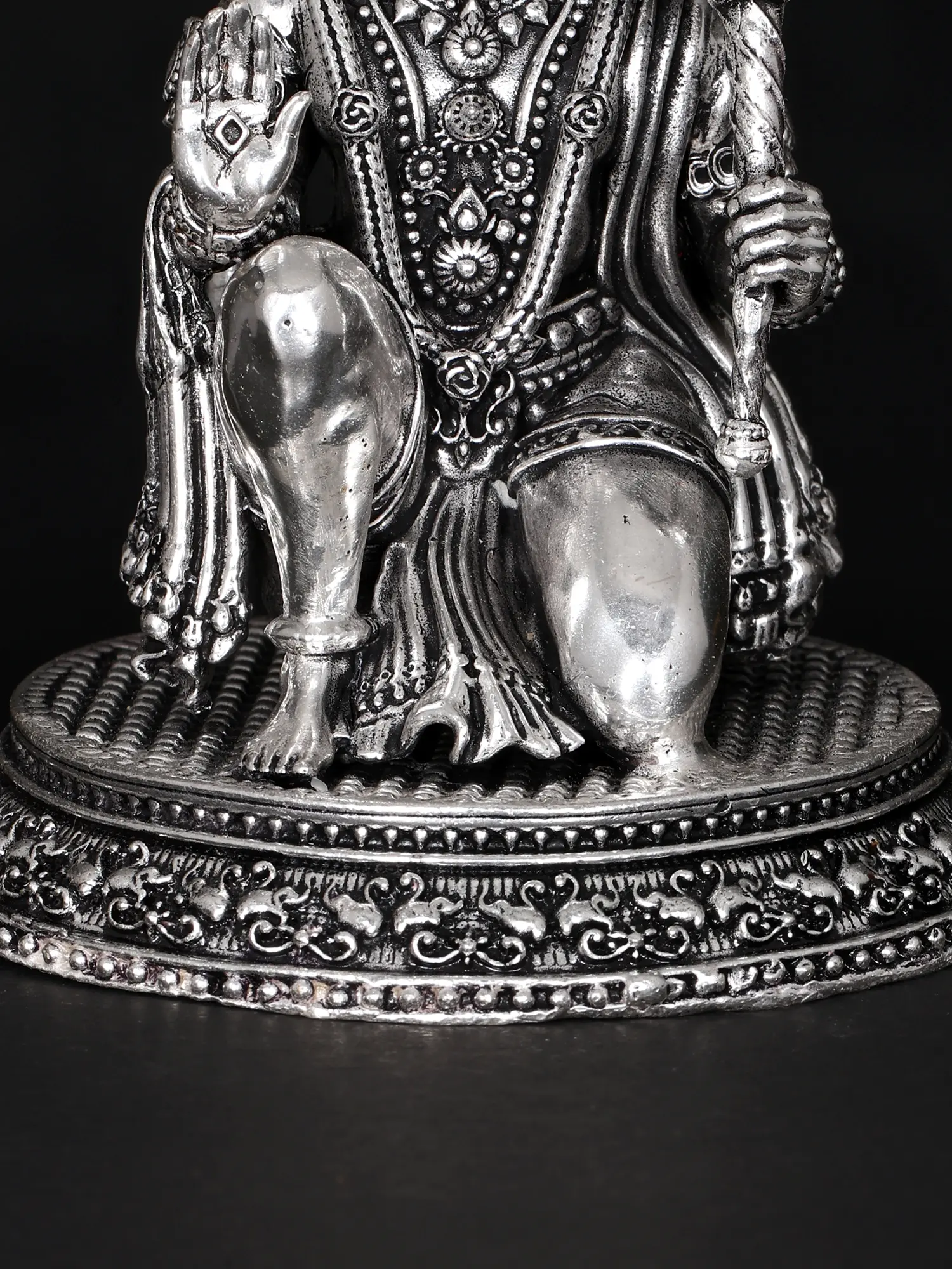 In the quiet stillness of divine reverence, “Lord Hanuman”, also known as “Maruti”, the embodiment of unwavering devotion, takes form in this captivating brass statue. Seated upon one knee, his figure exudes regal aura. His mighty mace, the emblem of strength, cradled in his left hand, gleams with authority. But it is his right hand, poised in “Ashirwad Mudra”, the gesture of benediction, that enchants the beholder. With eyes full of grace, He imparts blessings that transcend time and space, an eternal symbol of protection and guidance. Adorned in majestic attire, Lord Hanuman’s presence invokes a profound sense of awe and serenity.