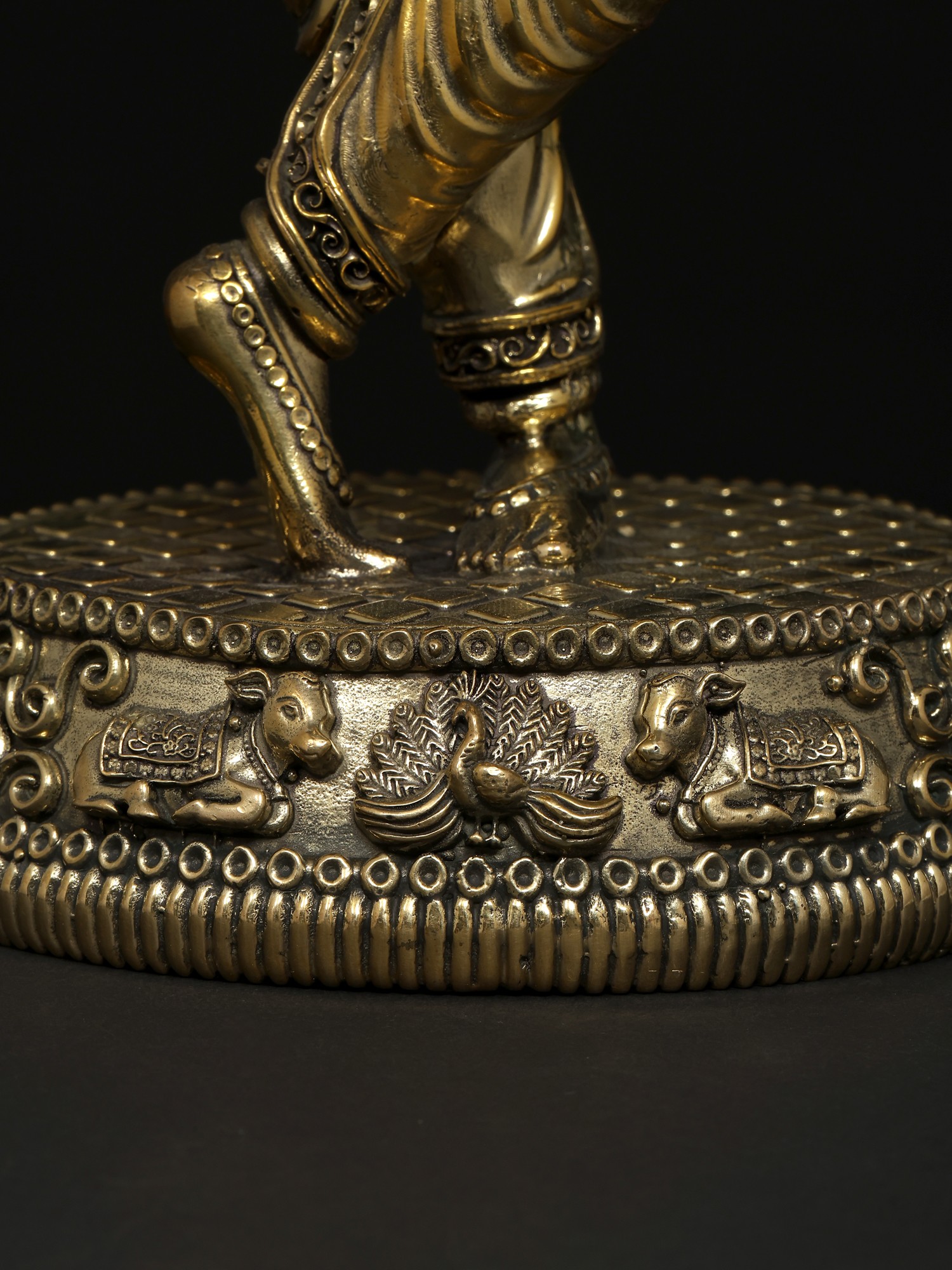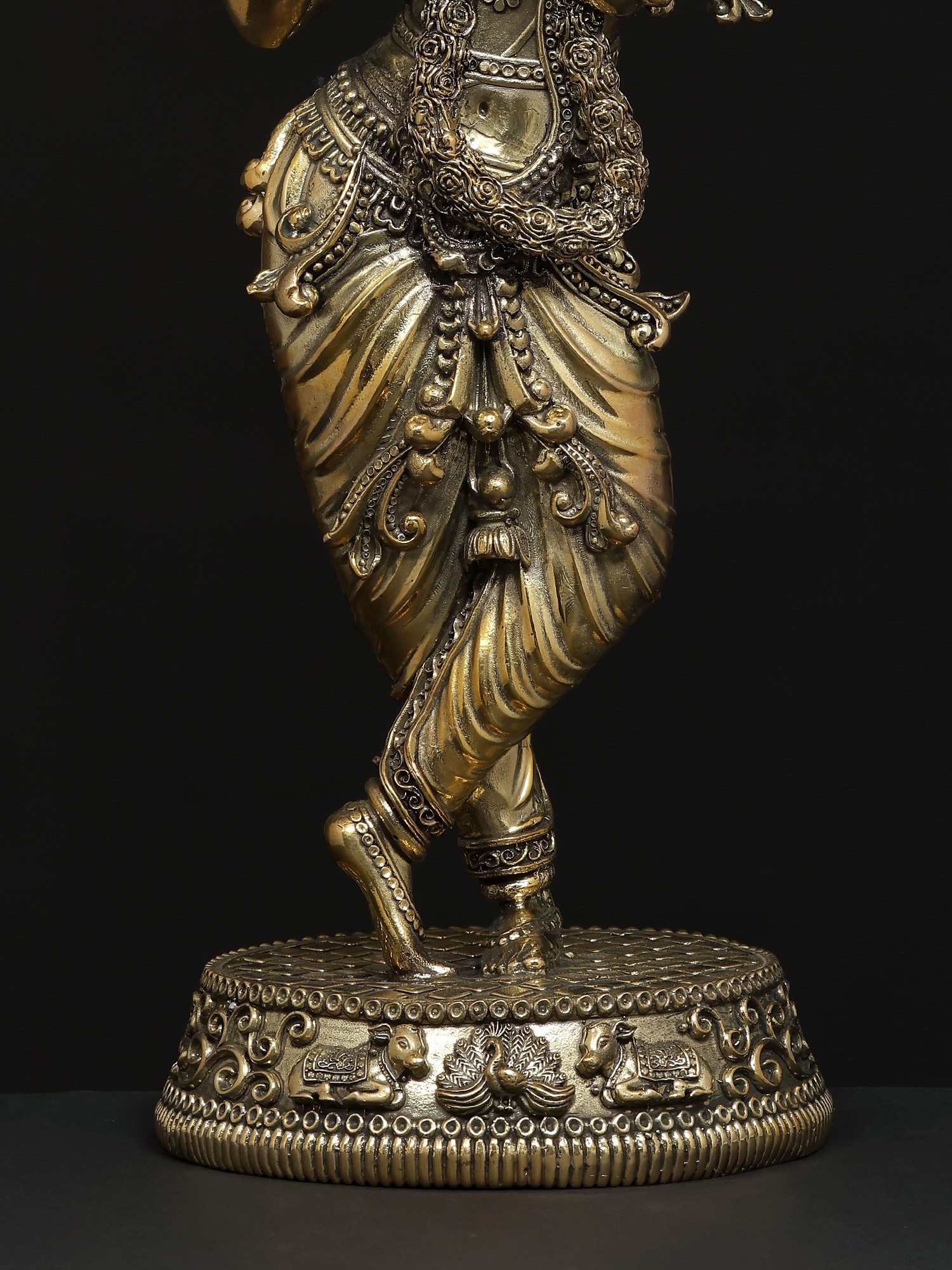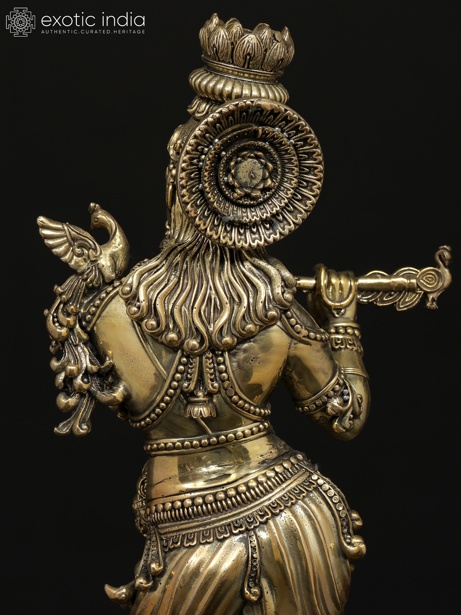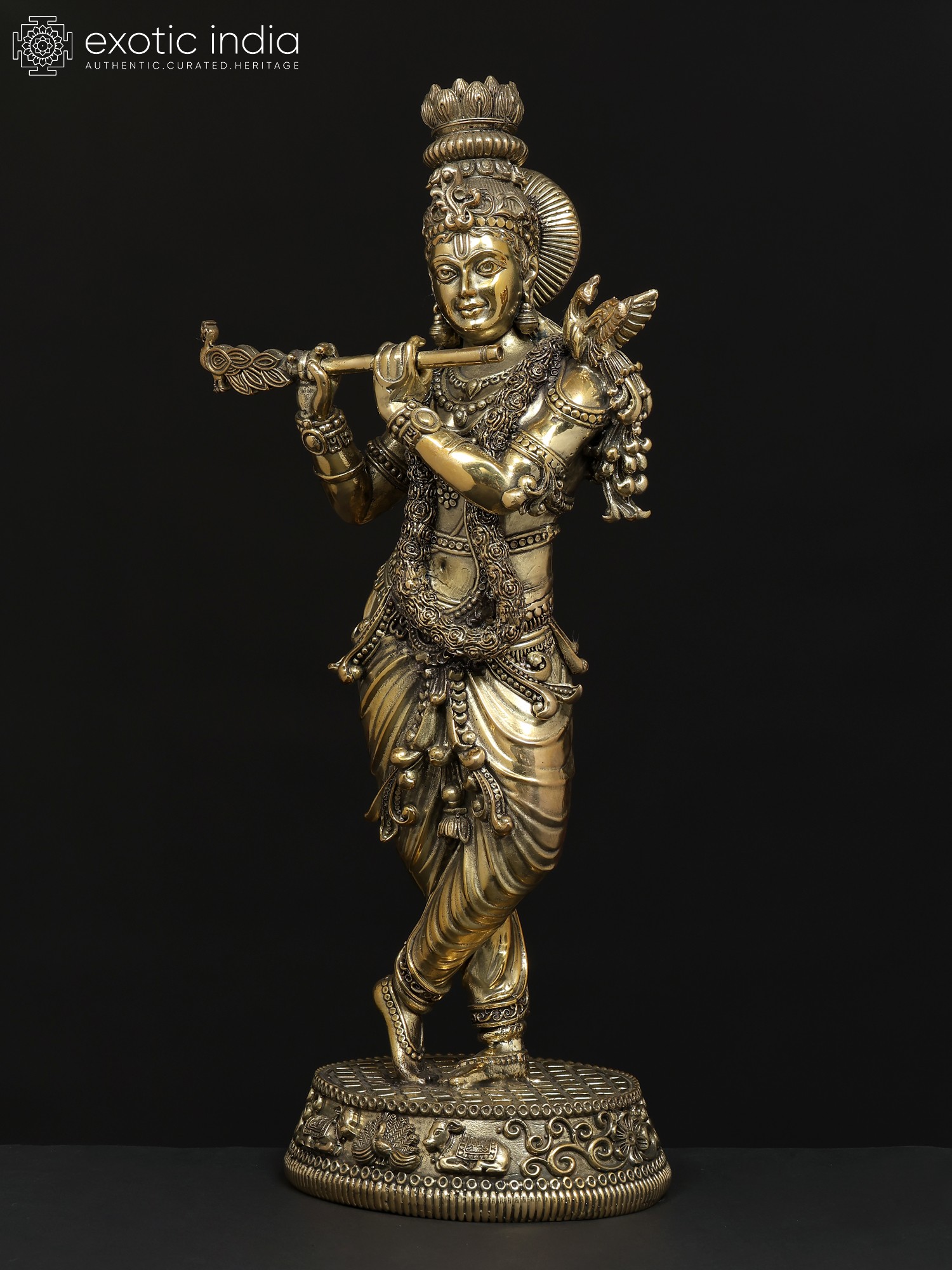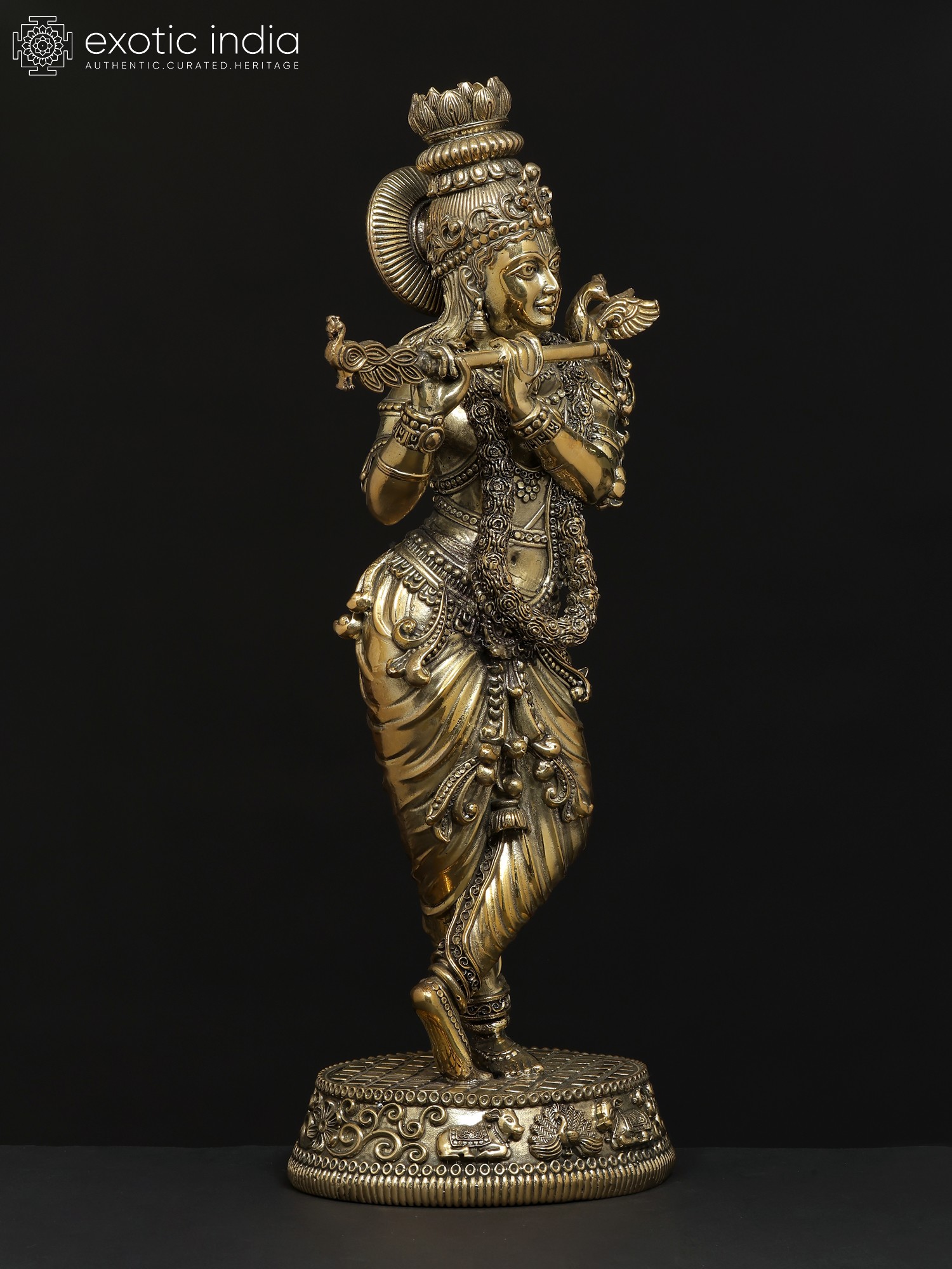 Introducing a magnificent brass sculpture capturing the divine essence of Lord Krishna, this intricately crafted statue radiates grace and charm. With exquisite attention to detail, it portrays the beloved deity in a serene and enchanting pose, evoking a sense of reverence and devotion.