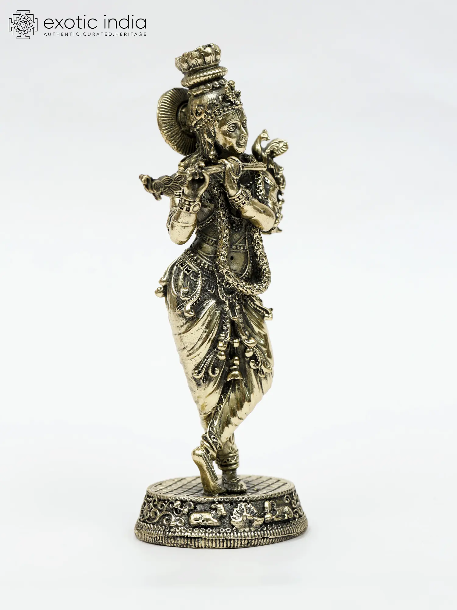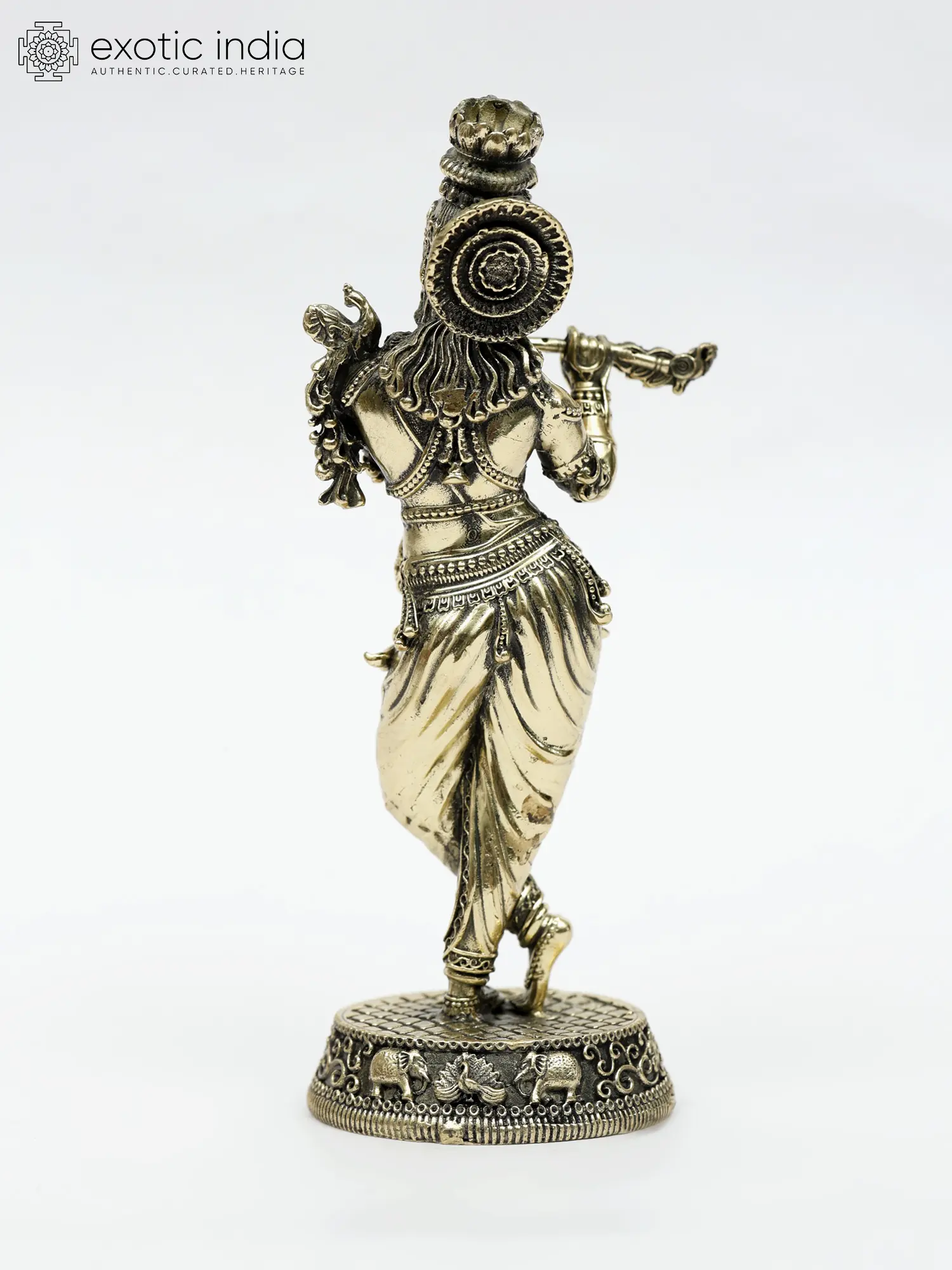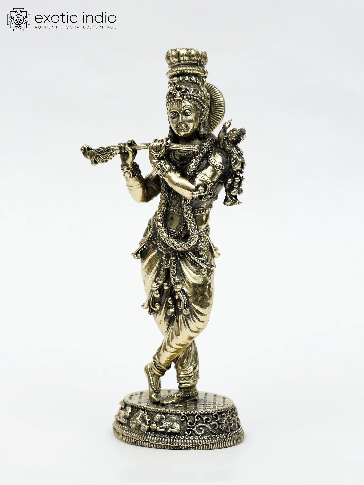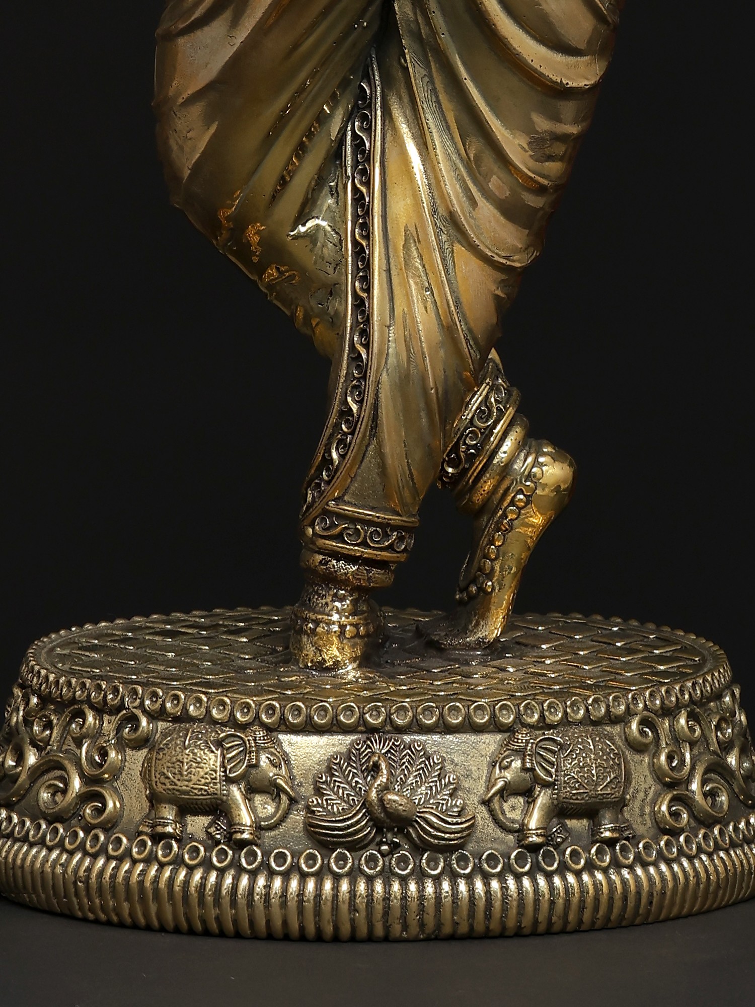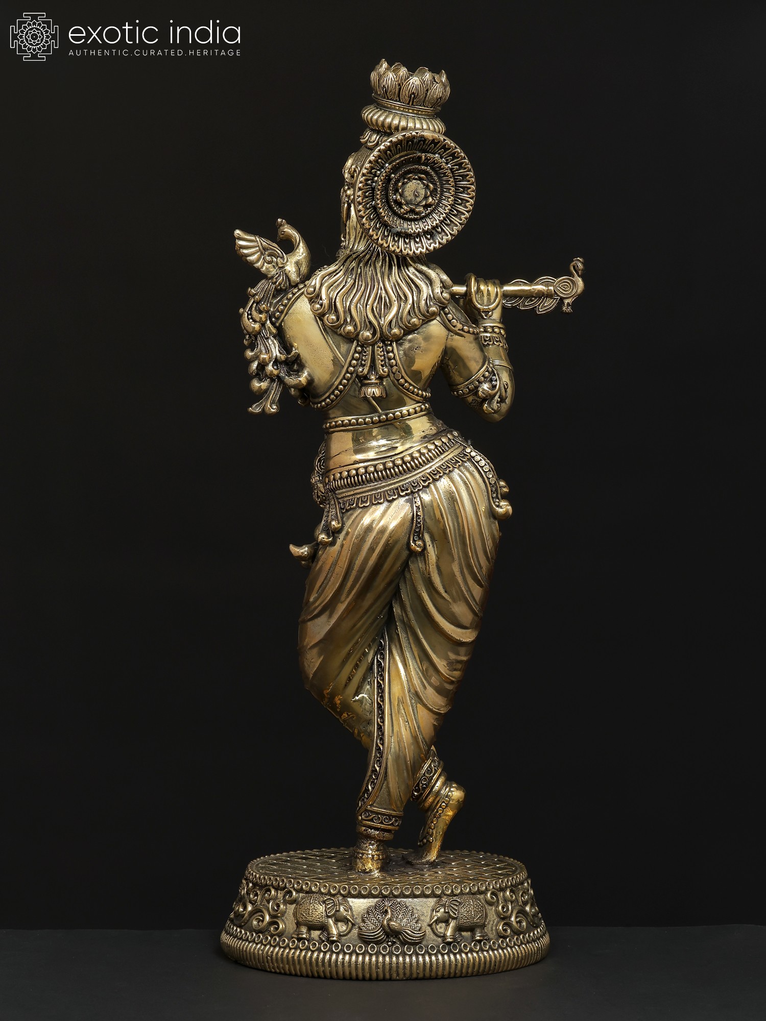 Introducing a magnificent brass sculpture capturing the divine essence of Lord Krishna, this intricately crafted statue radiates grace and charm. With exquisite attention to detail, it portrays the beloved deity in a serene and enchanting pose, evoking a sense of reverence and devotion.
