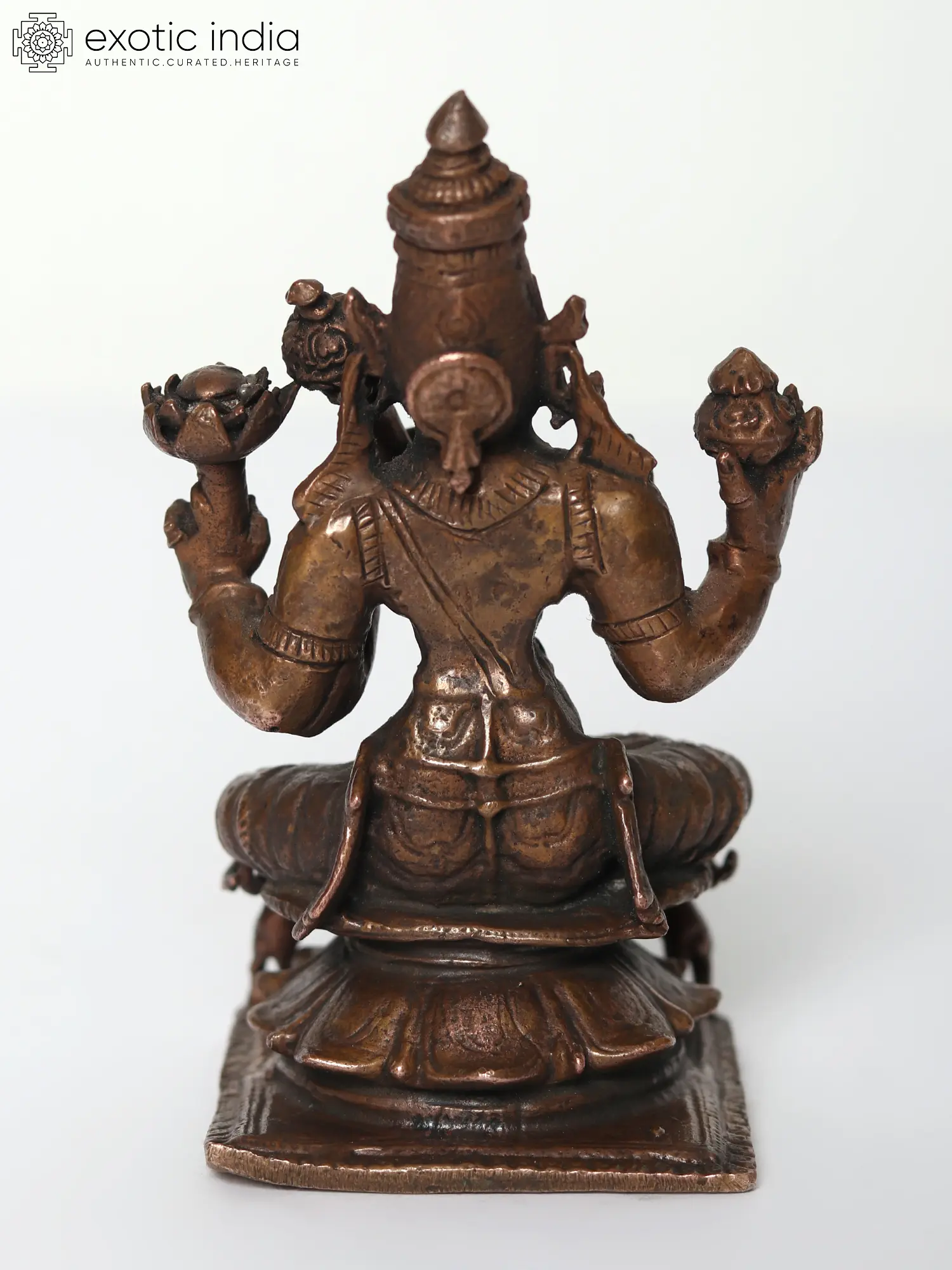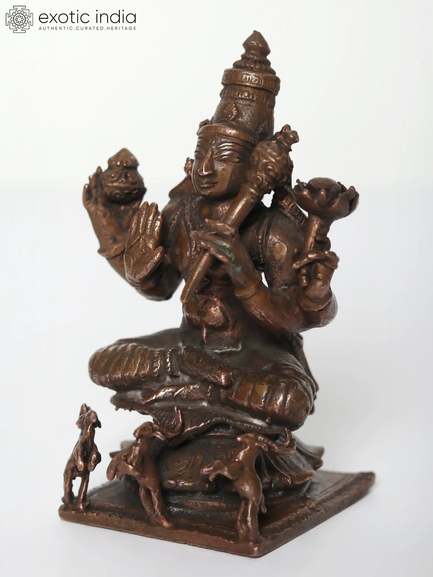 The Small Lord Chandra Dev Statue in Copper is a sublime embodiment of the celestial grace of the Moon God. The Srimad Bhagavat states that ChandraDev, or the Moon, is the son of Maharishi Atri and Anasuya. Moon has sixteen arts at her disposal. He is a kind, compassionate, nectarine, and masculine deity. This handcrafted idol, made with fine quality copper displays the traditional iconography of Chandra Dev where he holds the Soma pitcher in one hand and a lotus and Mace in the other two hands.