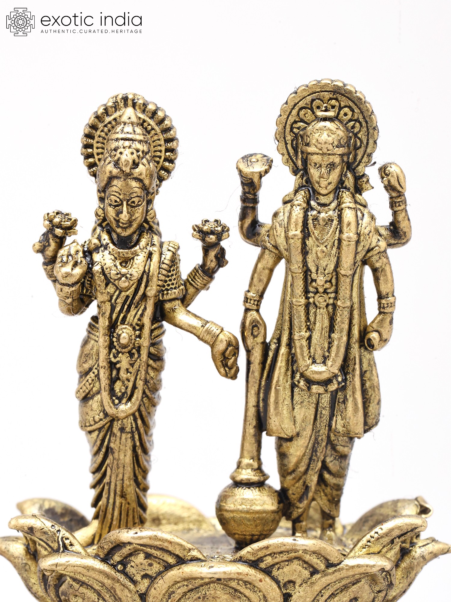 The figures stand gracefully upon a meticulously sculpted lotus, a symbol of purity and spiritual awakening. Lord Vishnu's serene countenance is complemented by Goddess Lakshmi's benevolent gaze, their forms elegantly adorned with traditional motifs. The intricate details, such as the divine halos and the subtle texture of their garments, contribute to an aura of profound beauty and divine presence.