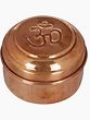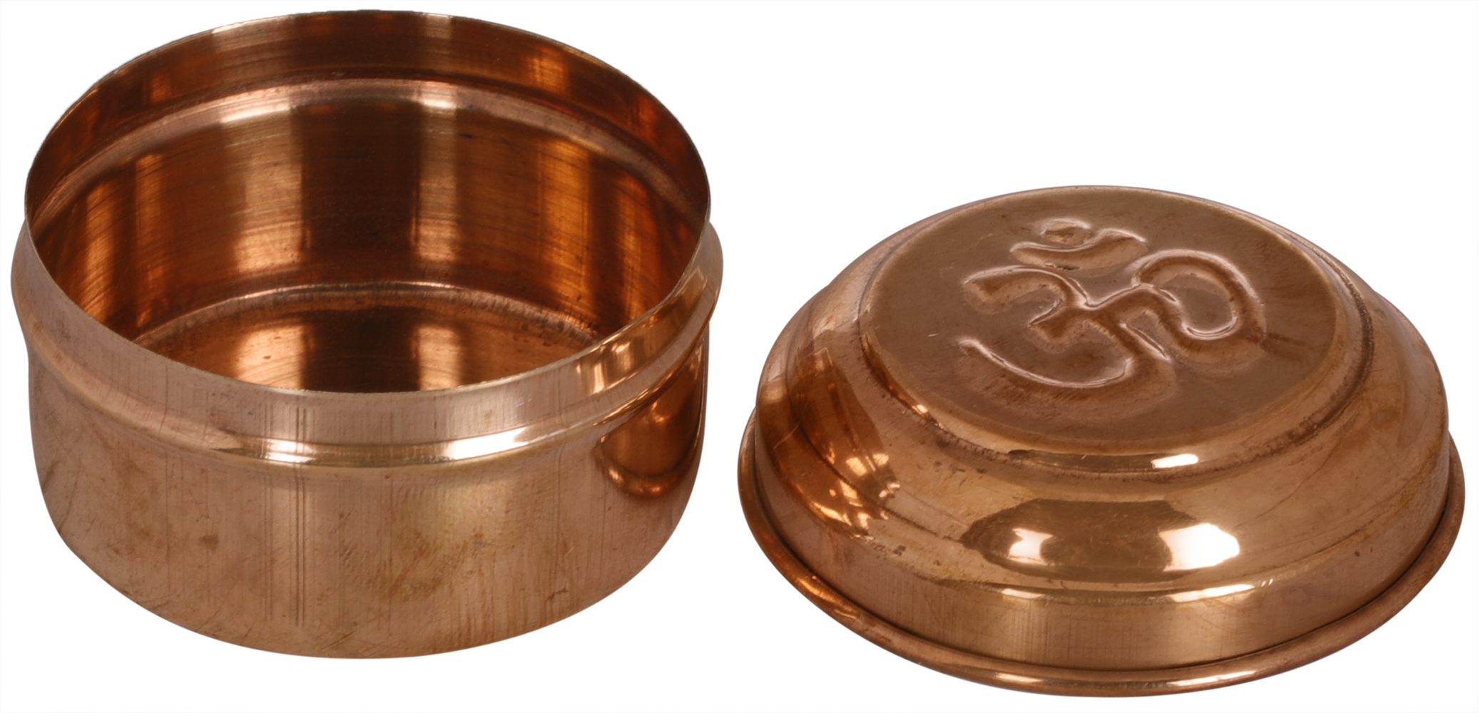 This exquisitely crafted copper box from South India serves as a miniature repository of profound spiritual significance. The circular lid is adorned with the universally recognized Om symbol, a sacred sound and spiritual icon in Dharmic religions. In Hinduism, Om is considered the primordial sound of creation, the essence of the universe, and the sound from which all other sounds emanate. It is believed to represent the ultimate reality, the Brahman, and the consciousness that permeates all existence. Chanting Om is a central practice in yoga and meditation, intended to quiet the mind, connect with the divine, and foster inner peace. This box, therefore, is not merely a container but a tangible reminder of this foundational spiritual principle.