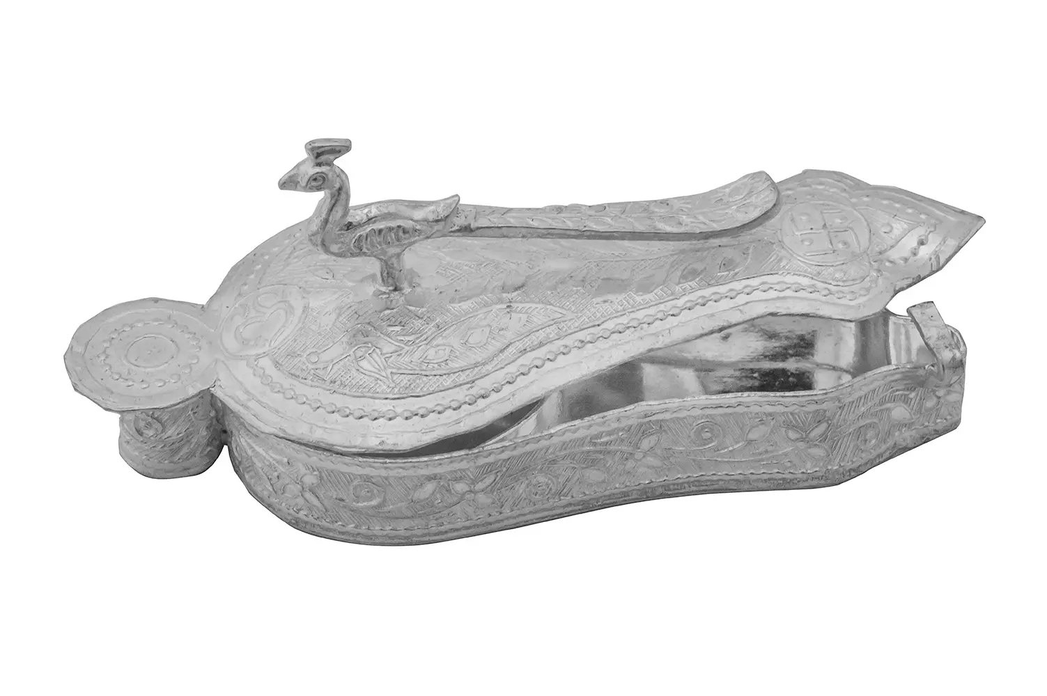 This majestic Peacock Ritual Box in silver has a one-of-a-kind design. Its lid is adorned with an elegant swastika and Om emblem, representing auspiciousness and optimism. The striking element is the upright peacock handle, representing beauty and elegance. This box is a sacred container for kumkum, a bright crimson powder used in Hindu ceremonies to record blessings, apply tilak, and seek heavenly blessings on essential occasions. This box lends refinement to holy traditions by combining craftsmanship and spirituality.