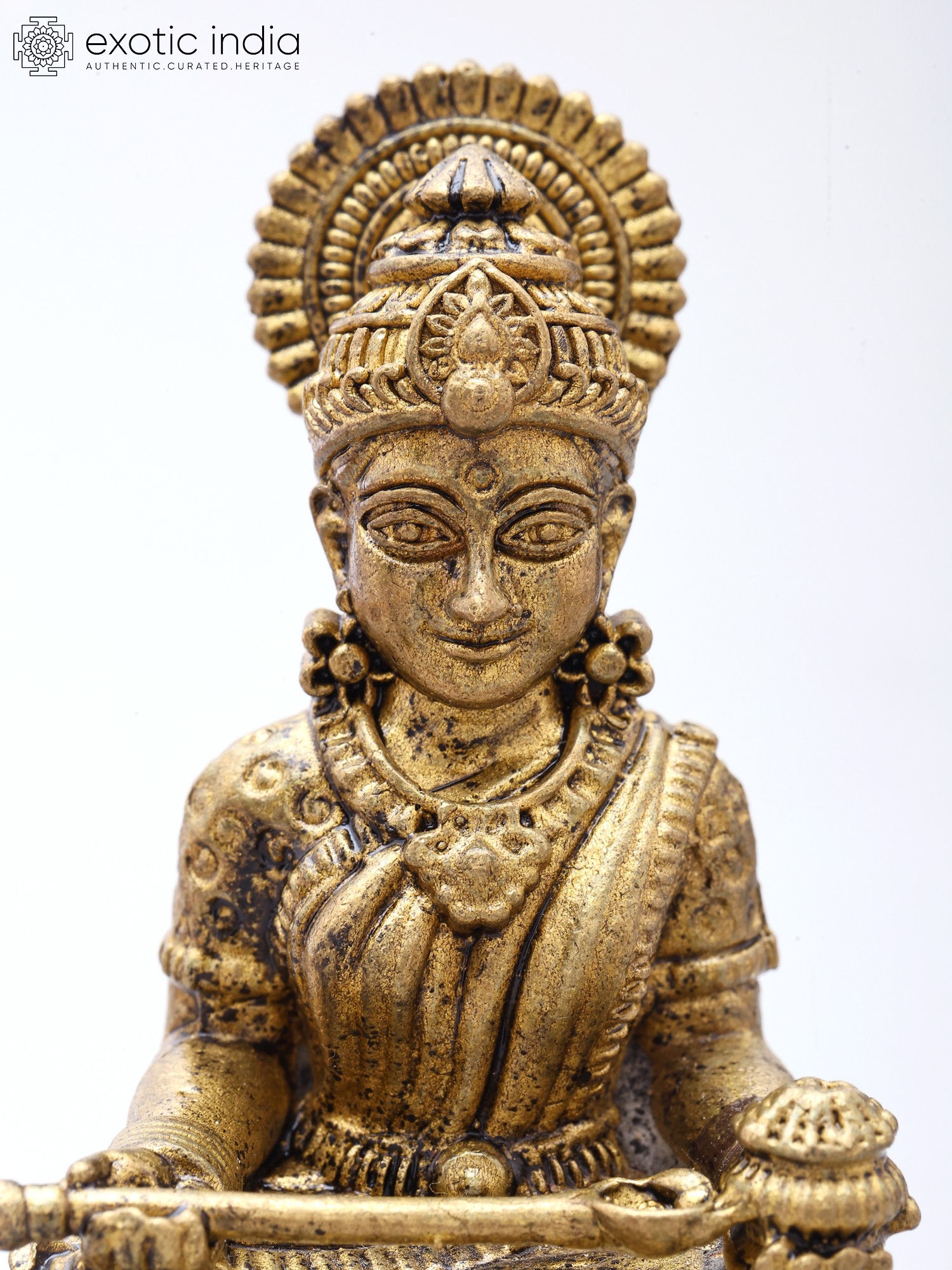 The seated posture of Annapurna signifies peace, abundance, and the steady flow of sustenance.