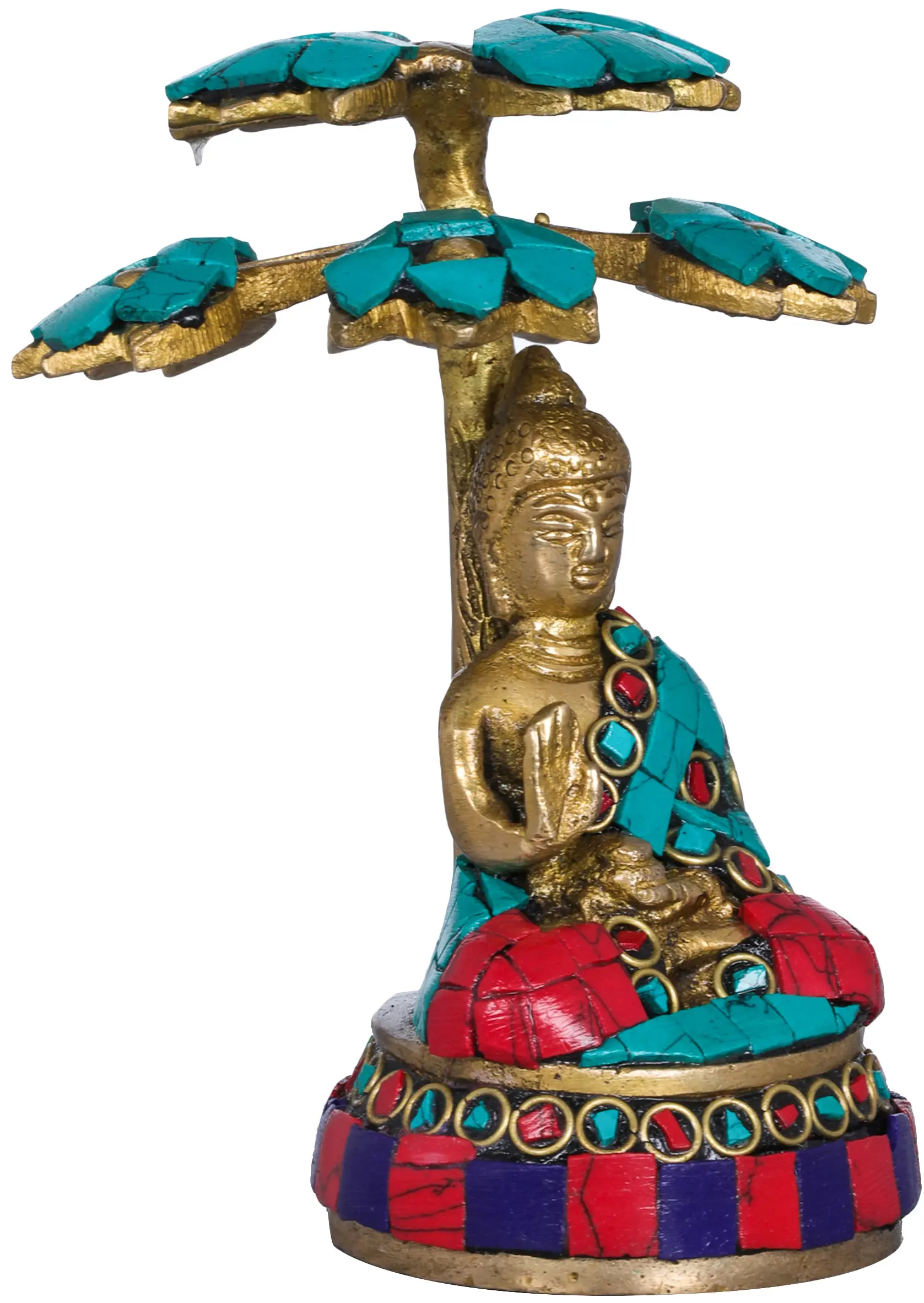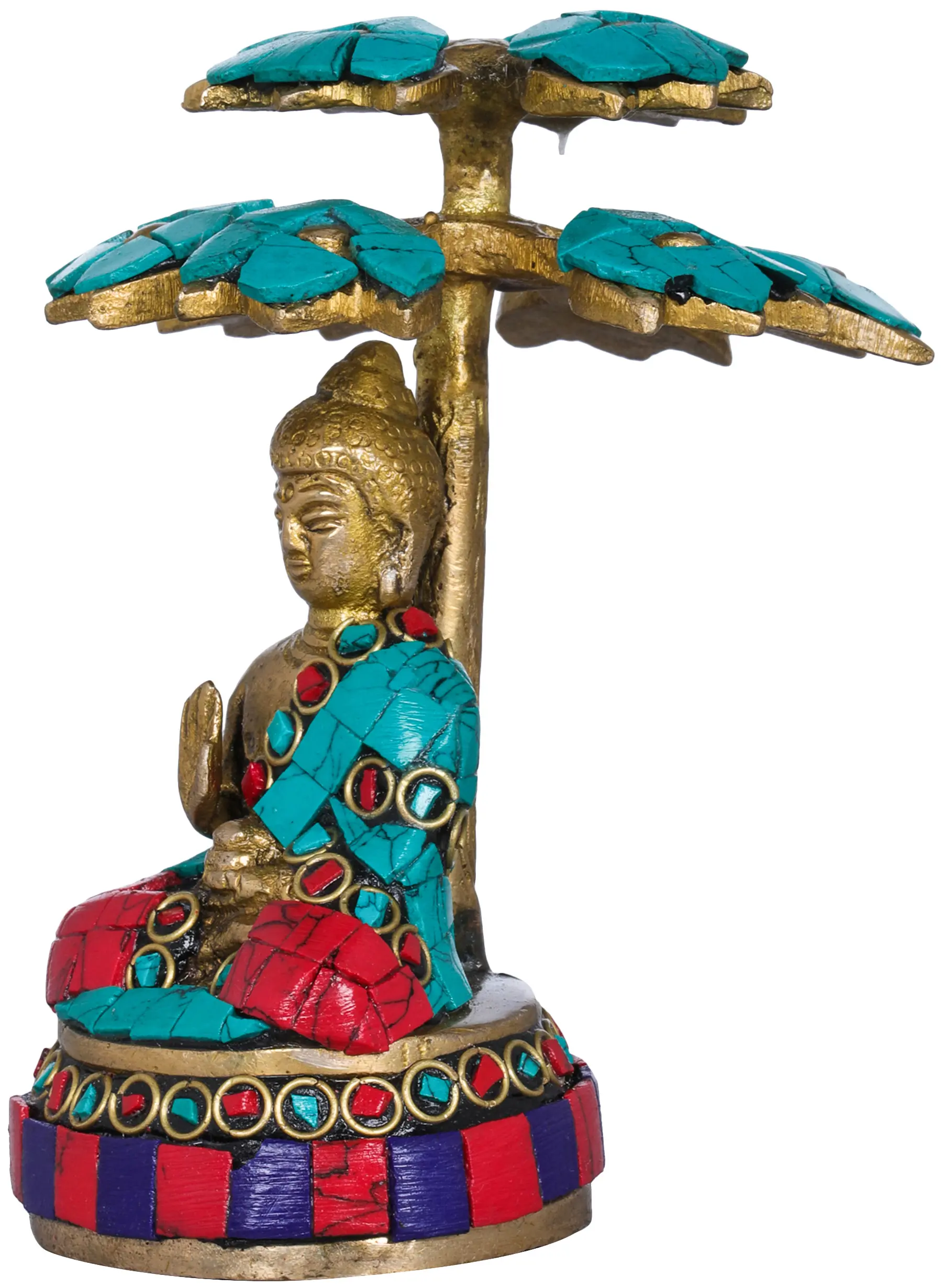 This piece is meticulously crafted from brass, a metal renowned for its durability and its ability to hold intricate detail. The skilled artisans have poured their dedication into every aspect of its creation, from the serene expression on the Buddha's face to the detailed rendering of the tree's branches and leaves. The inlay work is a testament to traditional craftsmanship, where small pieces of vibrant stones are carefully fitted and set into the brass to create a mosaic of color and texture. This technique, passed down through generations, imbues the statue with a unique character and a sense of enduring beauty. The compact size makes it an ideal addition to any sacred space, meditation altar, or as a thoughtful gift for those seeking spiritual inspiration.