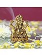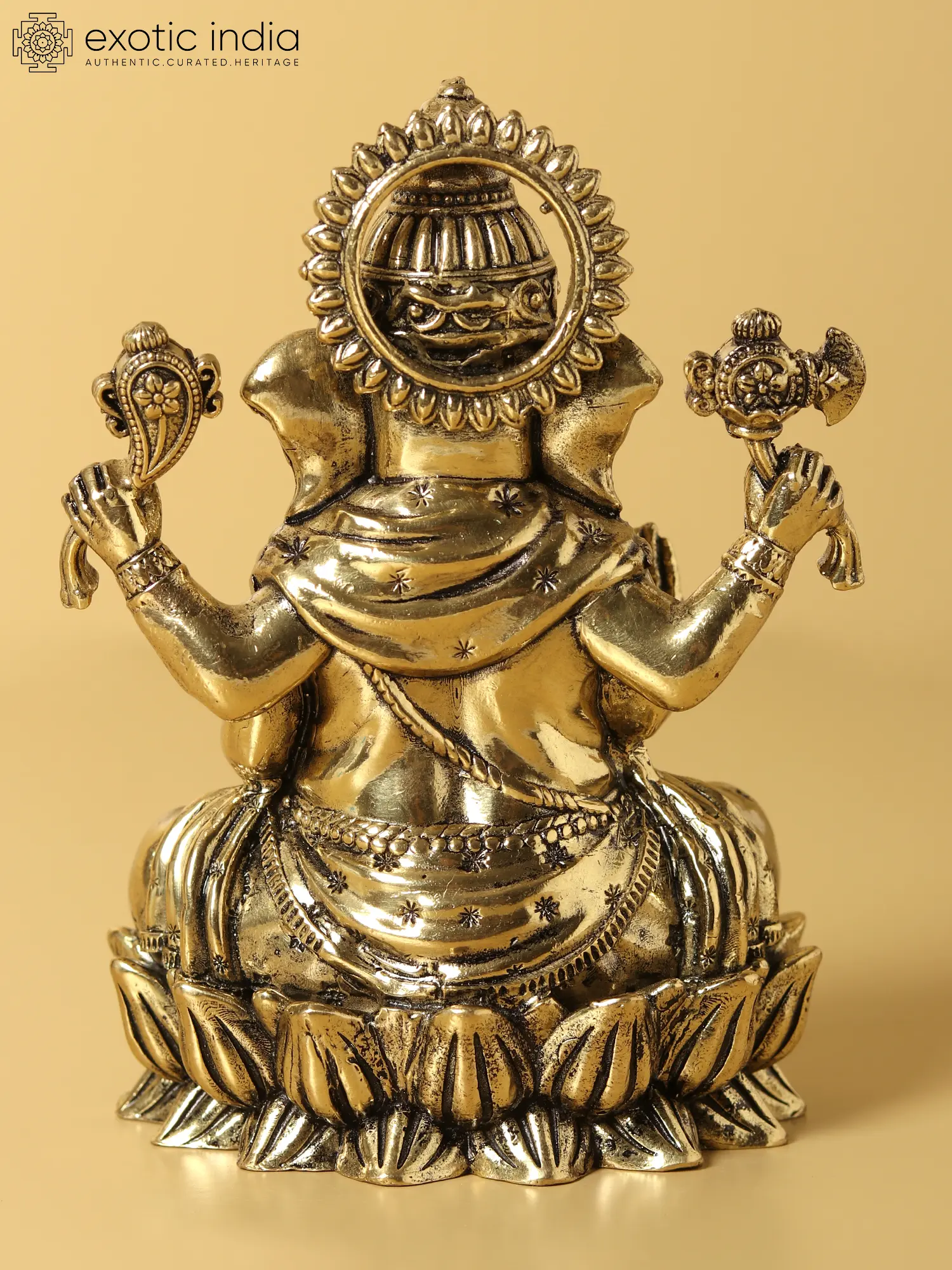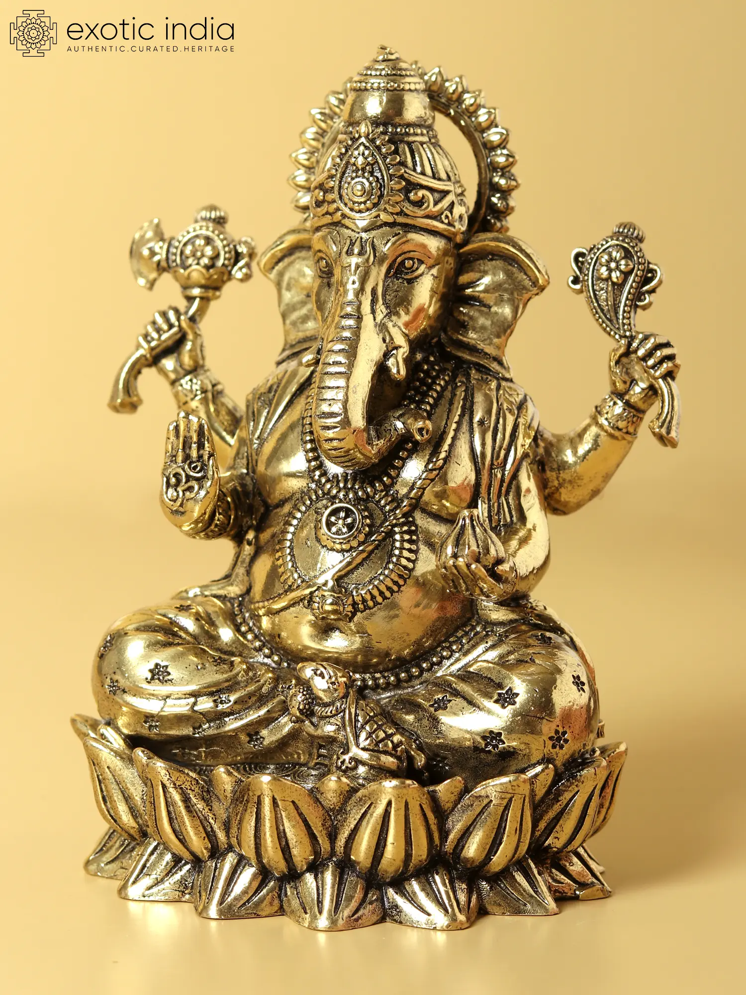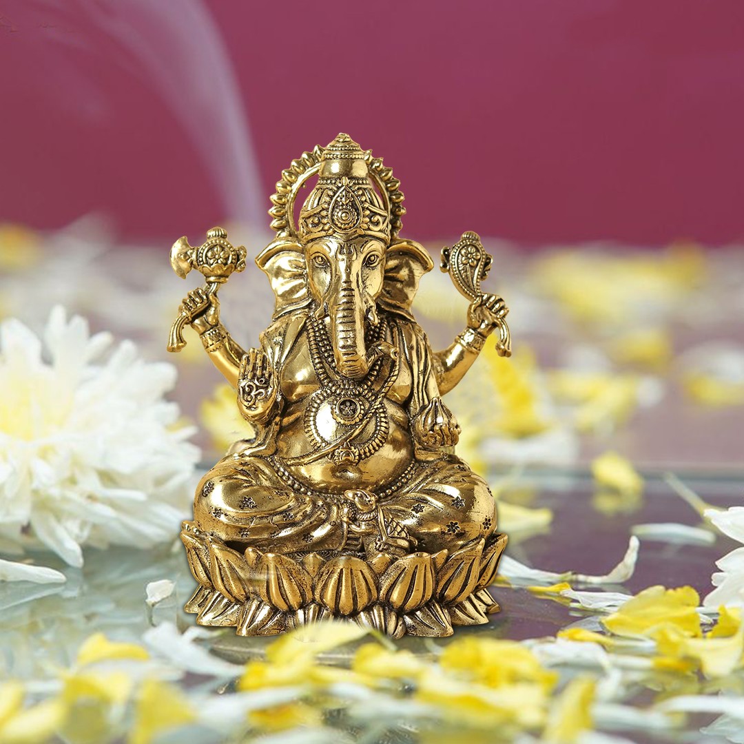 In the golden glow of divinity, this mesmerising brass statue stands tall, depicting “Chaturbhuja Lord Ganesha” seated on a celestial lotus. His four arms, a symphony of grace, weave a tale of blessings. The right hand, in “Ashirwad Mudra”, imparts a tranquil benediction, the symbol of “Aum” (OM) adorning the hand, echoing the cosmic resonance. Draped in regal attire, He embodies grandeur and sanctity.The upper hands cradle a goad and a noose, symbolic of his power to guide and bind, gently balancing his might with mercy. At his feet, his loyal vehicle, “Mushaka”, sits in humble reverence, offering prayers to the embodiment of wisdom and divine protection. This masterpiece captures the essence of Lord Ganesha’s majestic presence, radiating an aura of sacred serenity.