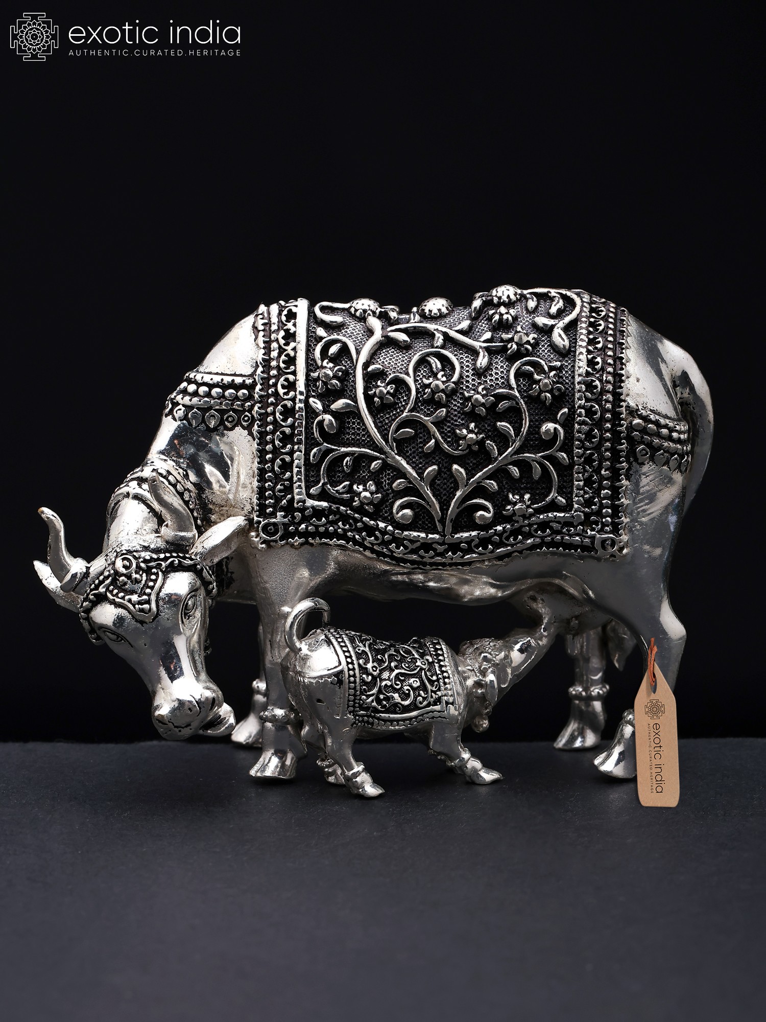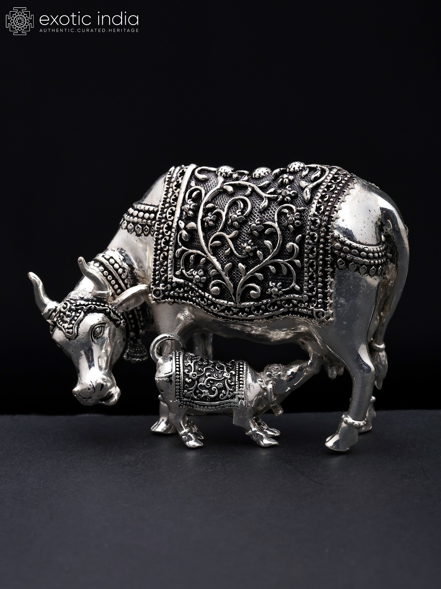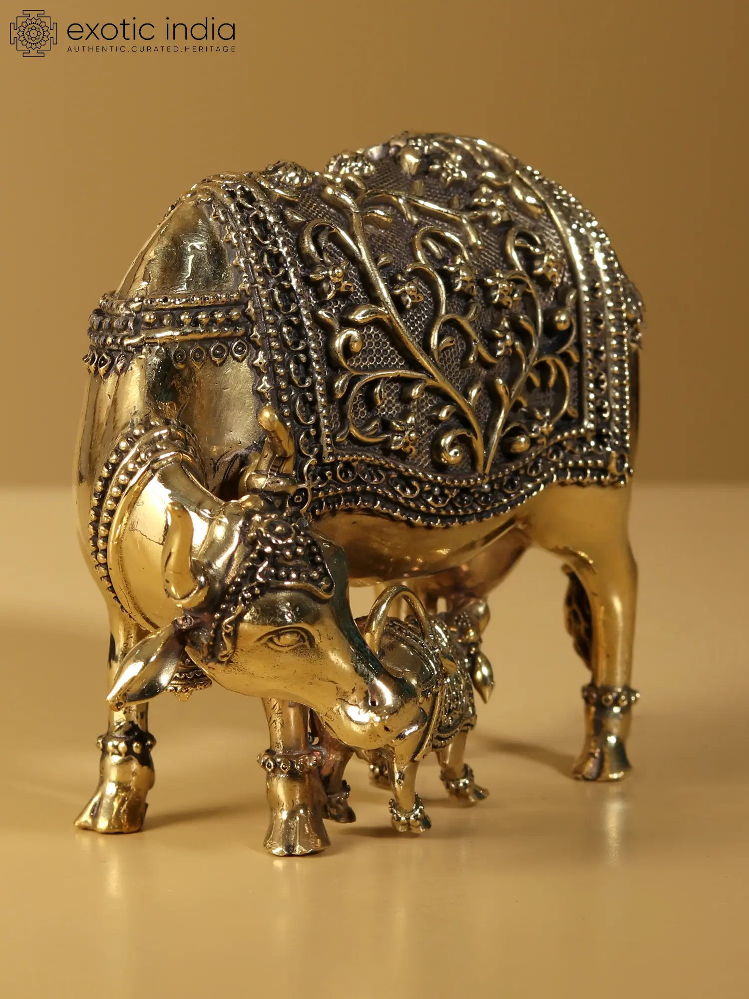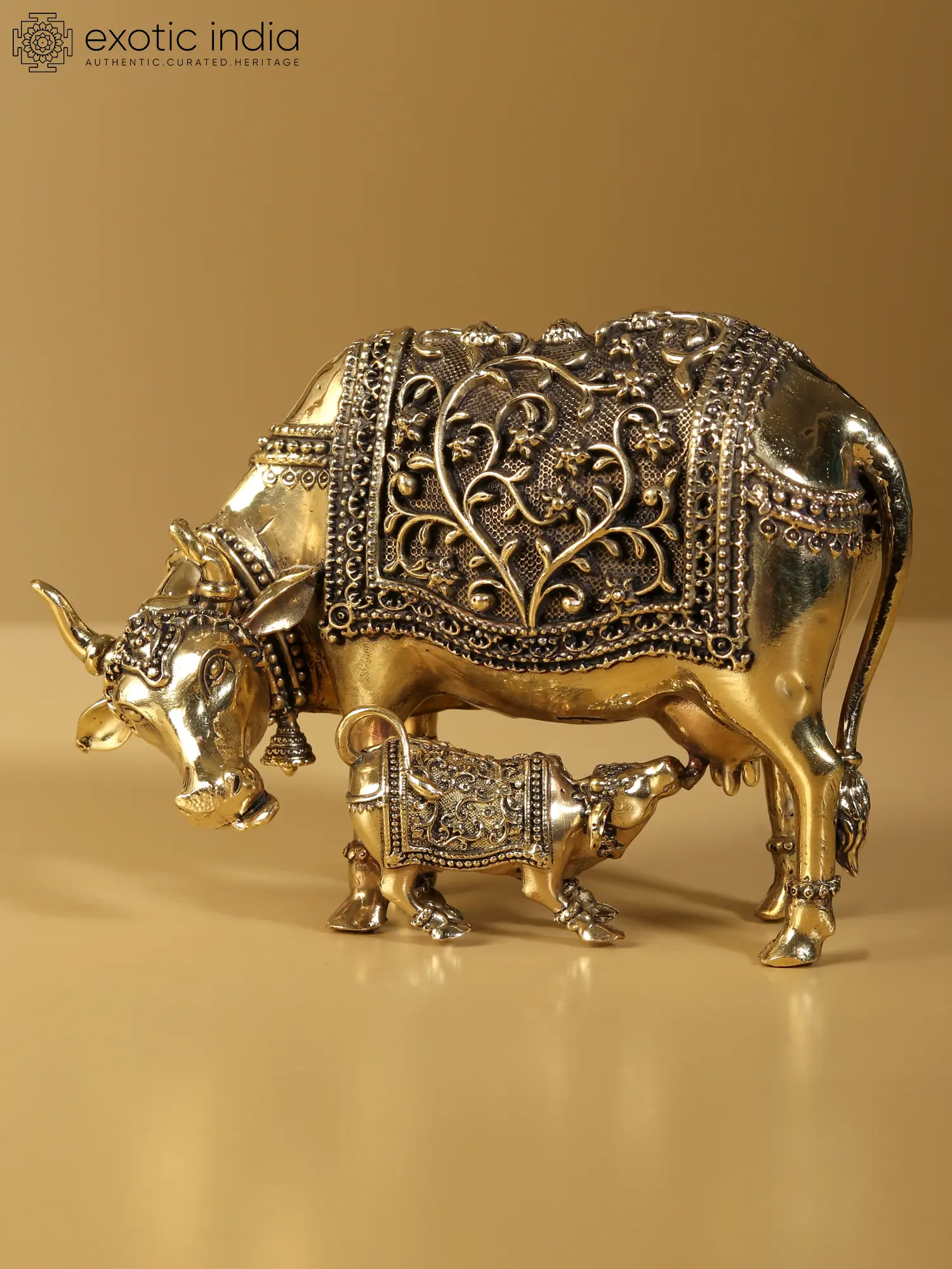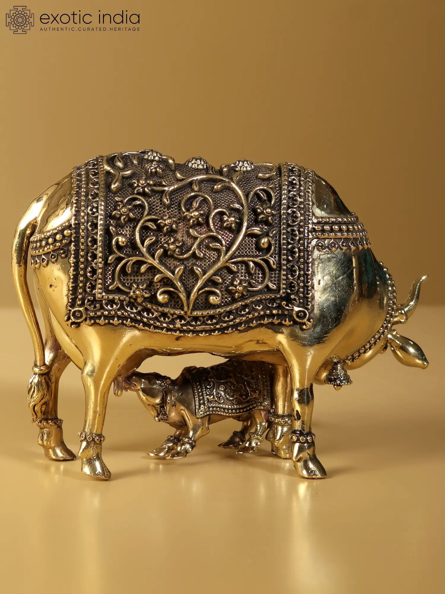 This Cow and Calf Brass Statue, available in multiple sizes is a tribute to the divine Kamdhenu cow. It carries sacred symbolism and allows the beholder to be blessed with the view of the motherly love of the nurturer. Meticulously crafted, this exquisite piece captures the sacred bond between the revered cow and her calf in fine brass detailing. The highlight of the statue is the cover cloth of both the cow and calf, which has been ornamented with beautiful vine designs. Each size radiates a sense of serenity and spiritual significance, making it a versatile addition to your home or altar. The intricacies in design reflect the artisan's devotion, while the symbolism of the cow as a symbol of nurturing and abundance adds a touch of divine grace.