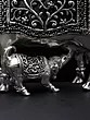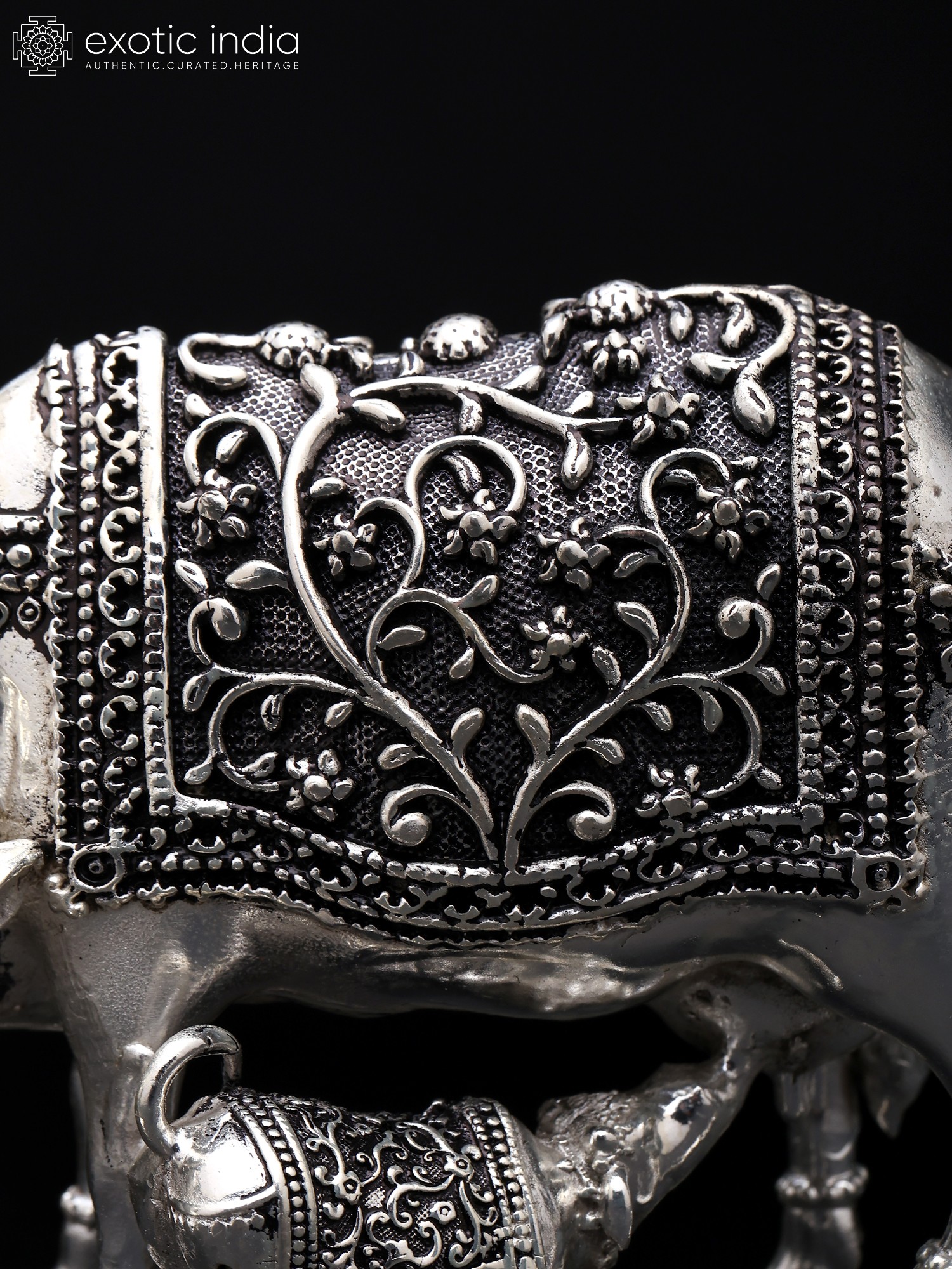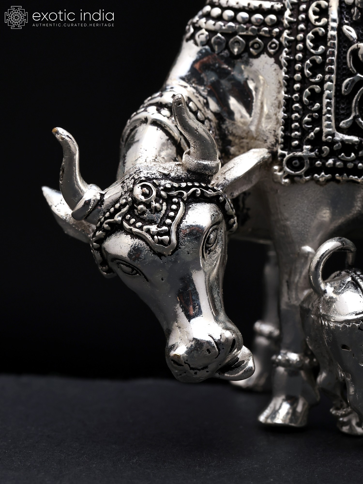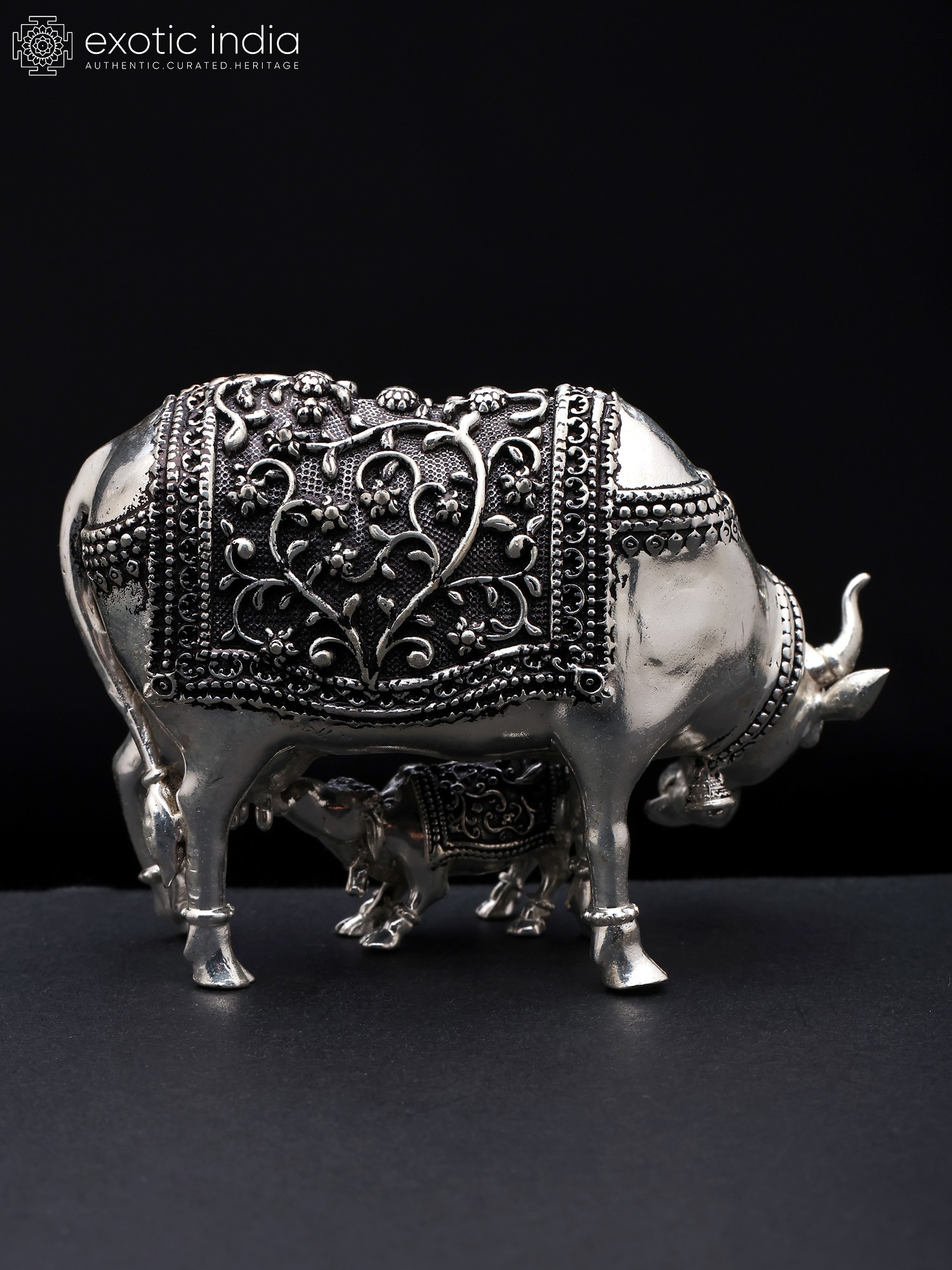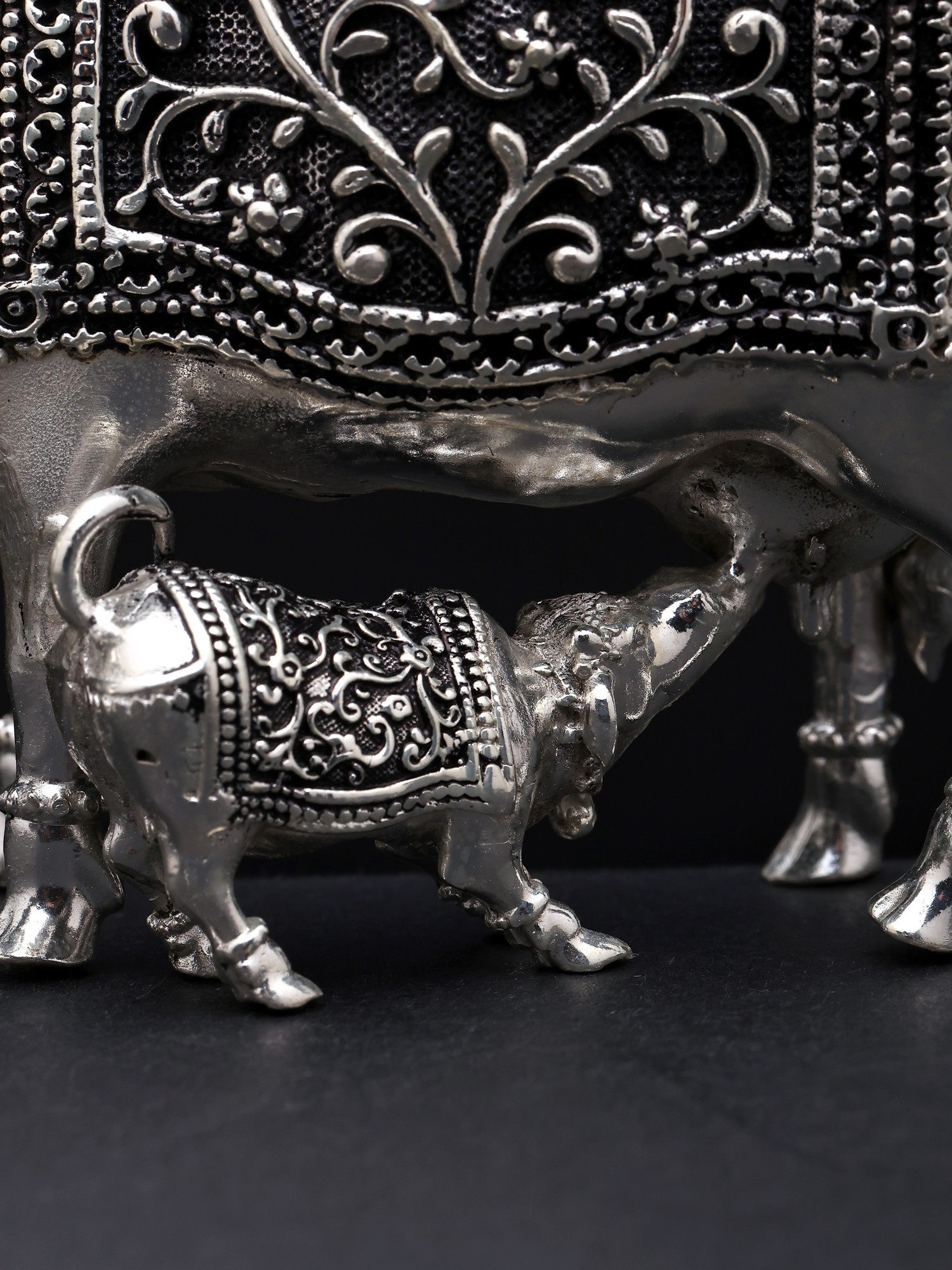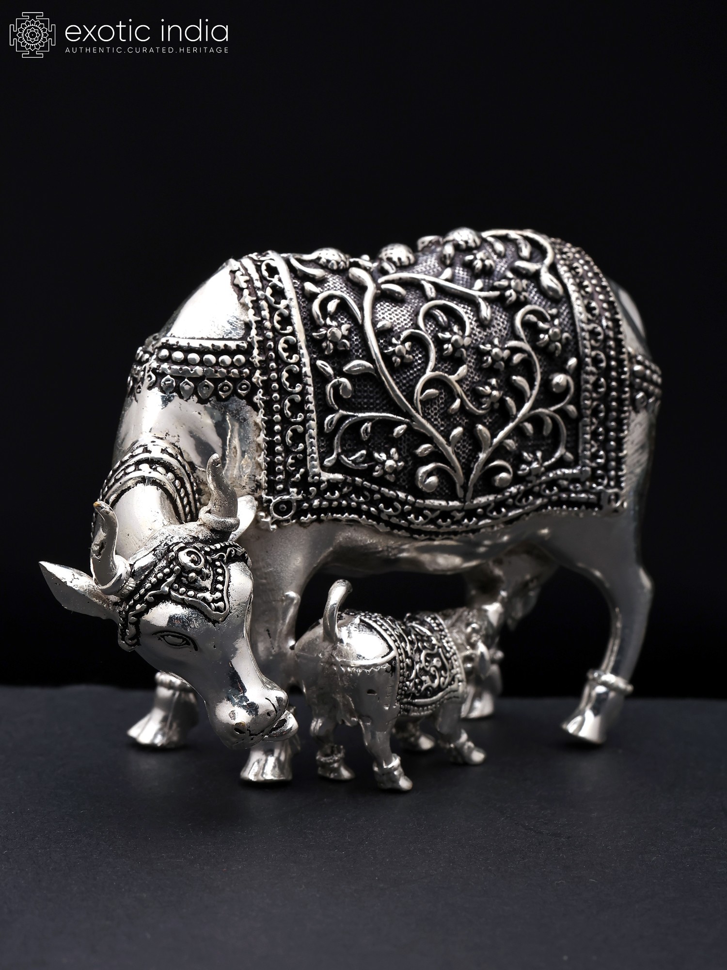 This Cow and Calf Brass Statue, available in multiple sizes is a tribute to the divine Kamdhenu cow. It carries sacred symbolism and allows the beholder to be blessed with the view of the motherly love of the nurturer. Meticulously crafted, this exquisite piece captures the sacred bond between the revered cow and her calf in fine brass detailing. The highlight of the statue is the cover cloth of both the cow and calf, which has been ornamented with beautiful vine designs. Each size radiates a sense of serenity and spiritual significance, making it a versatile addition to your home or altar. The intricacies in design reflect the artisan's devotion, while the symbolism of the cow as a symbol of nurturing and abundance adds a touch of divine grace.