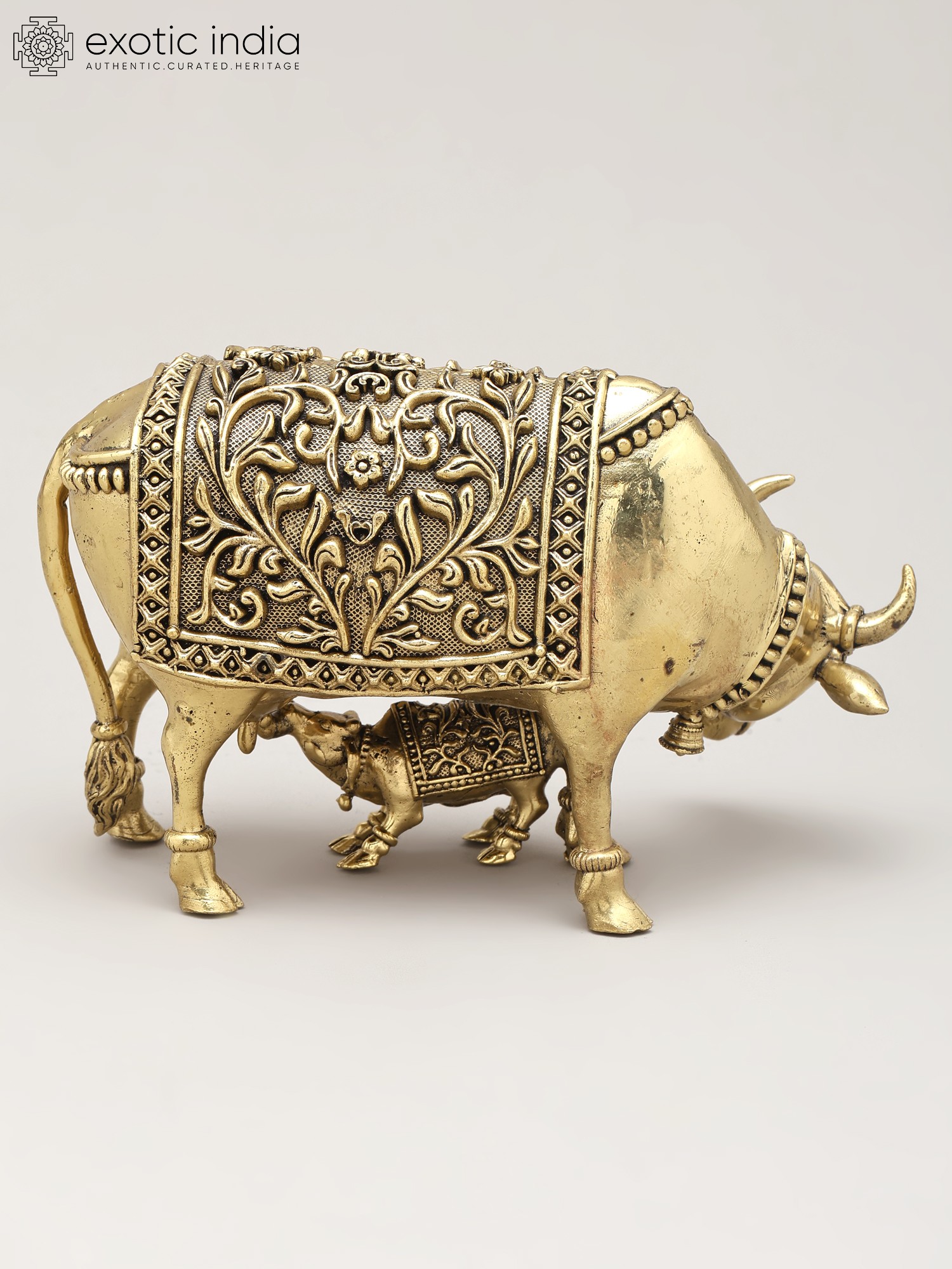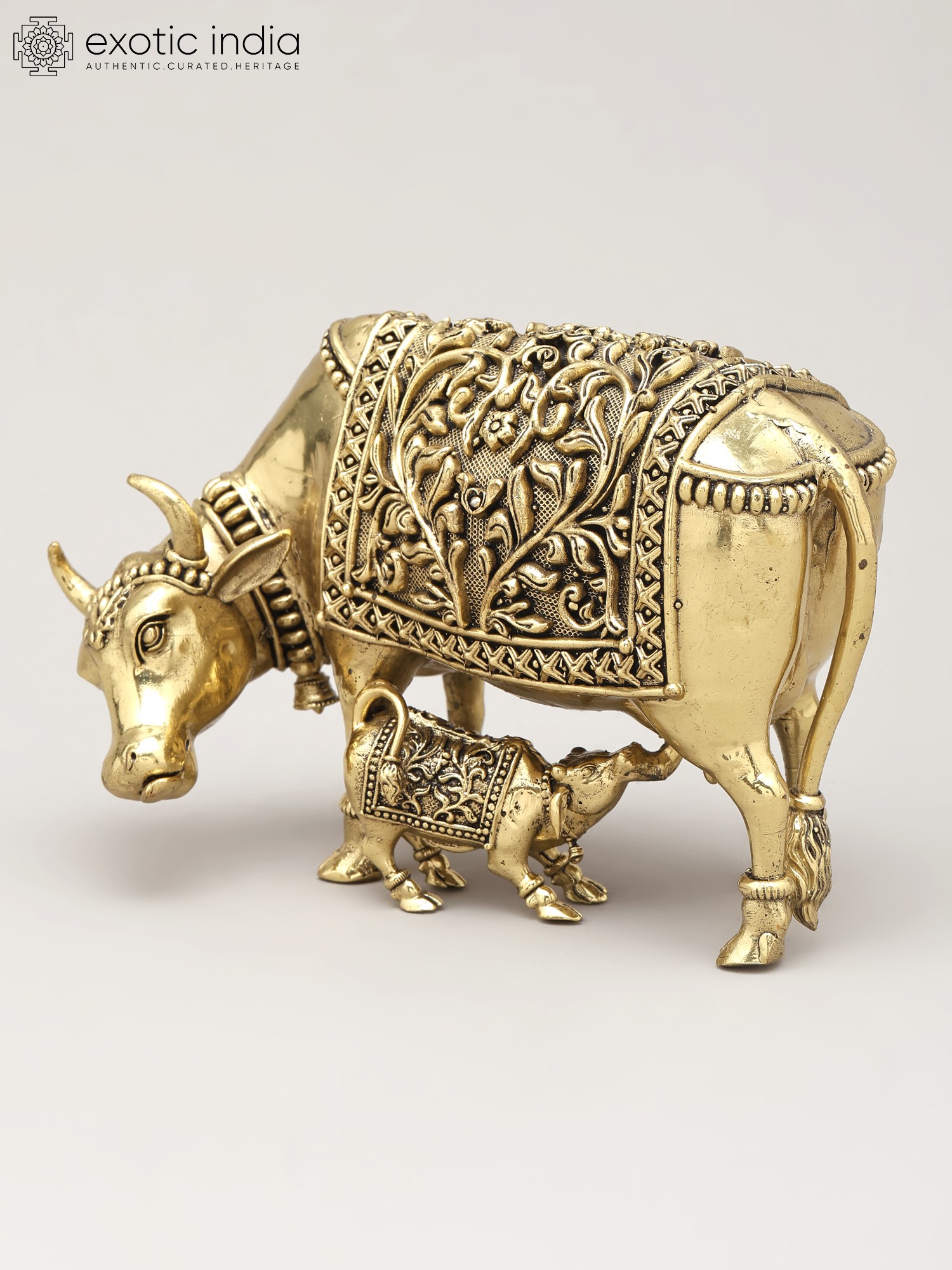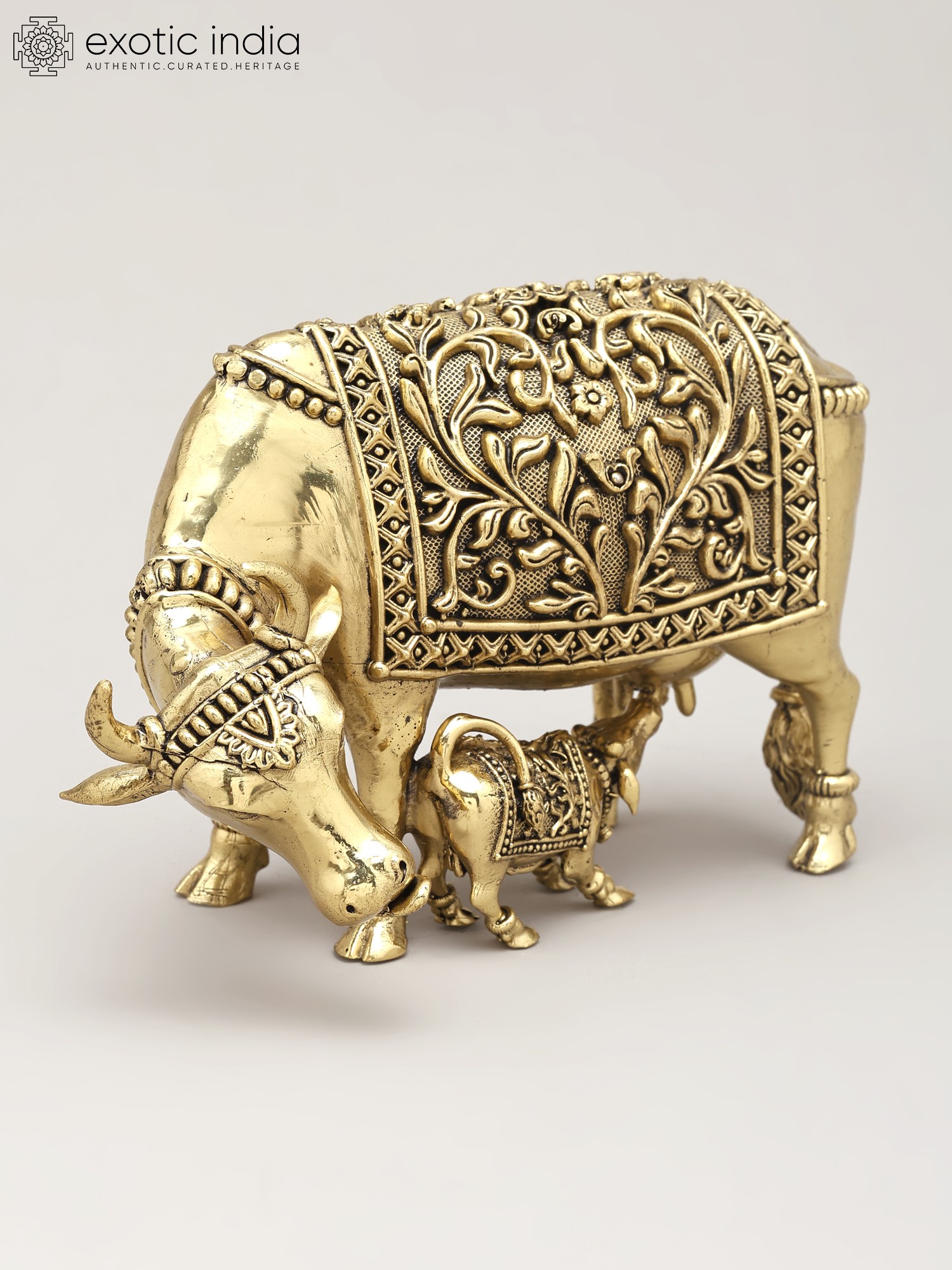 6" Small Superfine Cow and Calf with Ganesha Lakshmi Carving | Brass Statue with Inlay Work