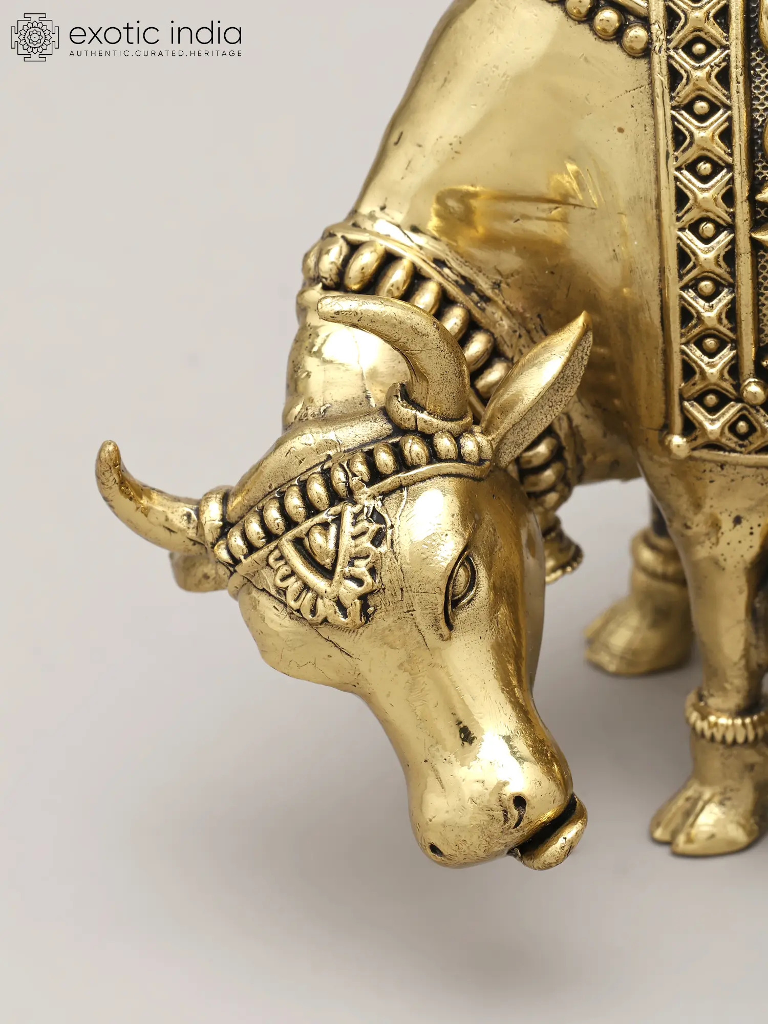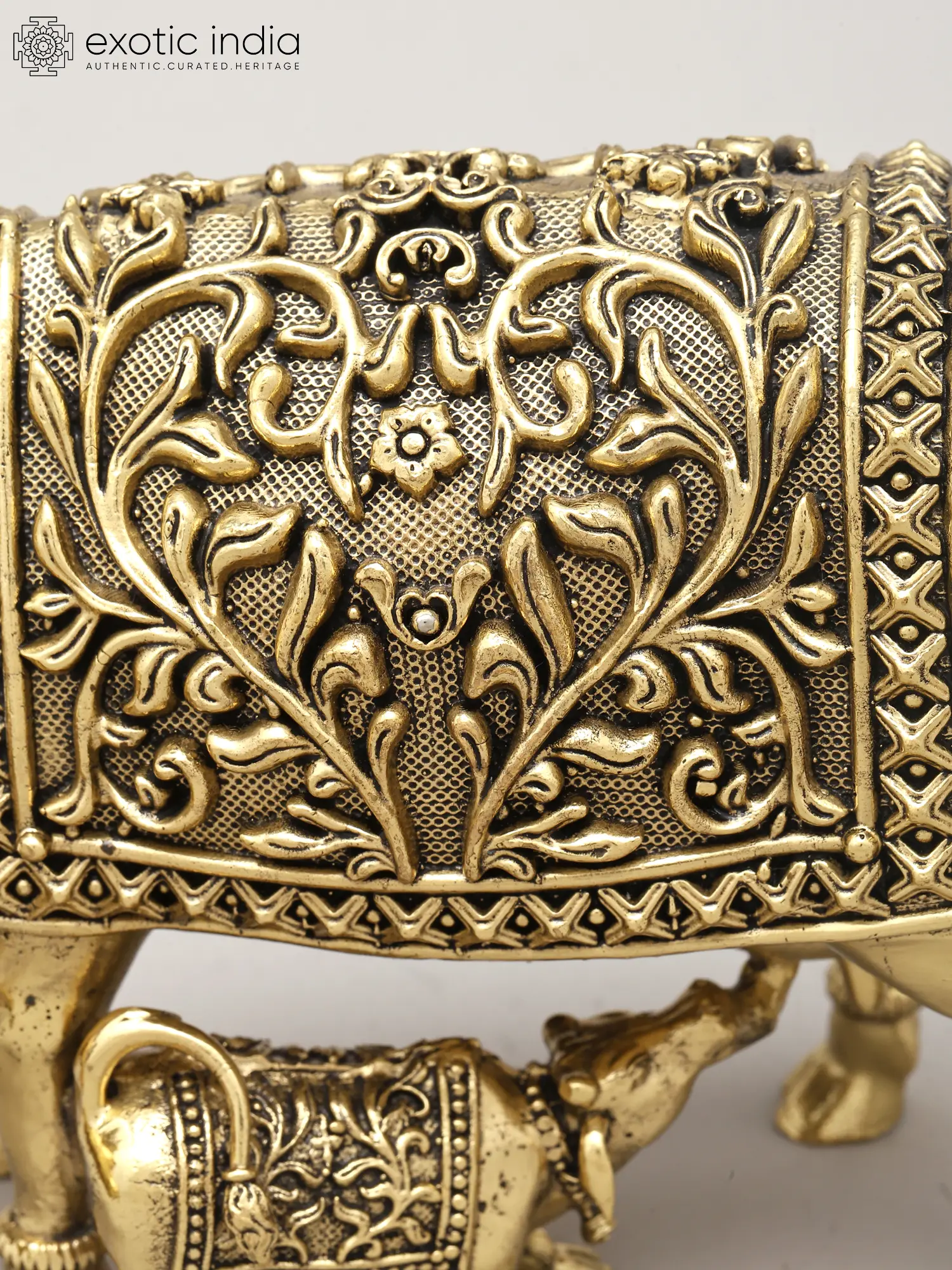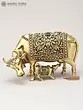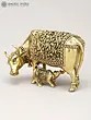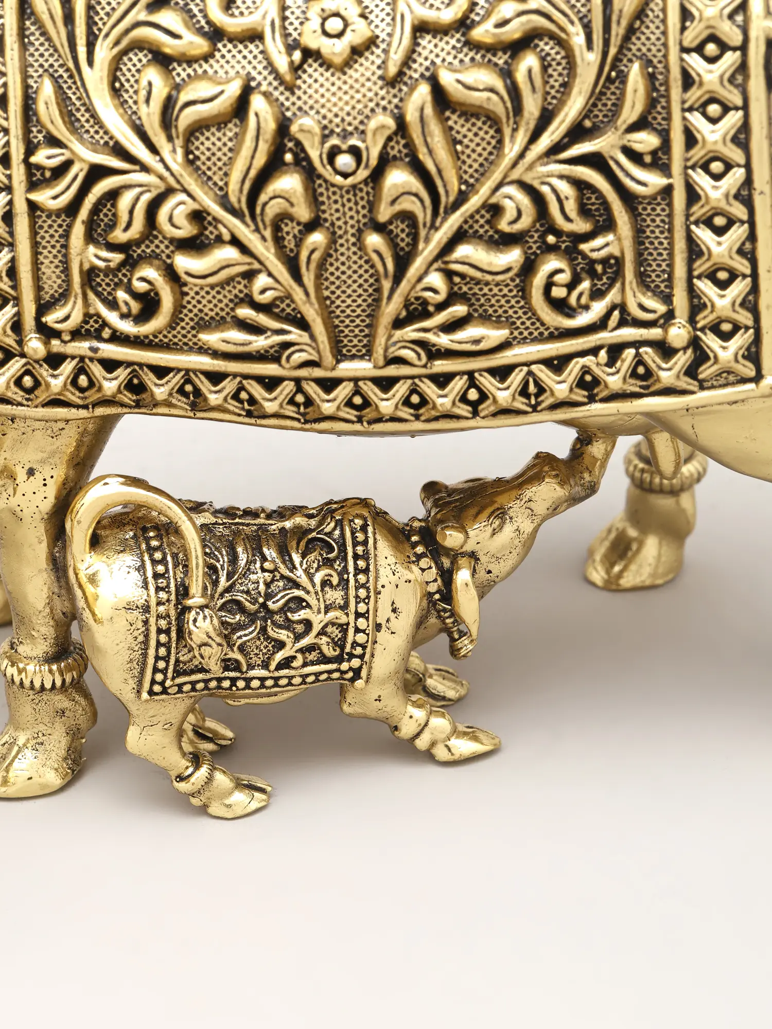 6" Small Superfine Cow and Calf with Ganesha Lakshmi Carving | Brass Statue with Inlay Work