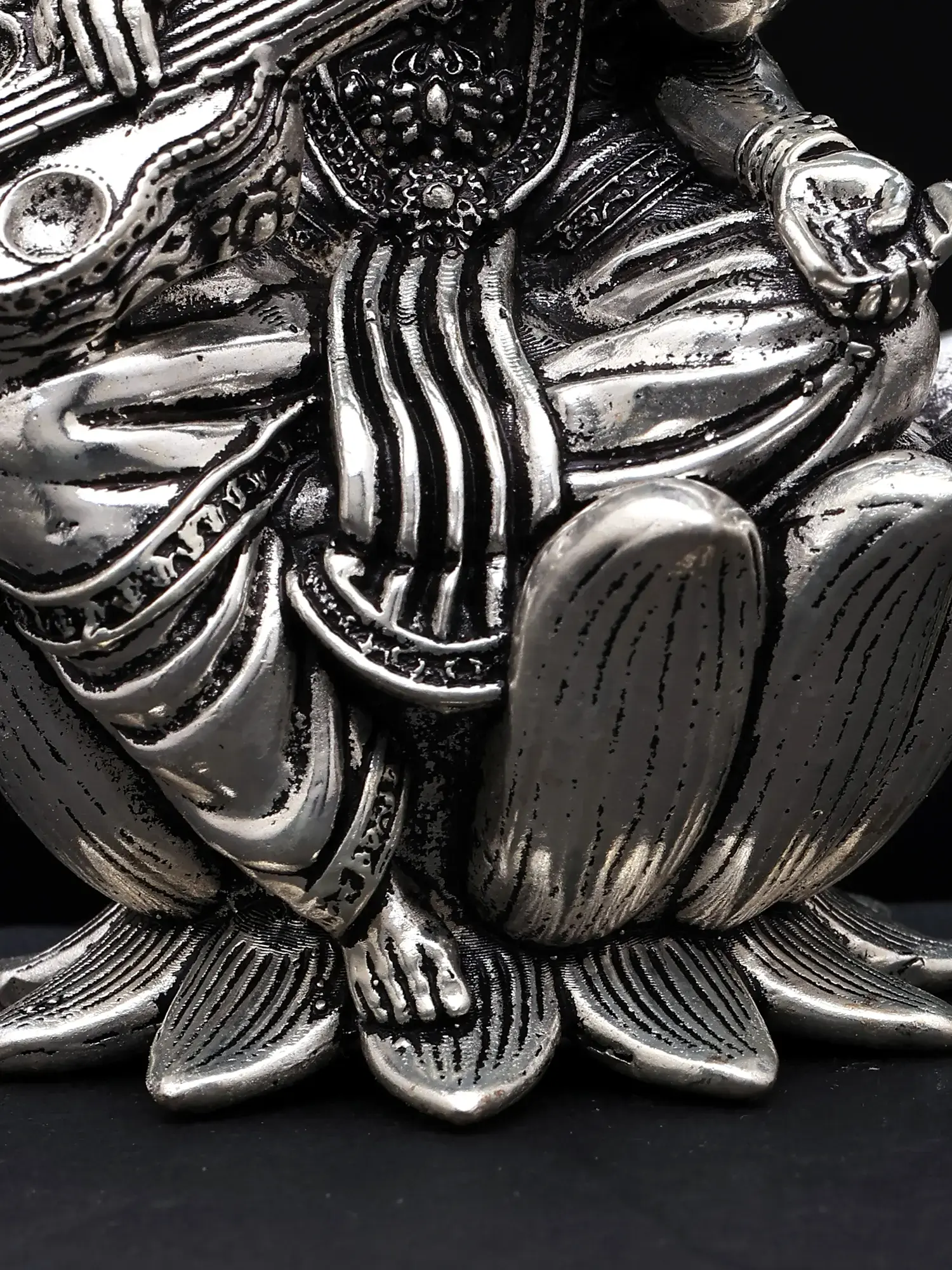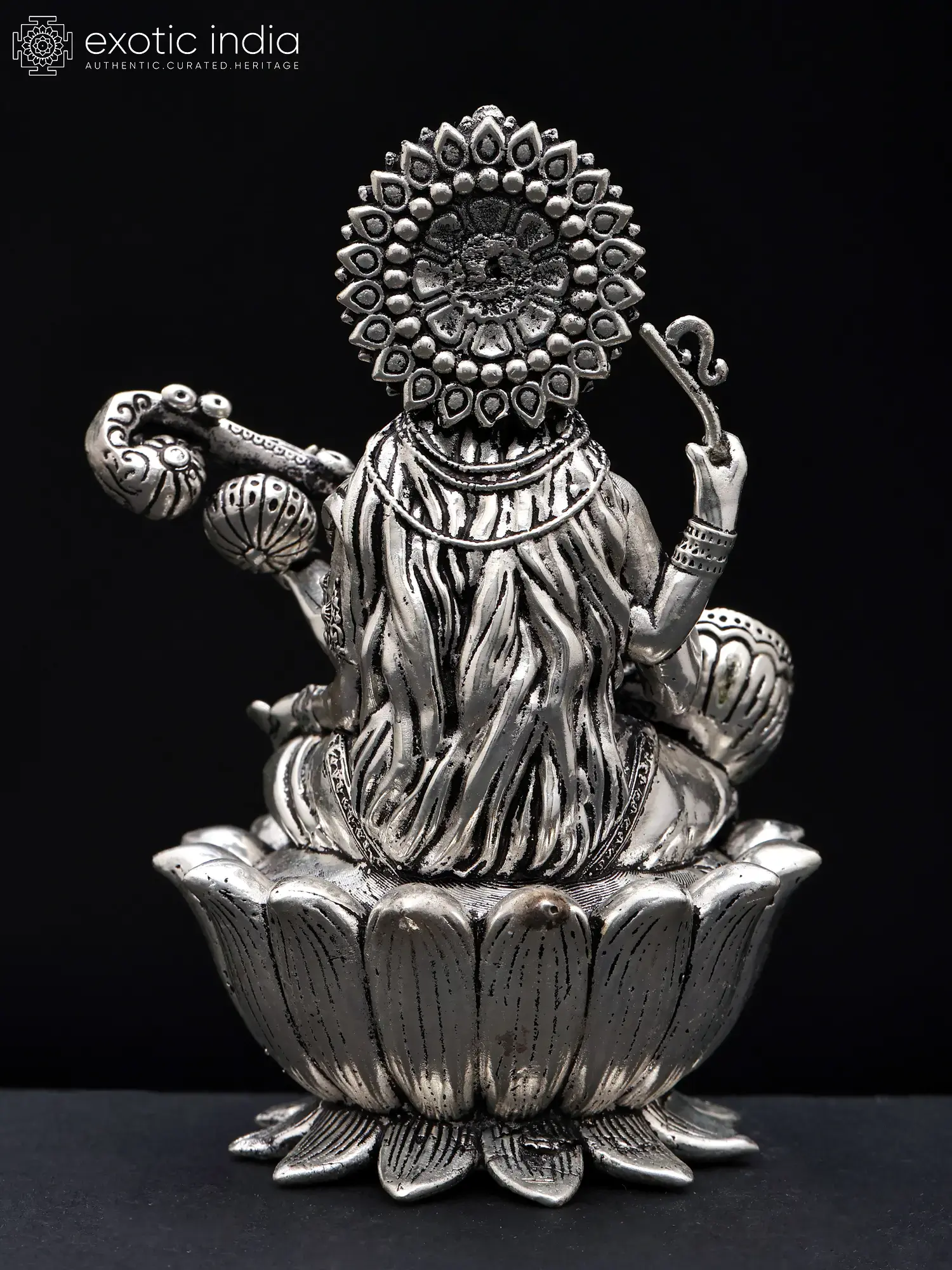 4" Small Superfine Goddess Saraswati Seated on Lotus | Silver Plated Brass Statue