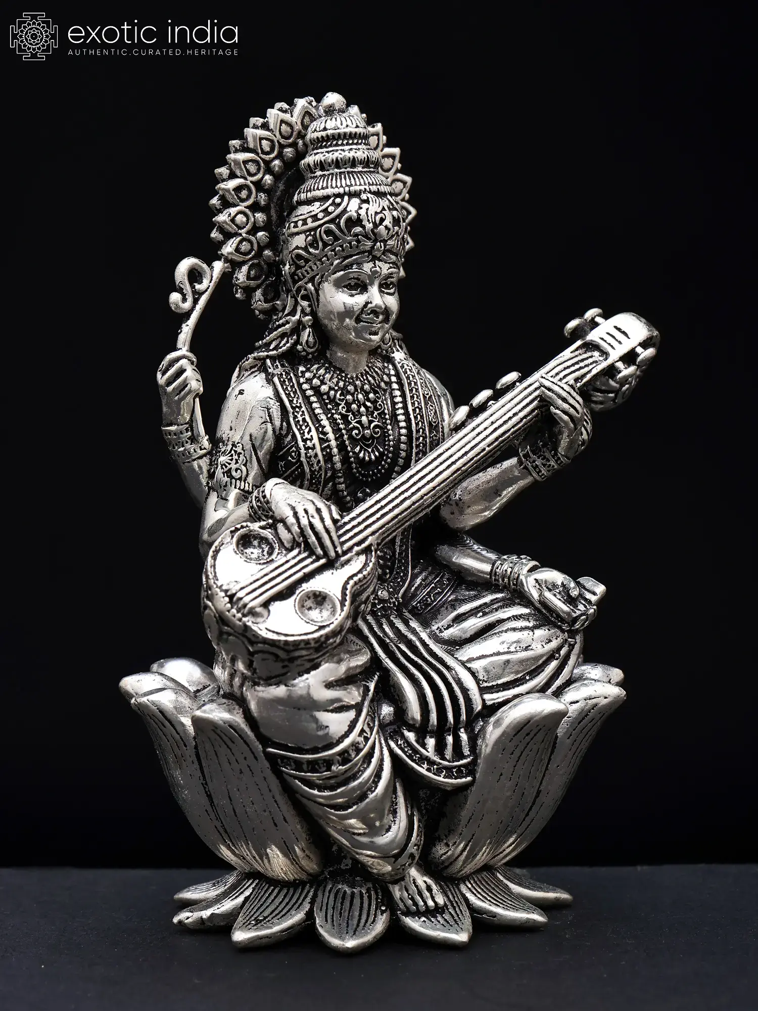 6" Small Superfine Devi Saraswati Seated on Lotus | Silver Plated Brass Statue