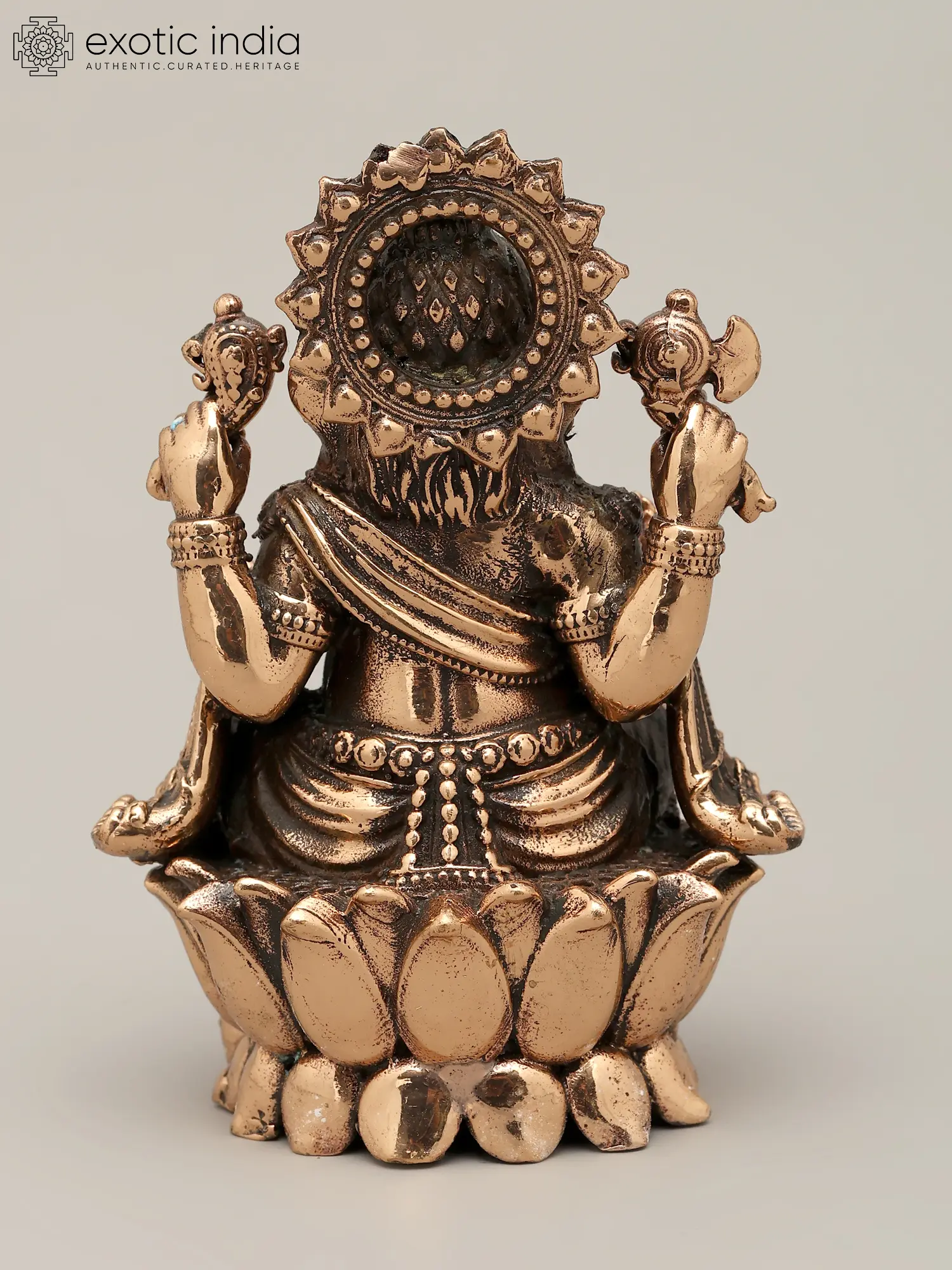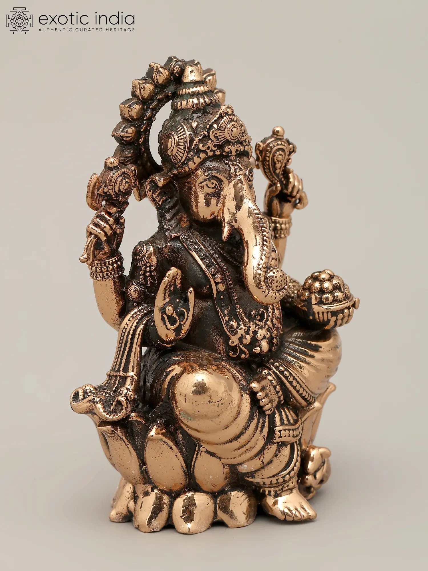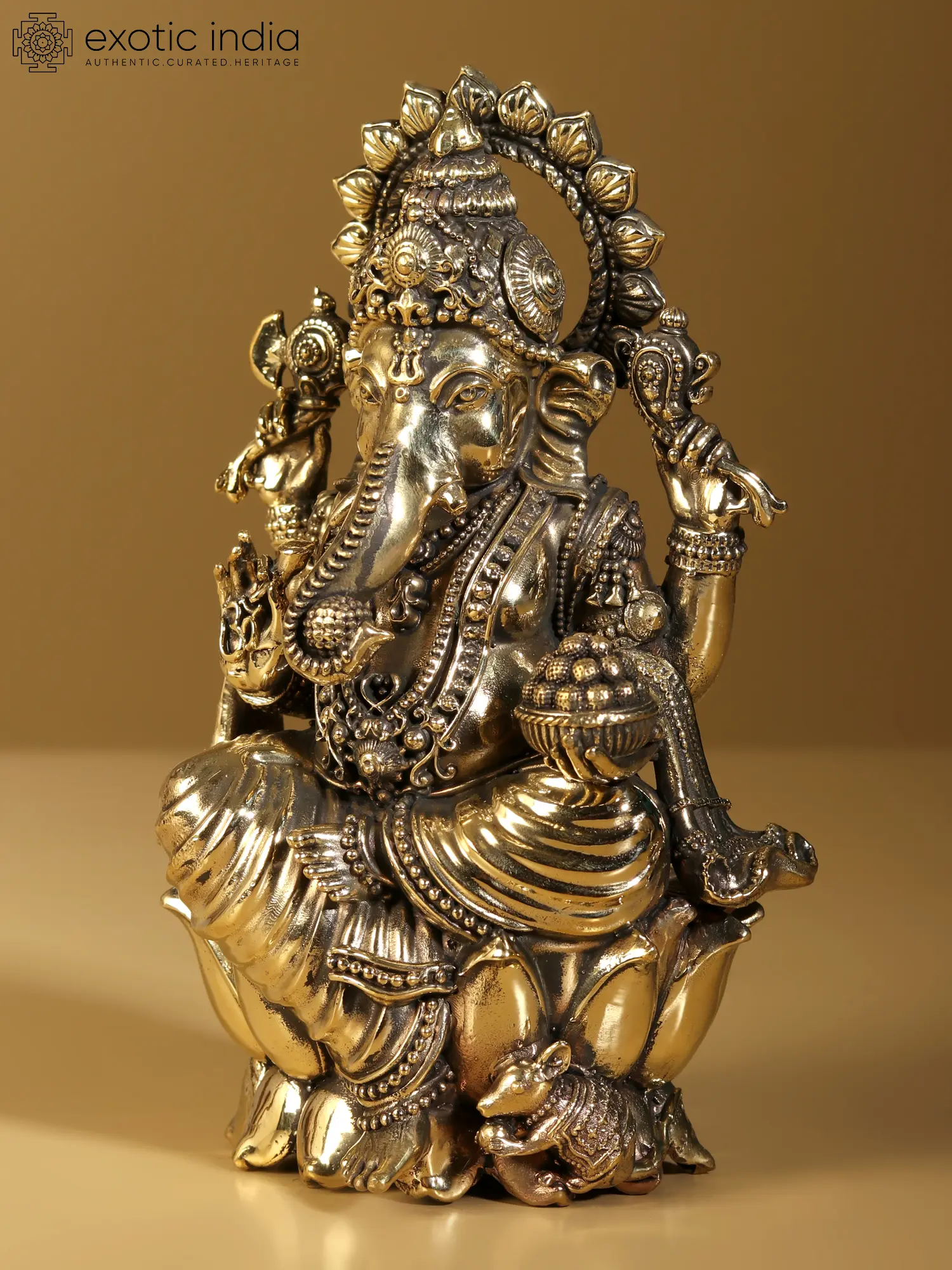 A perfect idol for your Puja temple, this superfine brass icon is dedicated to Chaturbhuja Ganesha, the Lord of auspiciousness.